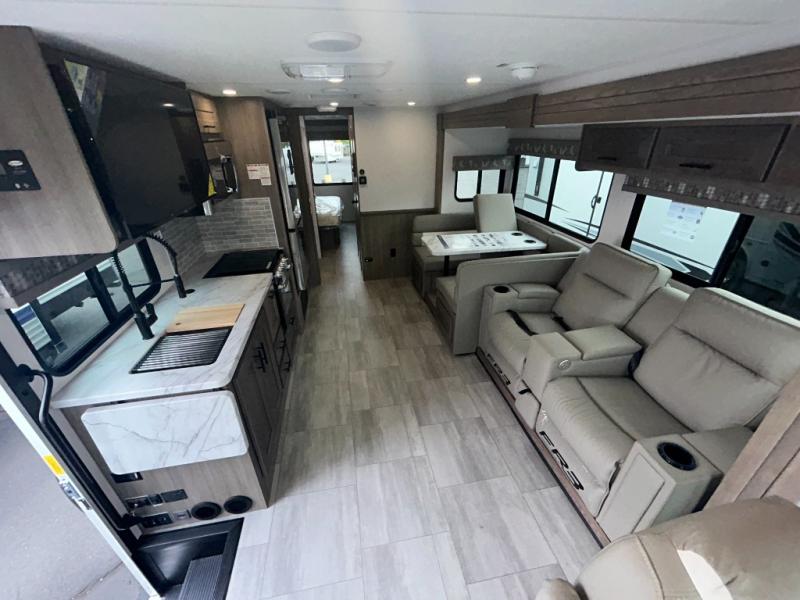 With each FR3 Class A gas motorhome by Forest River, you will find an easy-to-drive coach with a spacious interior allowing you to gather with friends and family with convenience and style found throughout! Each is built with vacuum-bonded construction, a one-piece fiberglass roof with extended rain spouts, a steel firewall and A-pillar extension, Bi-LED headlamps and lower LED fog lights, and grey Rotocast storage boxes with drains. Inside, you will enjoy black hardware, appliances, plumbing fixtures, and a glass shower door frame. You will also find a stainless steel kitchen sink with a bamboo cutting board and roll-up dryer, heavy-duty full-extension ball bearing drawer guides, dual-access dinette storage with doors, and nightstands with charging stations to keep your cellphones ready for whatever is next. Make your selection today!