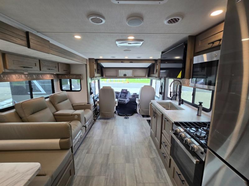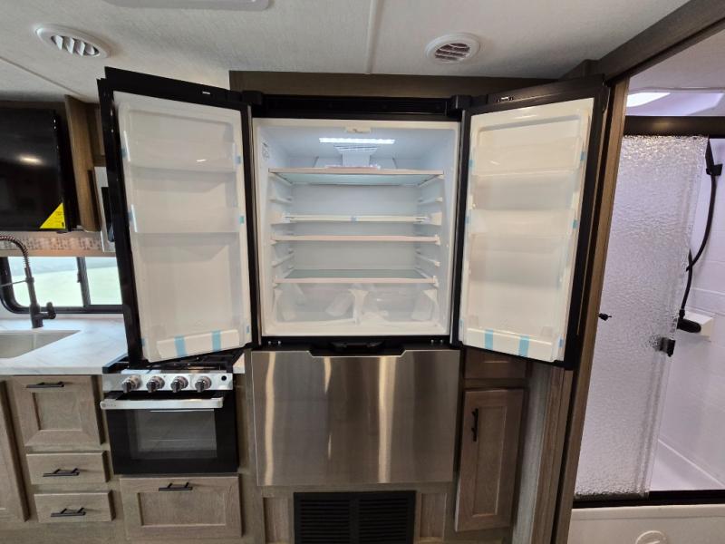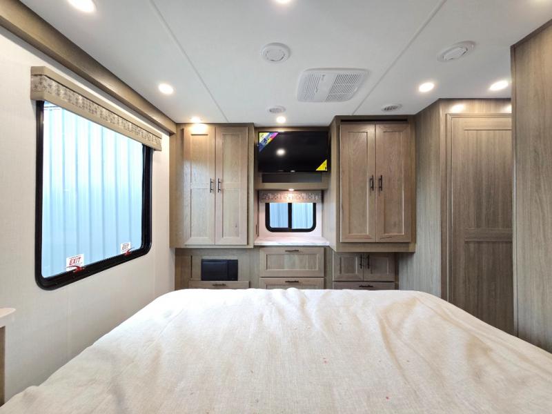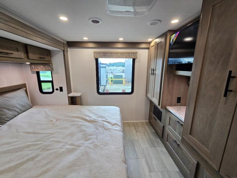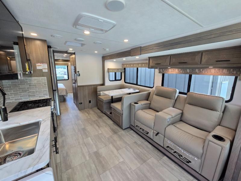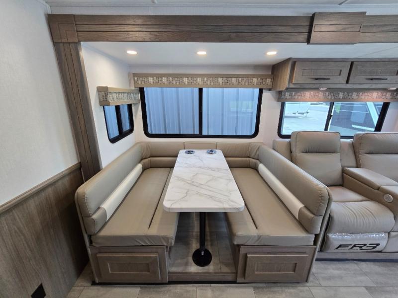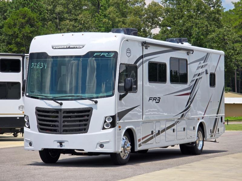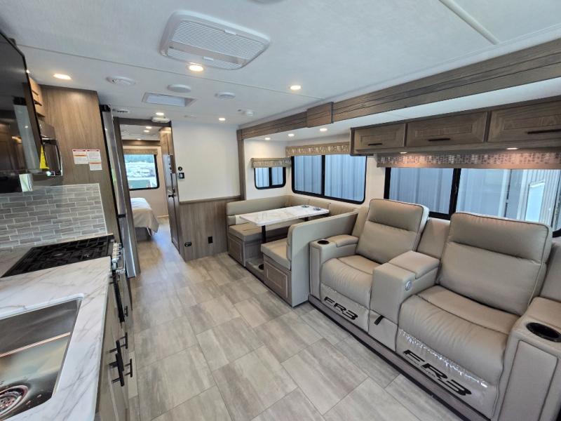 With each FR3 Class A gas motorhome by Forest River, you will find an easy-to-drive coach with a spacious interior allowing you to gather with friends and family with convenience and style found throughout! Each is built with vacuum-bonded construction, a one-piece fiberglass roof with extended rain spouts, a steel firewall and A-pillar extension, Bi-LED headlamps and lower LED fog lights, and grey Rotocast storage boxes with drains. Inside, you will enjoy black hardware, appliances, plumbing fixtures, and a glass shower door frame. You will also find a stainless steel kitchen sink with a bamboo cutting board and roll-up dryer, heavy-duty full-extension ball bearing drawer guides, dual-access dinette storage with doors, and nightstands with charging stations to keep your cellphones ready for whatever is next. Make your selection today!