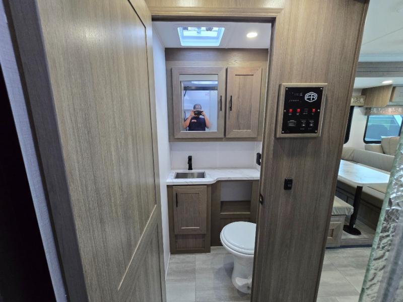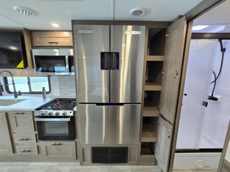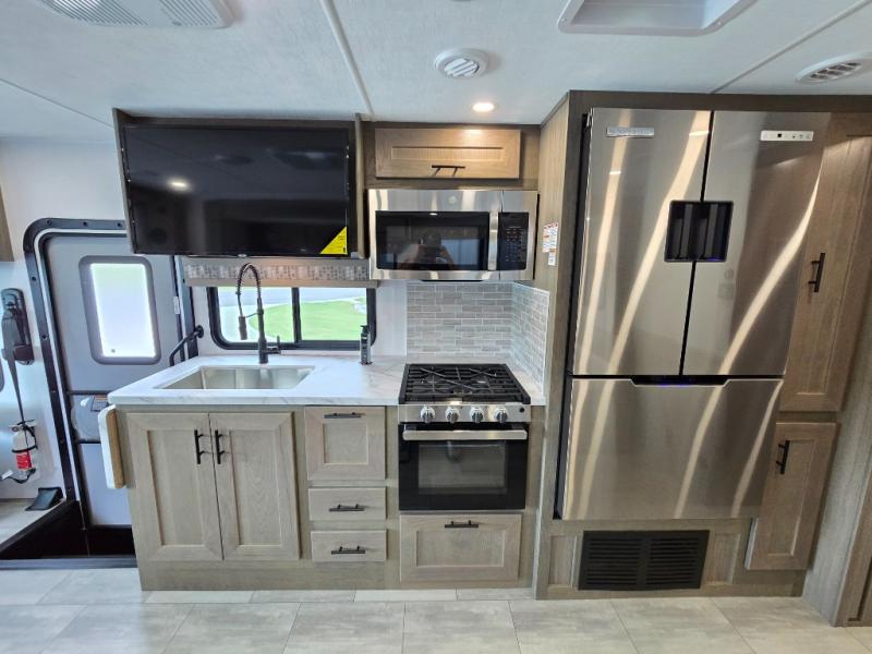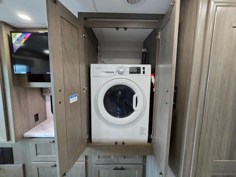 Whether you travel with your spouse, grandkids or friends, this FR3 Class A gas motorhome allows you to travel in style with plenty of additional sleeping choices from the power overhead bunk to the furniture once they are set up at night. You can dine at the wrap-around booth dinette, relax on the hide-a-bed sofa, and make full meals in the kitchen which also includes a residential microwave and countertop extension. The separated bathroom allows someone to take a shower while another freshens up with the private sink and toilet, or maybe you decide to close this area off within the bedroom. Every night you can sleep like a king while watching the 32" LED 12V TV in the bedroom, and maybe you decided to add the washer/dryer option to keep everything clean while on the road.