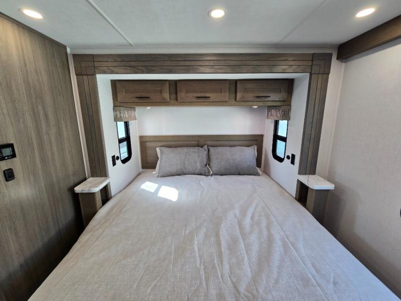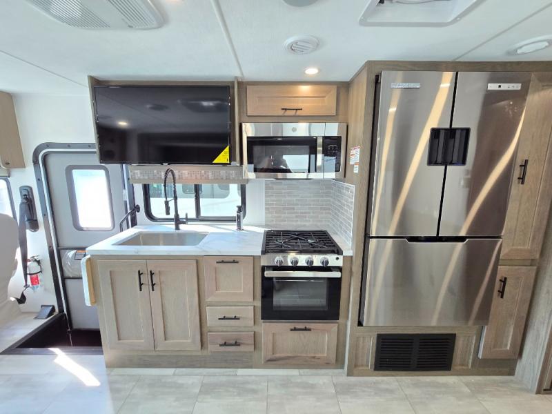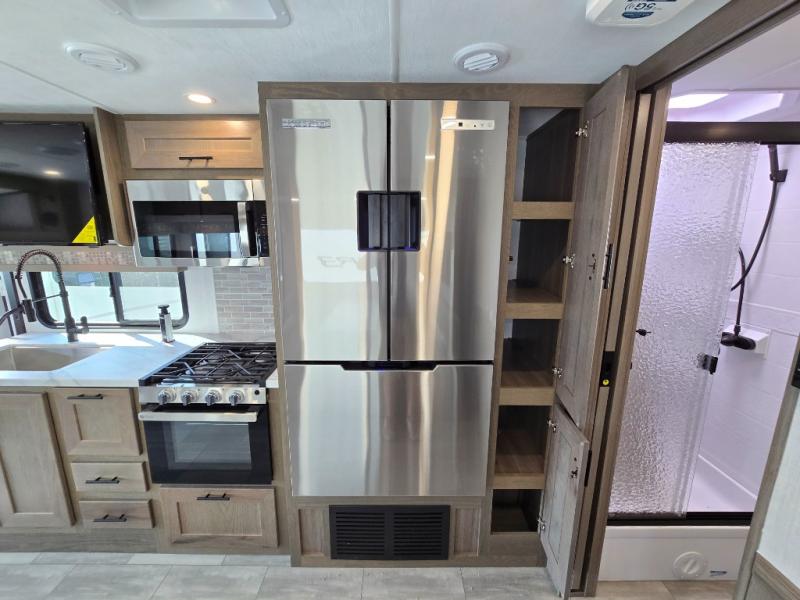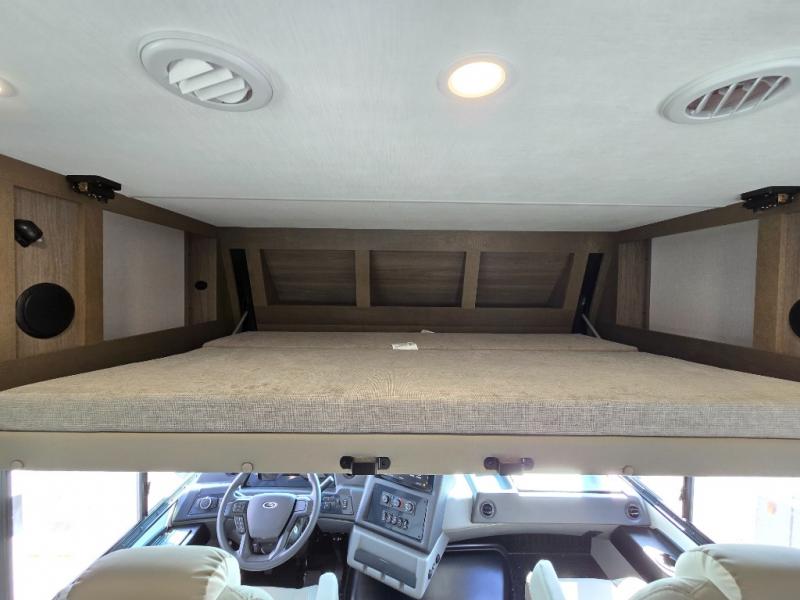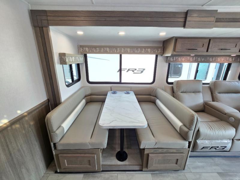 Whether you travel with your spouse, grandkids or friends, this FR3 Class A gas motorhome allows you to travel in style with plenty of additional sleeping choices from the power overhead bunk to the furniture once they are set up at night. You can dine at the wrap-around booth dinette, relax on the hide-a-bed sofa, and make full meals in the kitchen which also includes a residential microwave and countertop extension. The separated bathroom allows someone to take a shower while another freshens up with the private sink and toilet, or maybe you decide to close this area off within the bedroom. Every night you can sleep like a king while watching the 32" LED 12V TV in the bedroom, and maybe you decided to add the washer/dryer option to keep everything clean while on the road.