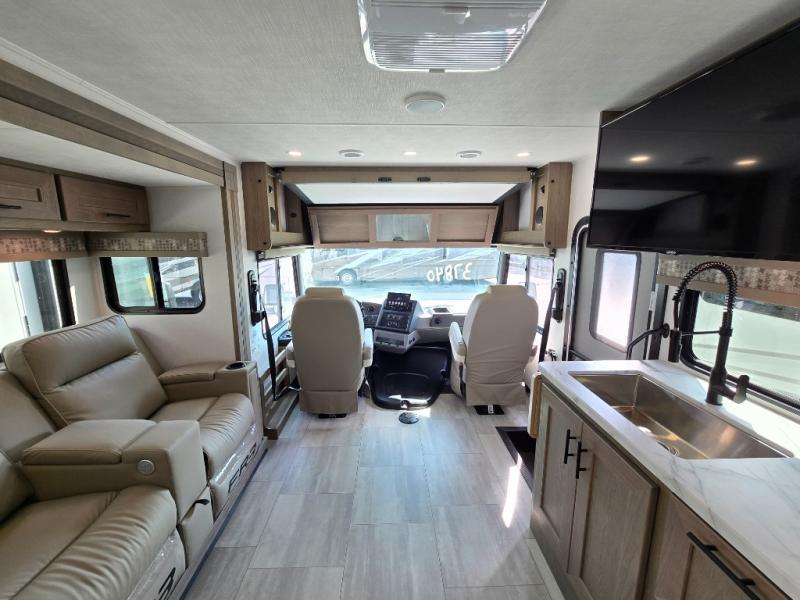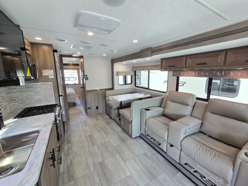 With each FR3 Class A gas motorhome by Forest River, you will find an easy-to-drive coach with a spacious interior allowing you to gather with friends and family with convenience and style found throughout! Each is built with vacuum-bonded construction, a one-piece fiberglass roof with extended rain spouts, a steel firewall and A-pillar extension, Bi-LED headlamps and lower LED fog lights, and grey Rotocast storage boxes with drains. Inside, you will enjoy black hardware, appliances, plumbing fixtures, and a glass shower door frame. You will also find a stainless steel kitchen sink with a bamboo cutting board and roll-up dryer, heavy-duty full-extension ball bearing drawer guides, dual-access dinette storage with doors, and nightstands with charging stations to keep your cellphones ready for whatever is next. Make your selection today!