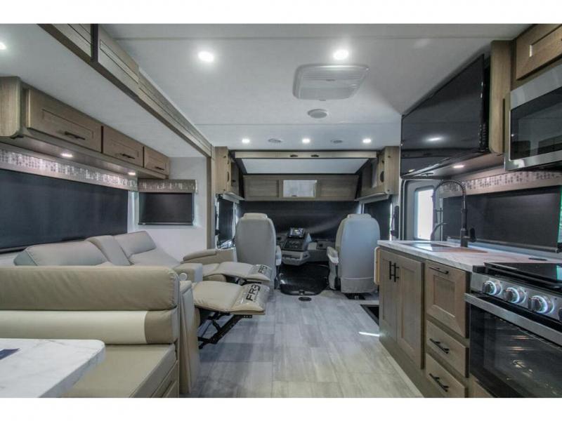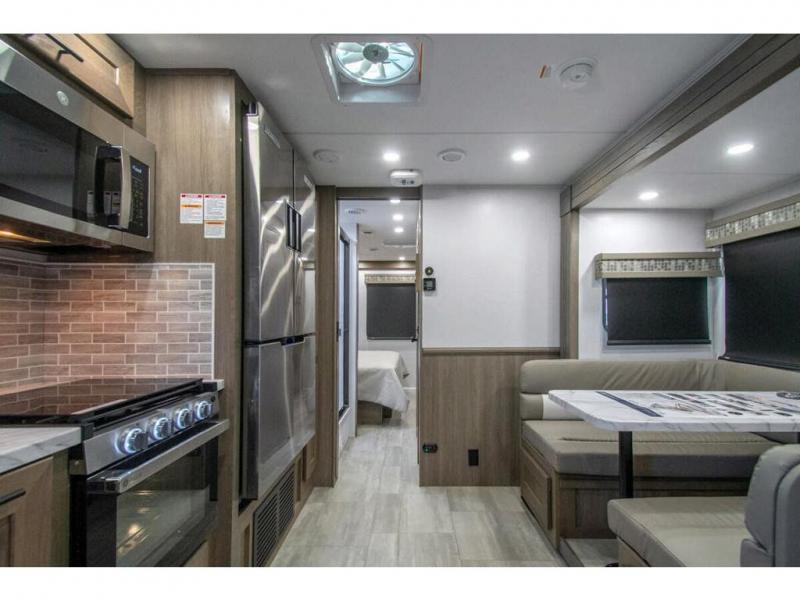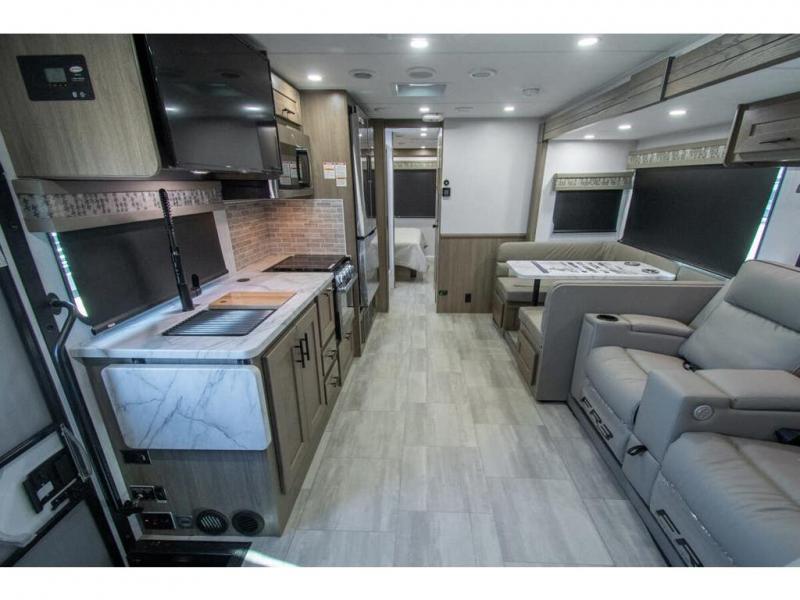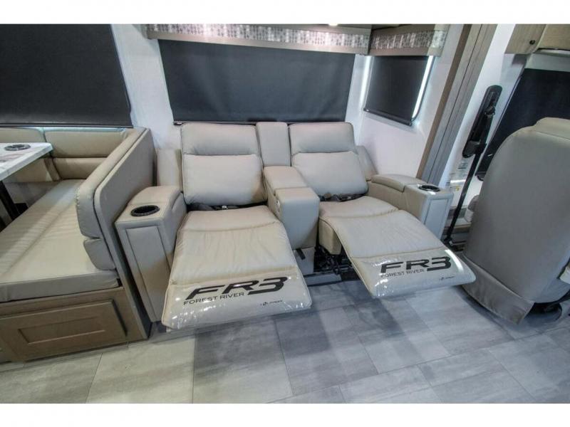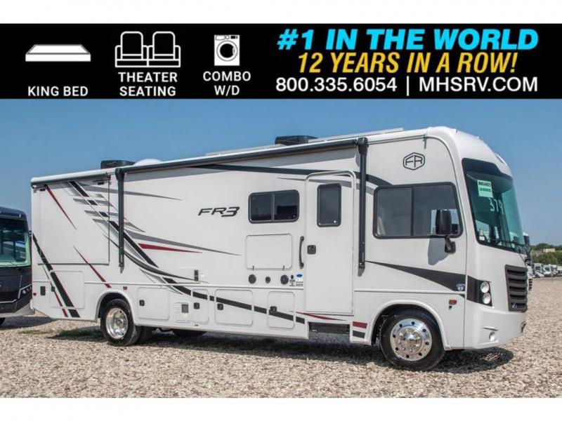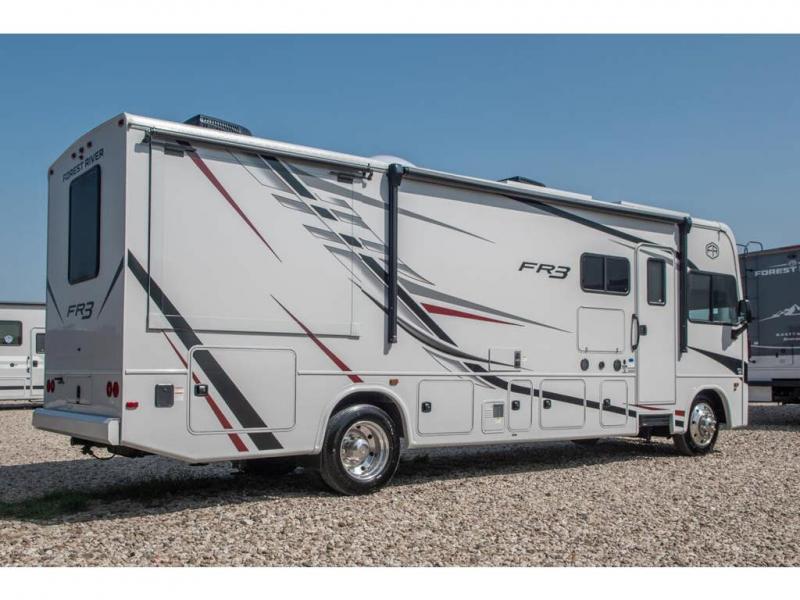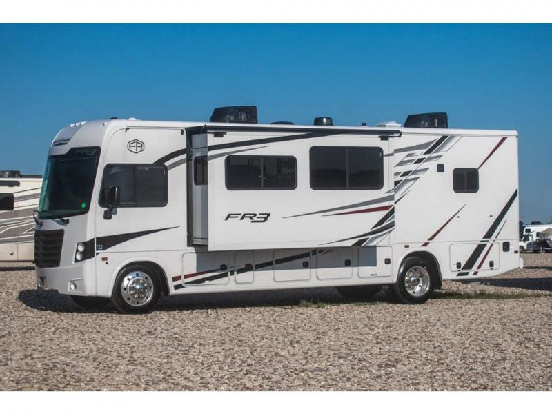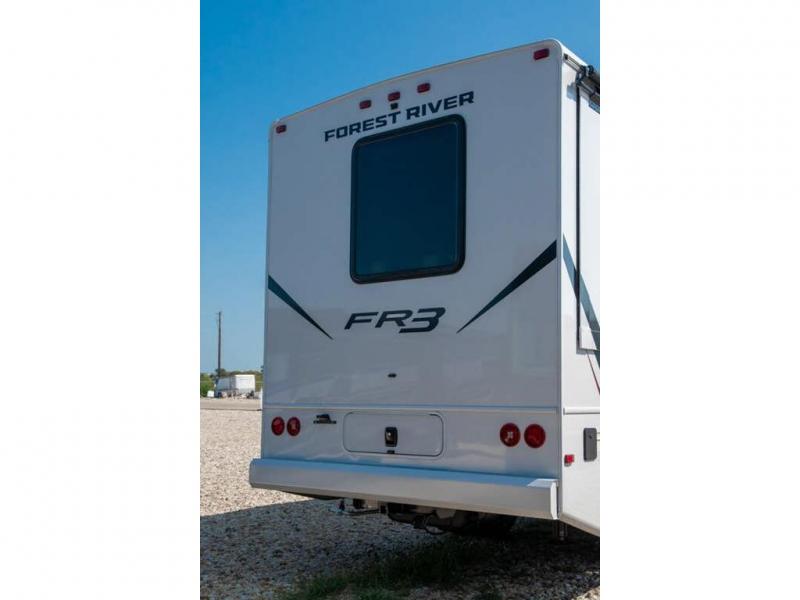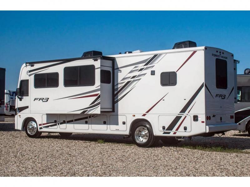 With each FR3 Class A gas motorhome by Forest River, you will find an easy-to-drive coach with a spacious interior allowing you to gather with friends and family with convenience and style found throughout! Each is built with vacuum-bonded construction, a one-piece fiberglass roof with extended rain spouts, a steel firewall and A-pillar extension, Bi-LED headlamps and lower LED fog lights, and grey Rotocast storage boxes with drains. Inside, you will enjoy black hardware, appliances, plumbing fixtures, and a glass shower door frame. You will also find a stainless steel kitchen sink with a bamboo cutting board and roll-up dryer, heavy-duty full-extension ball bearing drawer guides, dual-access dinette storage with doors, and nightstands with charging stations to keep your cellphones ready for whatever is next. Make your selection today!