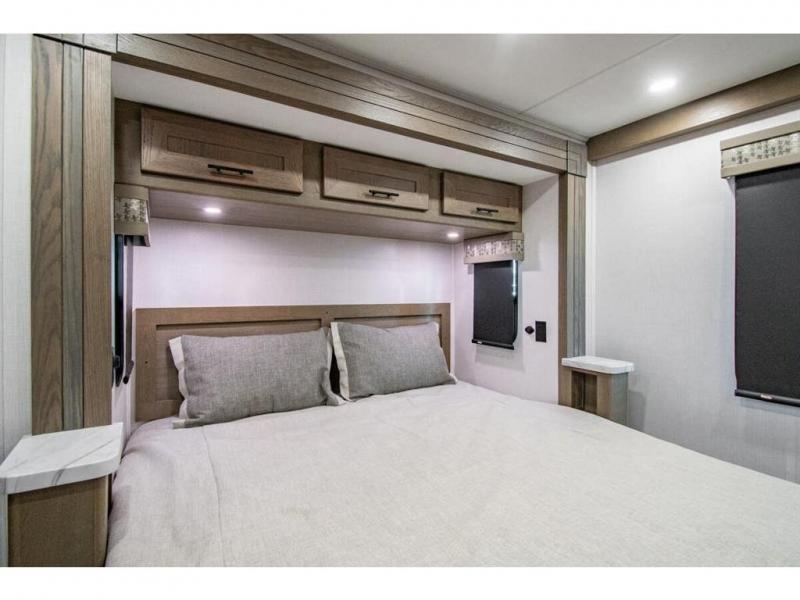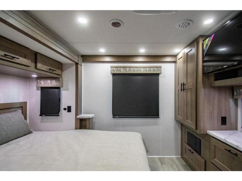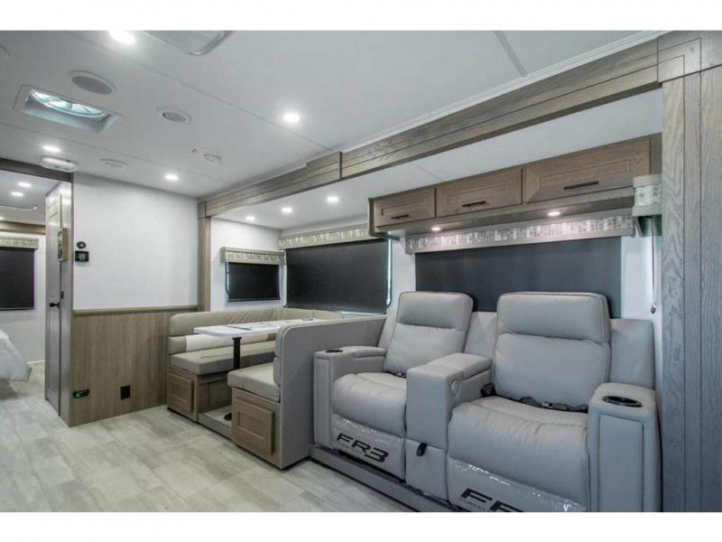 Whether you travel with your spouse, grandkids or friends, this FR3 Class A gas motorhome allows you to travel in style with plenty of additional sleeping choices from the power overhead bunk to the furniture once they are set up at night. You can dine at the wrap-around booth dinette, relax on the hide-a-bed sofa, and make full meals in the kitchen which also includes a residential microwave and countertop extension. The separated bathroom allows someone to take a shower while another freshens up with the private sink and toilet, or maybe you decide to close this area off within the bedroom. Every night you can sleep like a king while watching the 32" LED 12V TV in the bedroom, and maybe you decided to add the washer/dryer option to keep everything clean while on the road.