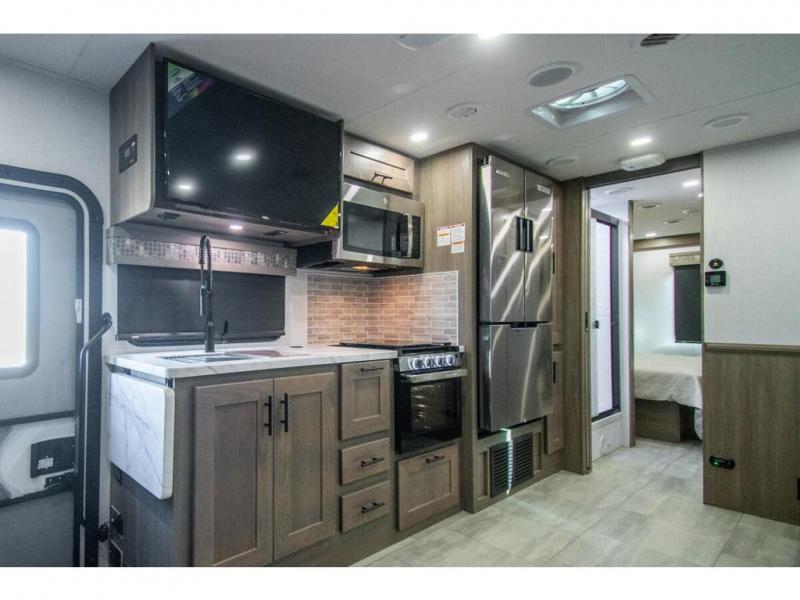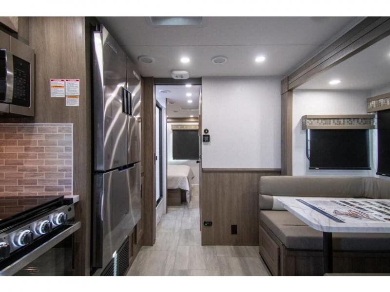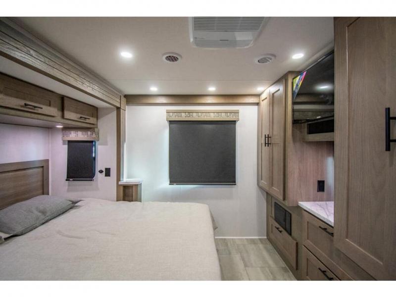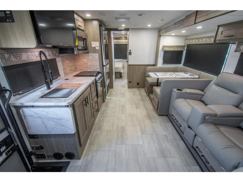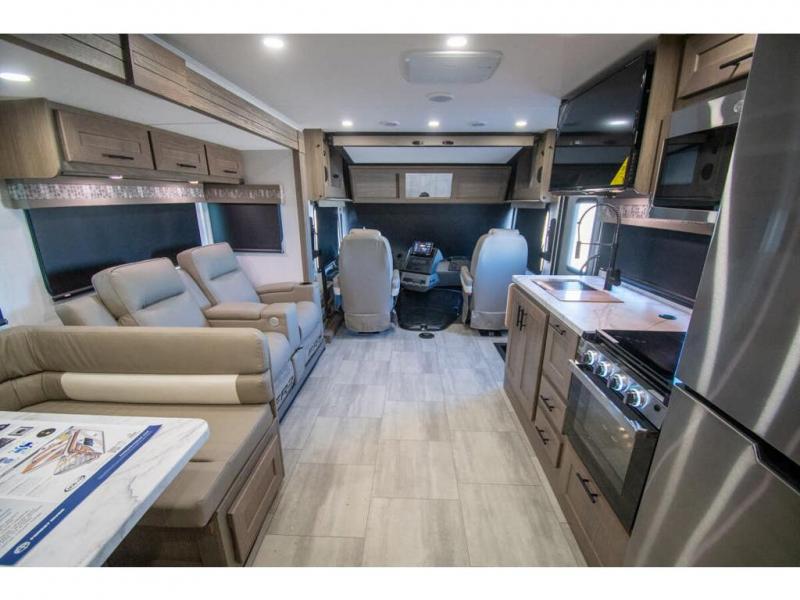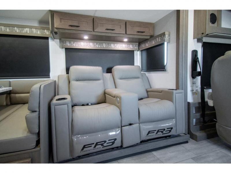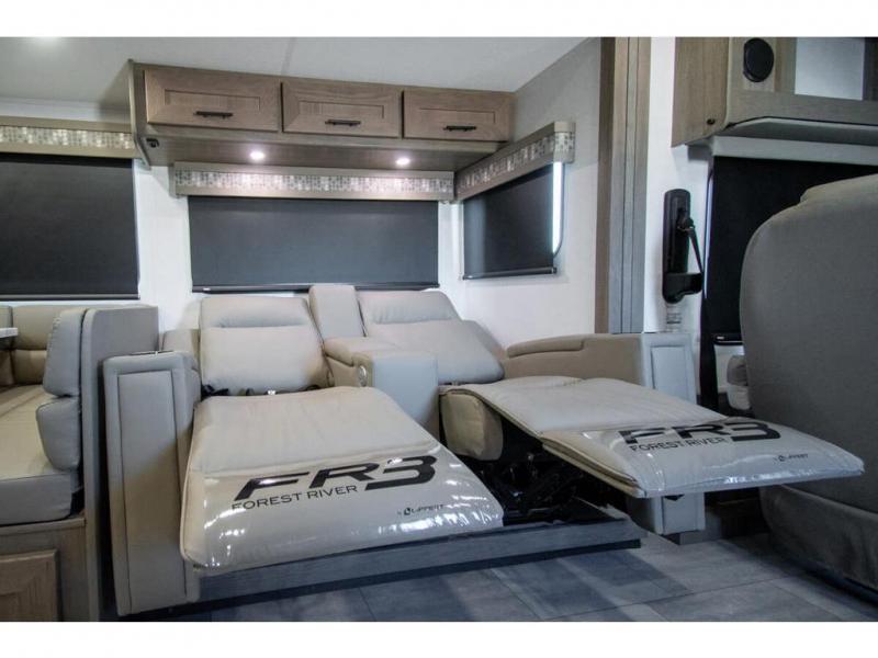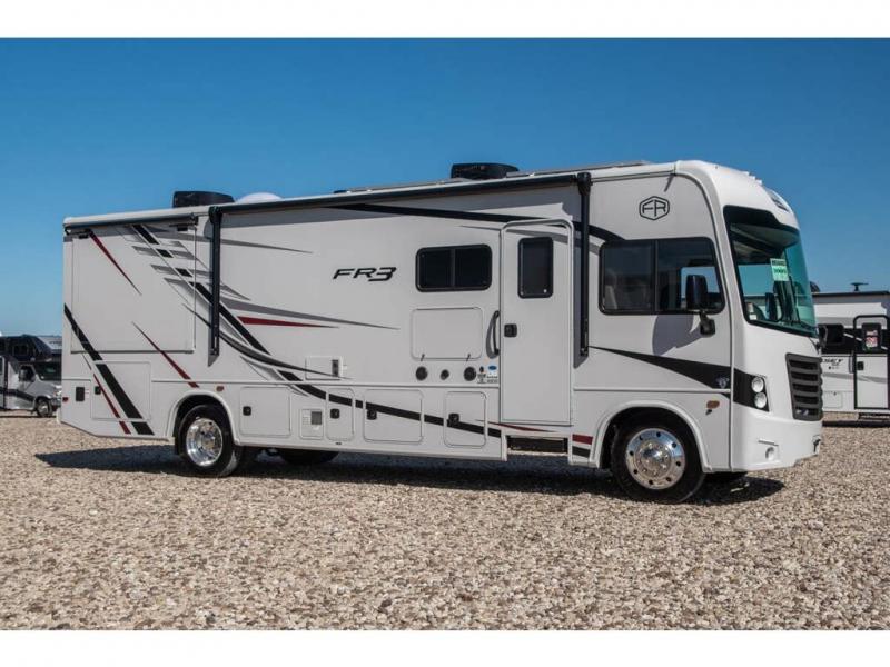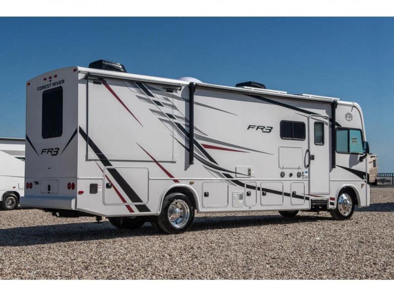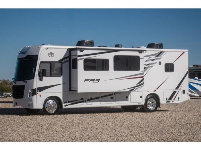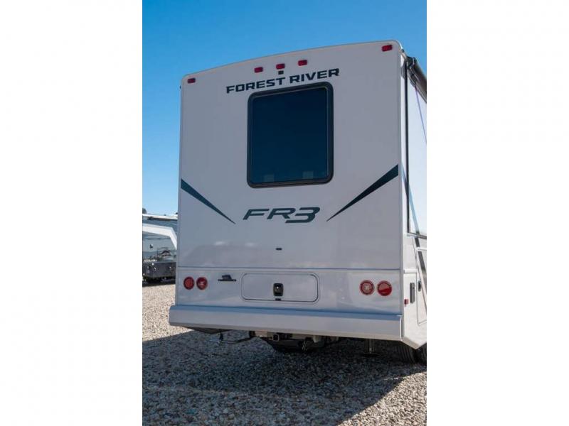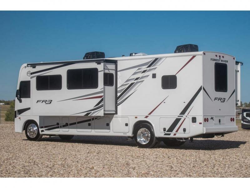 With each FR3 Class A gas motorhome by Forest River, you will find an easy-to-drive coach with a spacious interior allowing you to gather with friends and family with convenience and style found throughout! Each is built with vacuum-bonded construction, a one-piece fiberglass roof with extended rain spouts, a steel firewall and A-pillar extension, Bi-LED headlamps and lower LED fog lights, and grey Rotocast storage boxes with drains. Inside, you will enjoy black hardware, appliances, plumbing fixtures, and a glass shower door frame. You will also find a stainless steel kitchen sink with a bamboo cutting board and roll-up dryer, heavy-duty full-extension ball bearing drawer guides, dual-access dinette storage with doors, and nightstands with charging stations to keep your cellphones ready for whatever is next. Make your selection today!