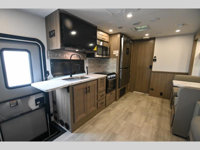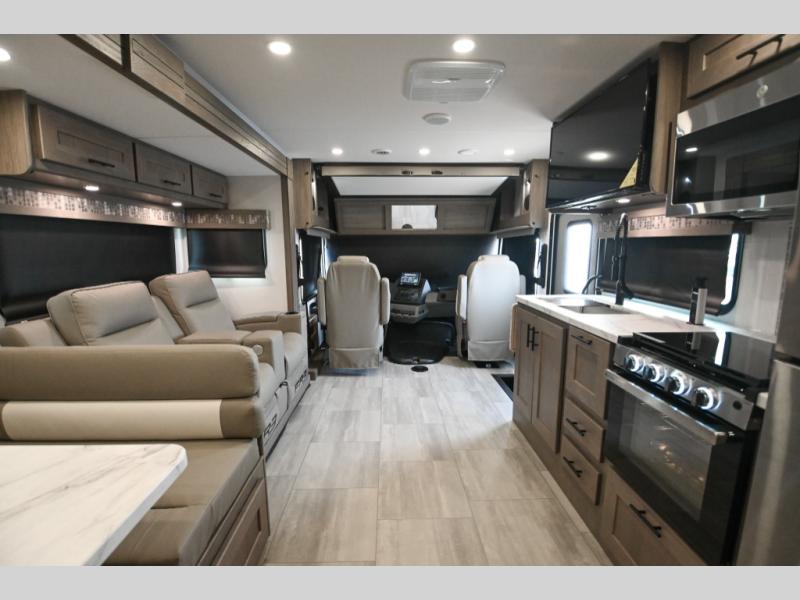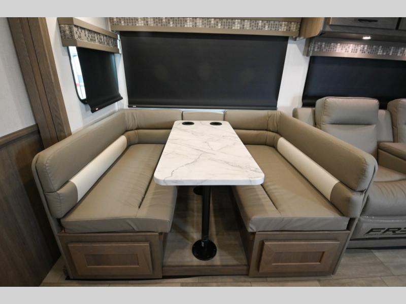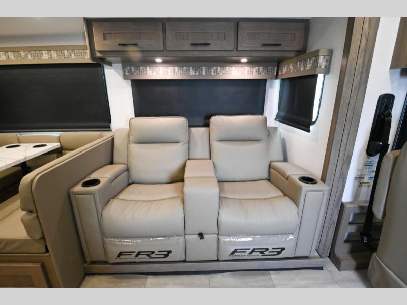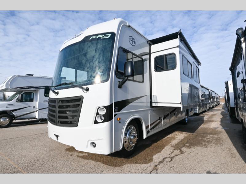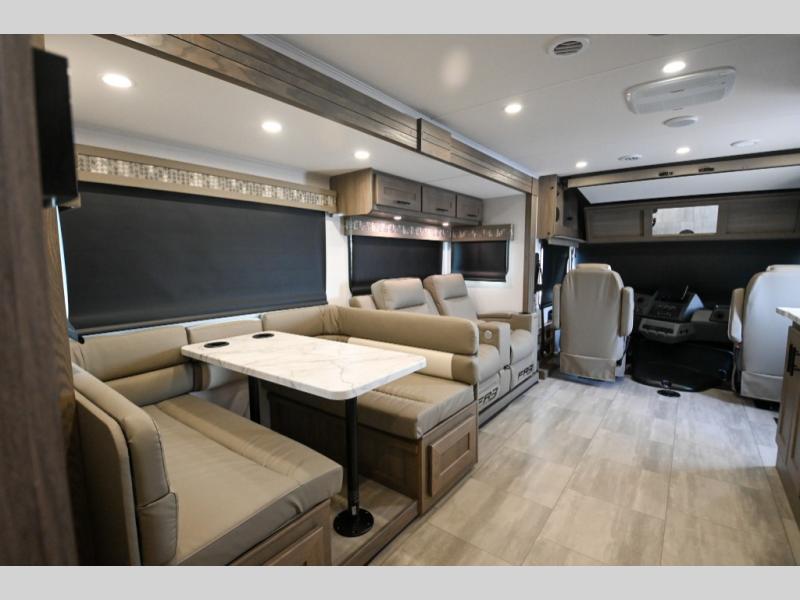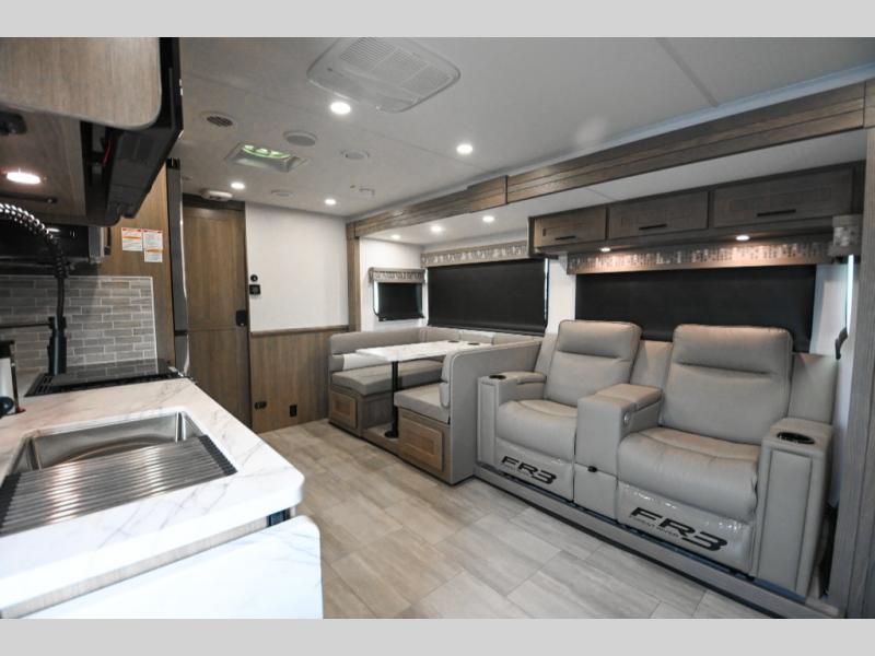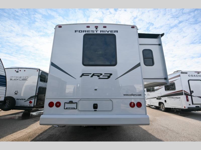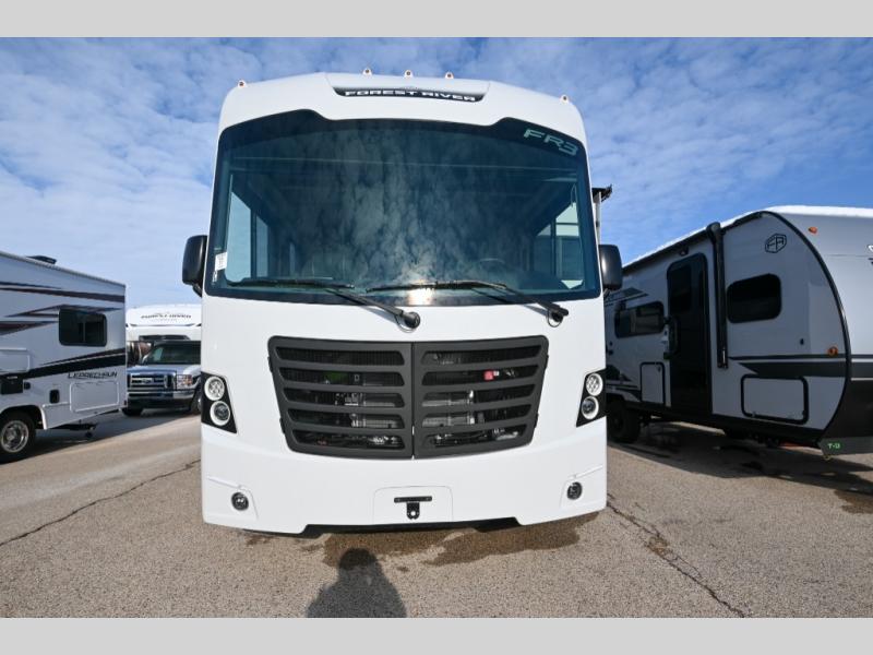With each FR3 Class A gas motorhome by Forest River, you will find an easy-to-drive coach with a spacious interior allowing you to gather with friends and family with convenience and style found throughout! Each is built with vacuum-bonded construction, a one-piece fiberglass roof with extended rain spouts, a steel firewall and A-pillar extension, Bi-LED headlamps and lower LED fog lights, and grey Rotocast storage boxes with drains. Inside, you will enjoy black hardware, appliances, plumbing fixtures, and a glass shower door frame. You will also find a stainless steel kitchen sink with a bamboo cutting board and roll-up dryer, heavy-duty full-extension ball bearing drawer guides, dual-access dinette storage with doors, and nightstands with charging stations to keep your cellphones ready for whatever is next. Make your selection today!
