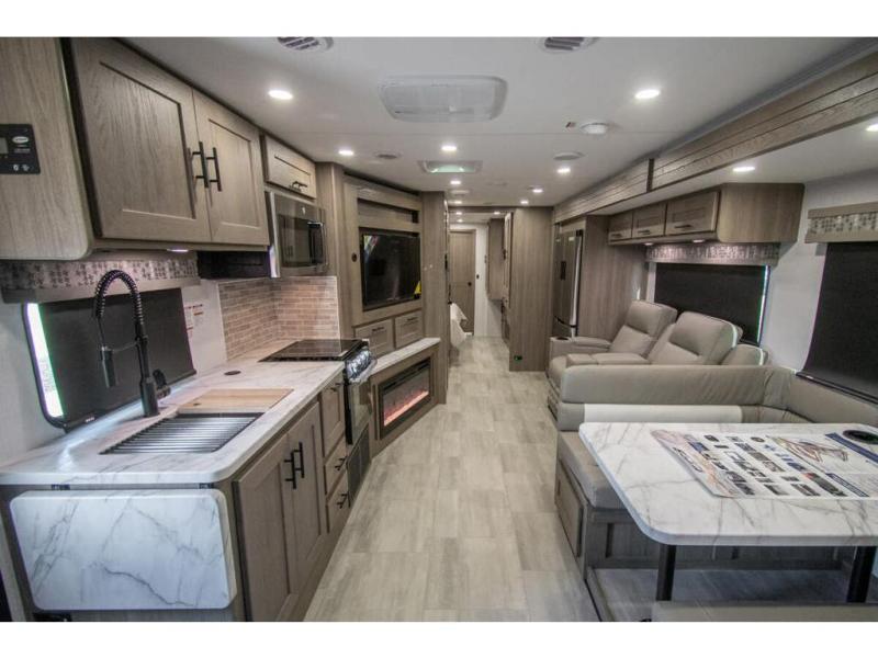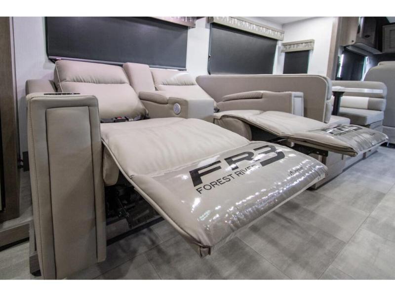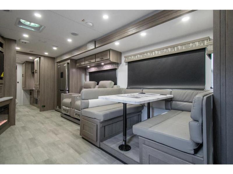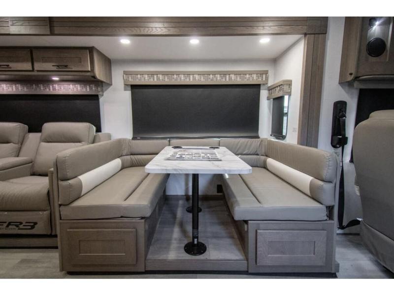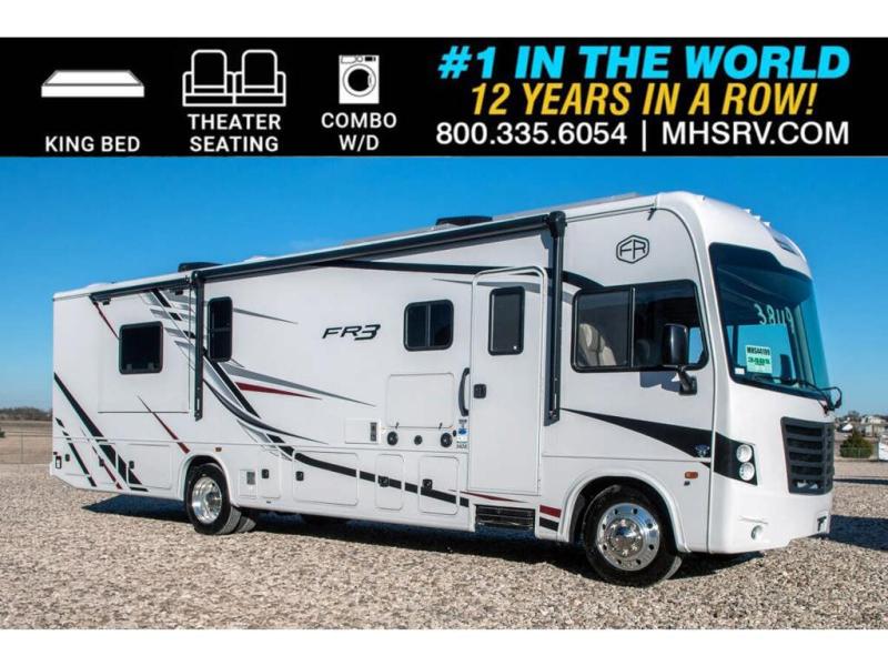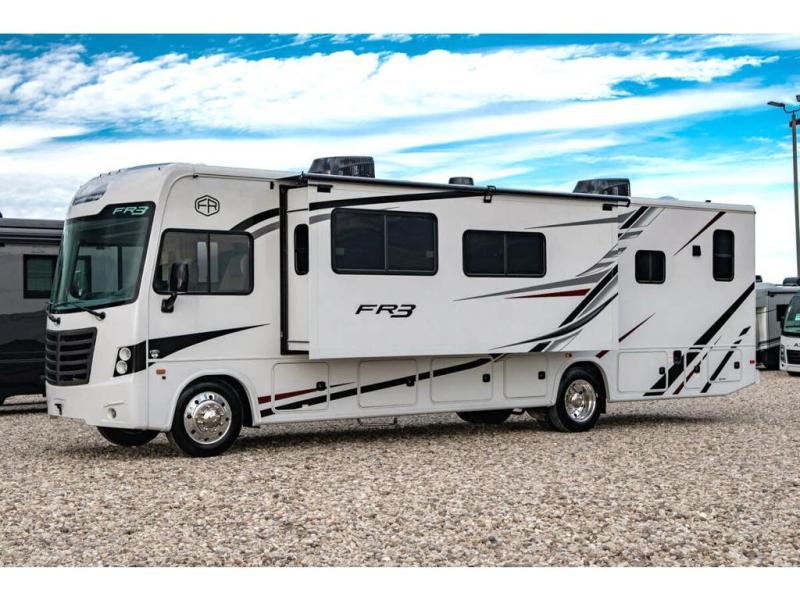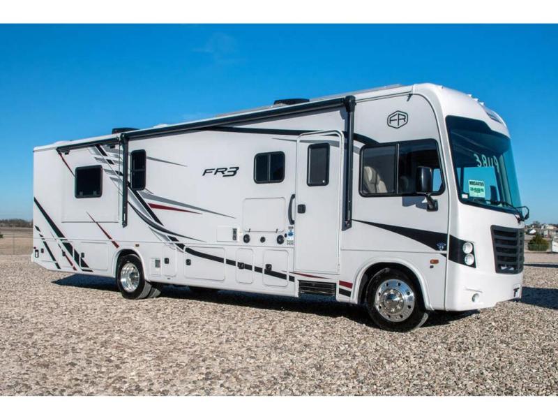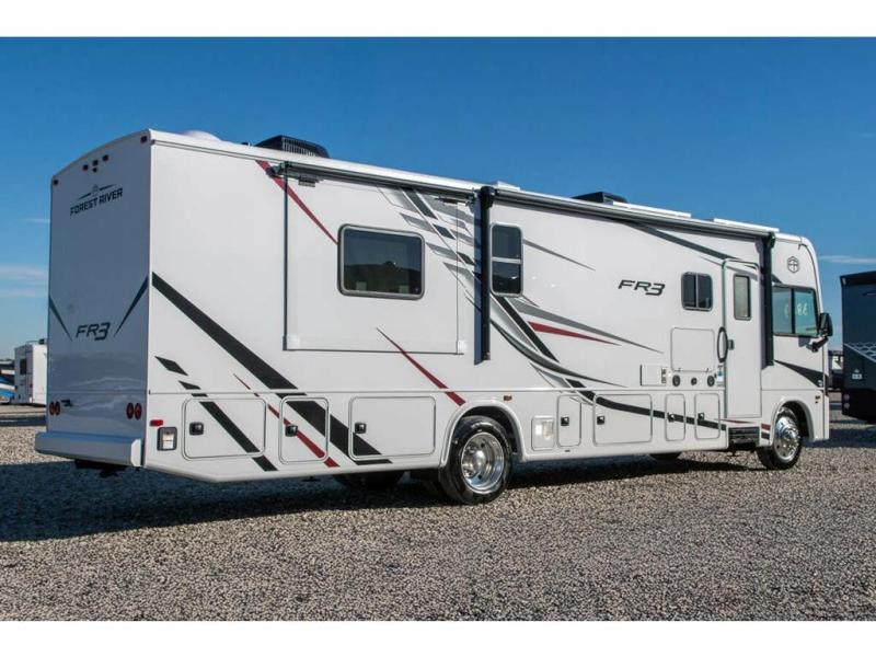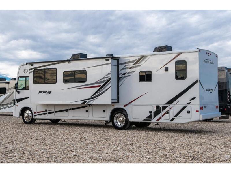 With each FR3 Class A gas motorhome by Forest River, you will find an easy-to-drive coach with a spacious interior allowing you to gather with friends and family with convenience and style found throughout! Each is built with vacuum-bonded construction, a one-piece fiberglass roof with extended rain spouts, a steel firewall and A-pillar extension, Bi-LED headlamps and lower LED fog lights, and grey Rotocast storage boxes with drains. Inside, you will enjoy black hardware, appliances, plumbing fixtures, and a glass shower door frame. You will also find a stainless steel kitchen sink with a bamboo cutting board and roll-up dryer, heavy-duty full-extension ball bearing drawer guides, dual-access dinette storage with doors, and nightstands with charging stations to keep your cellphones ready for whatever is next. Make your selection today!