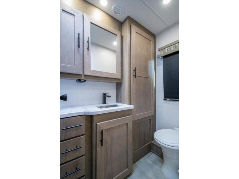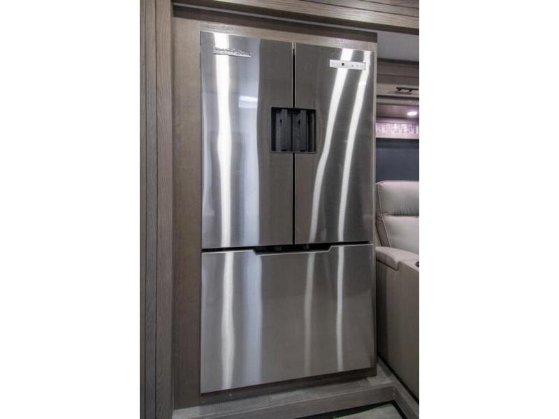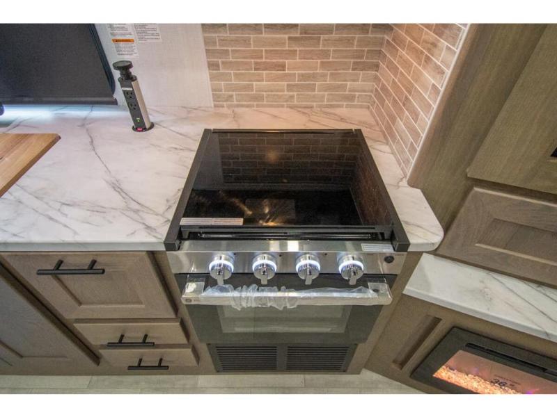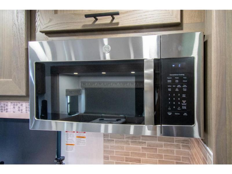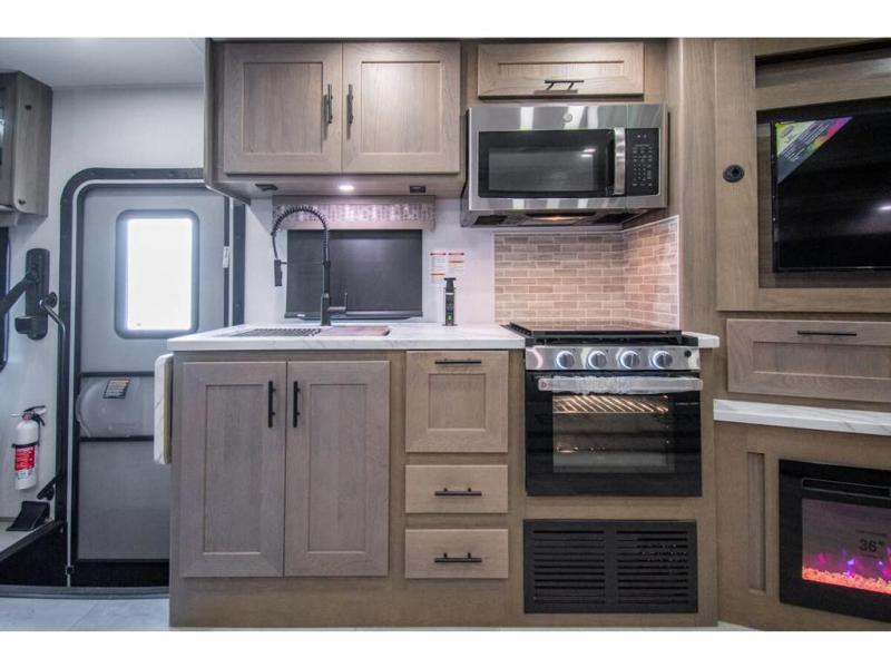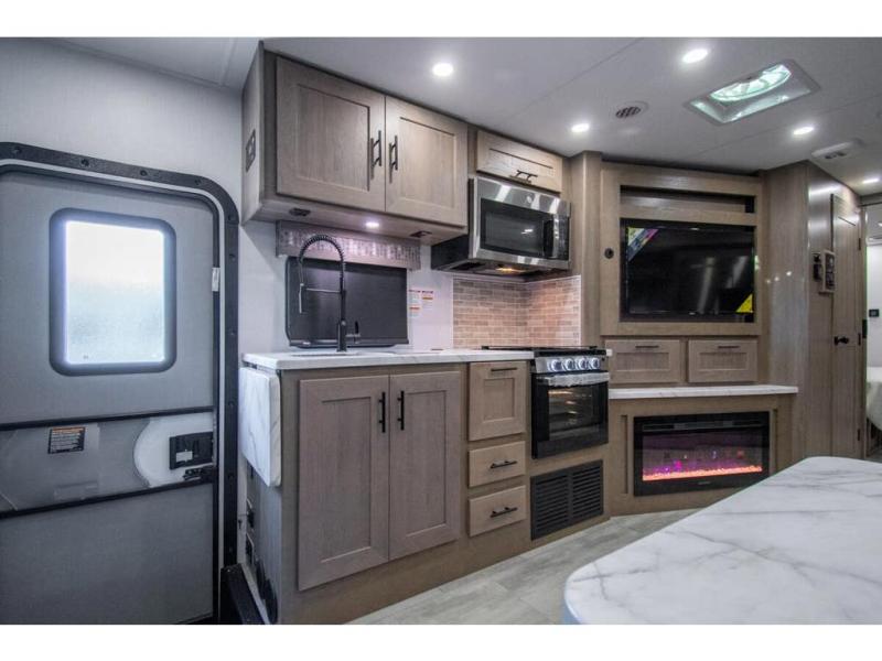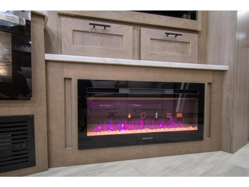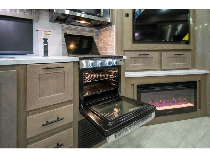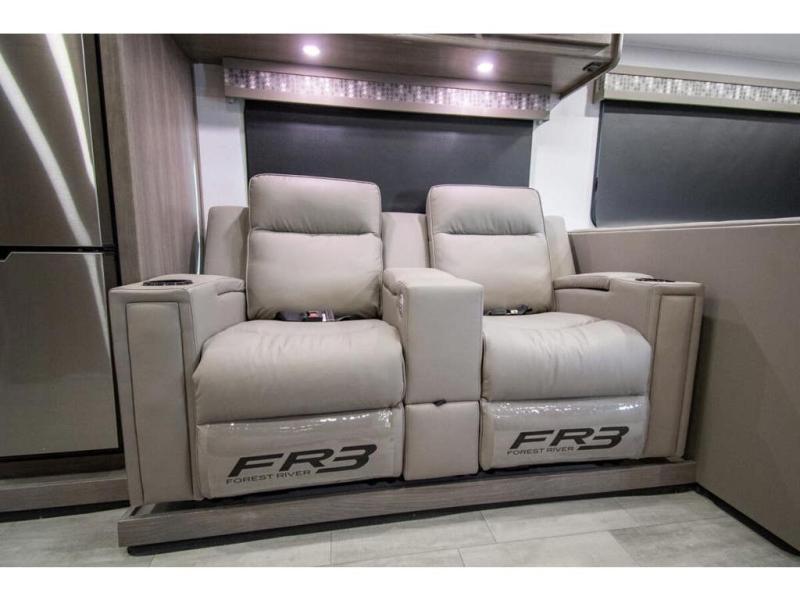 Spacious and inviting for couples or families, this FR3 Class A gas motorhome offers convenience throughout including a half bath for the kids and guests and a full rear bathroom for the owners. This full bathroom is located within the rear master suite where you will also find a king-size bed for relaxing. Once at your destination, you can quickly set up the power awning to relax outside while watching the exterior TV and visiting with other RVers. You might have decided to add the washer and dryer option in the bedroom, so a load of laundry might even get done. Once you are ready to fill your tummy, the full kitchen offers everything you need plus a residential microwave. You might even decide to relax on one of the theater seats after dinner as you watch the big game on the 40" LED 12V TV with a fireplace below.