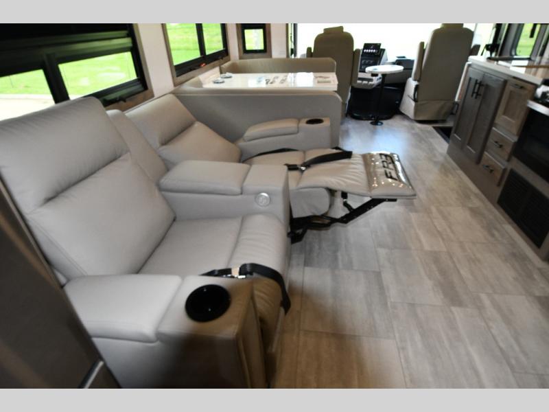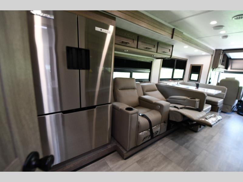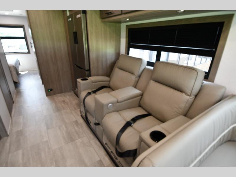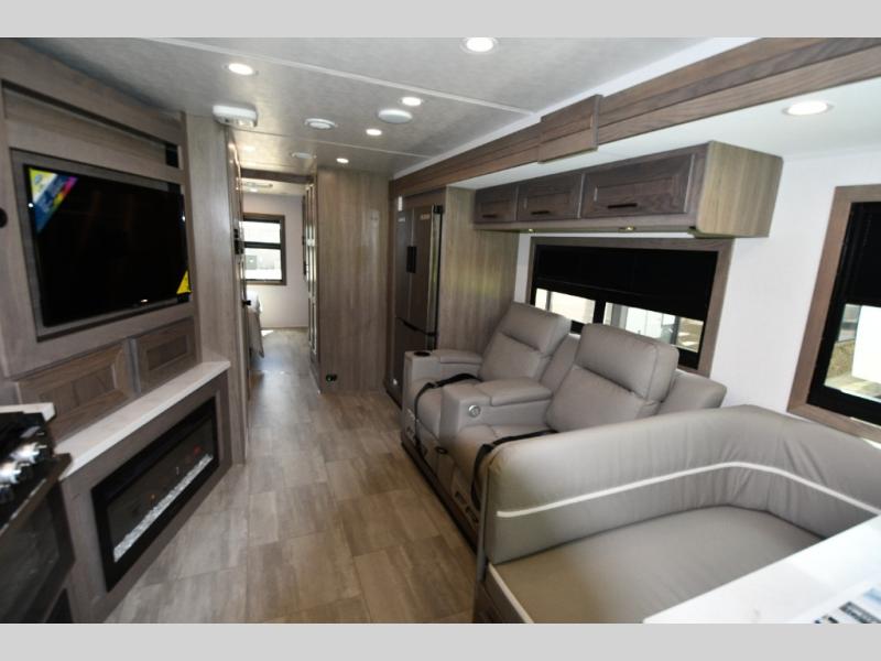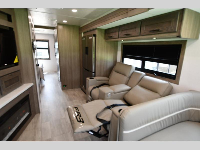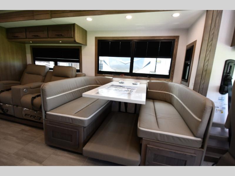 68" theater seating, wrap-around dinette, and fireplace for ultimate indoor comfort