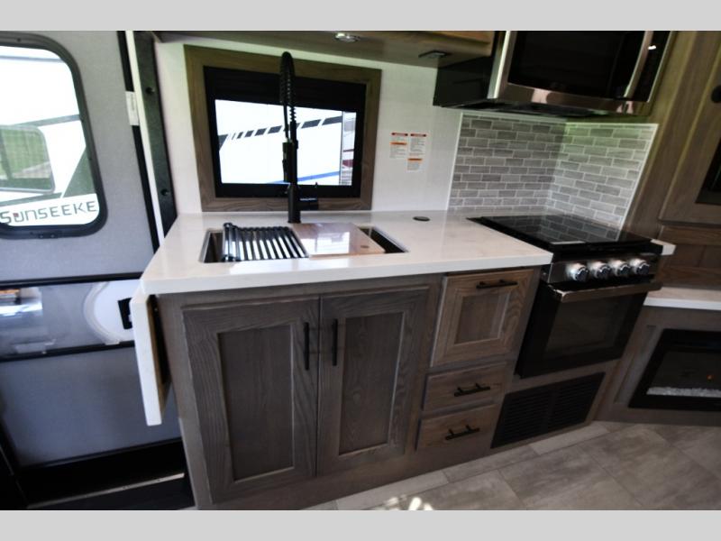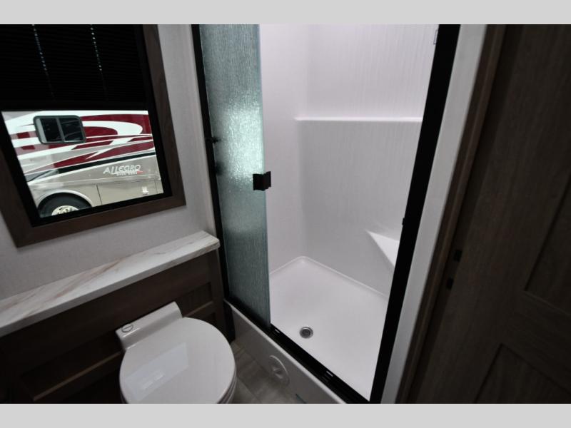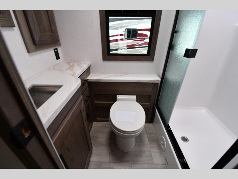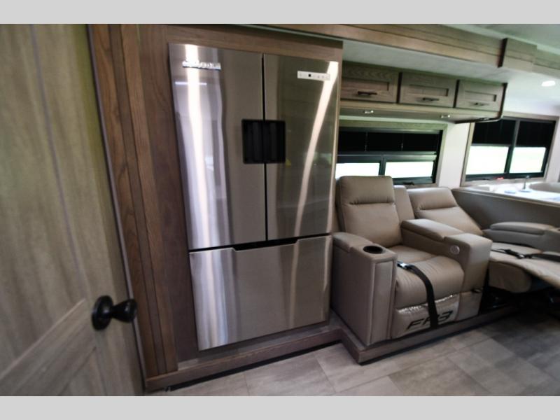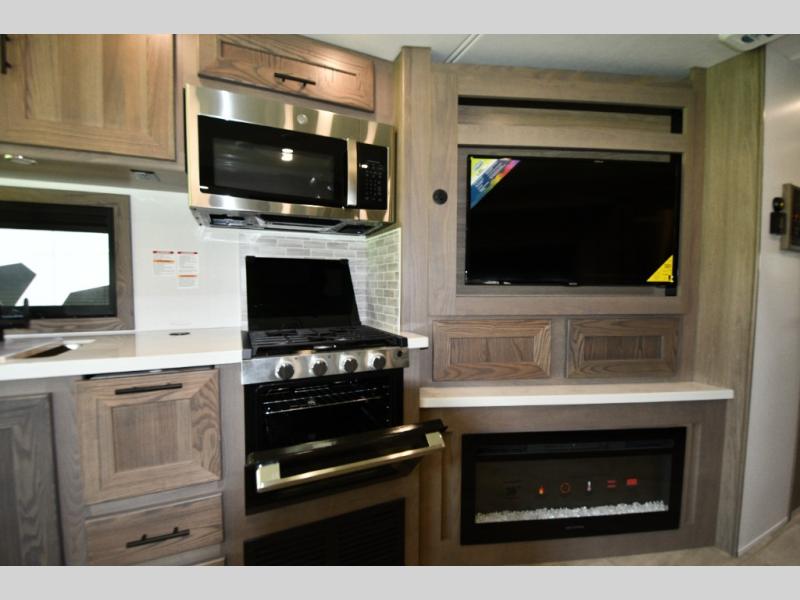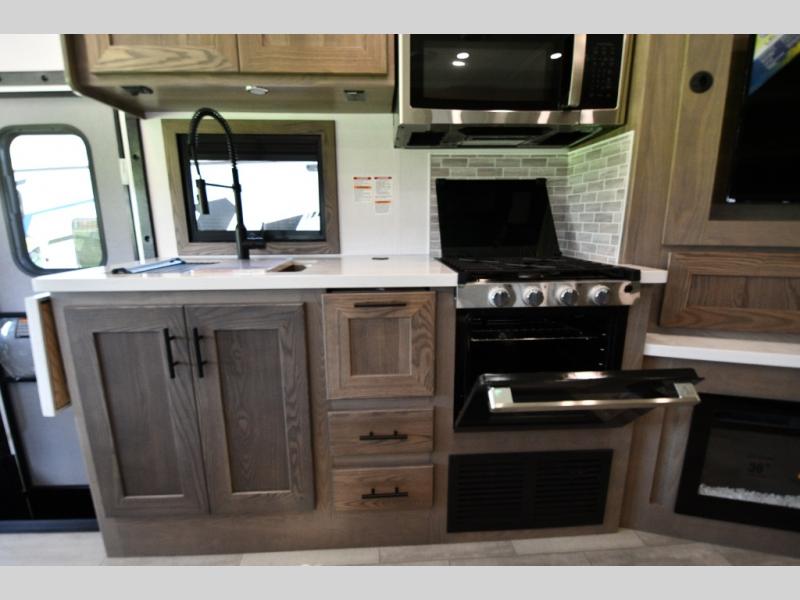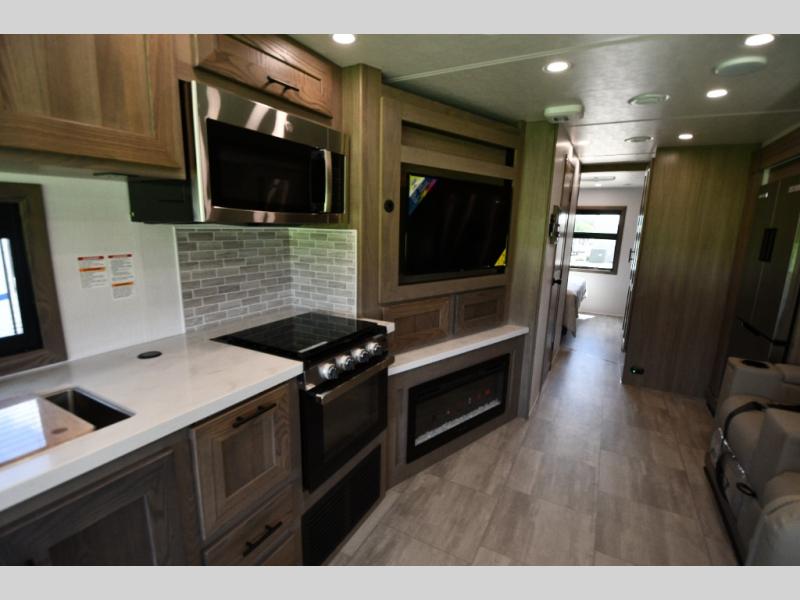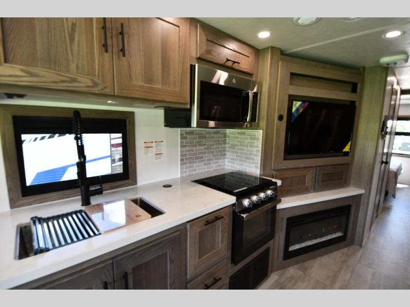 Inside, enjoy the warmth of Tobacco hardwood cabinetry, solid-surface countertops, and a suite of modern appliances. Relax on the 68" theater seating, gather at the wrap-around booth dinette, or cozy up by the fireplace. The chef will love the stainless steel three-burner cooktop with oven, microwave, and 15 cu. ft. 12V refrigerator, while the pull-out countertop expands prep space. Oversized windows fill the interior with light and scenic views, making every stop feel connected to the outdoors.