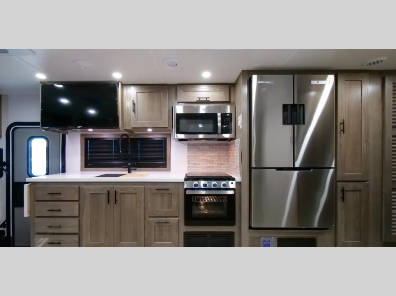 The kitchen is equipped with a stainless steel three-burner cooktop and a 30" over-the-range residential microwave, making meal prep a breeze. The wrap-around booth dinette and 68" power theater seating provide the perfect space for dining and entertainment, while the 32" 12V TV makes viewing easy from anywhere in the living area.