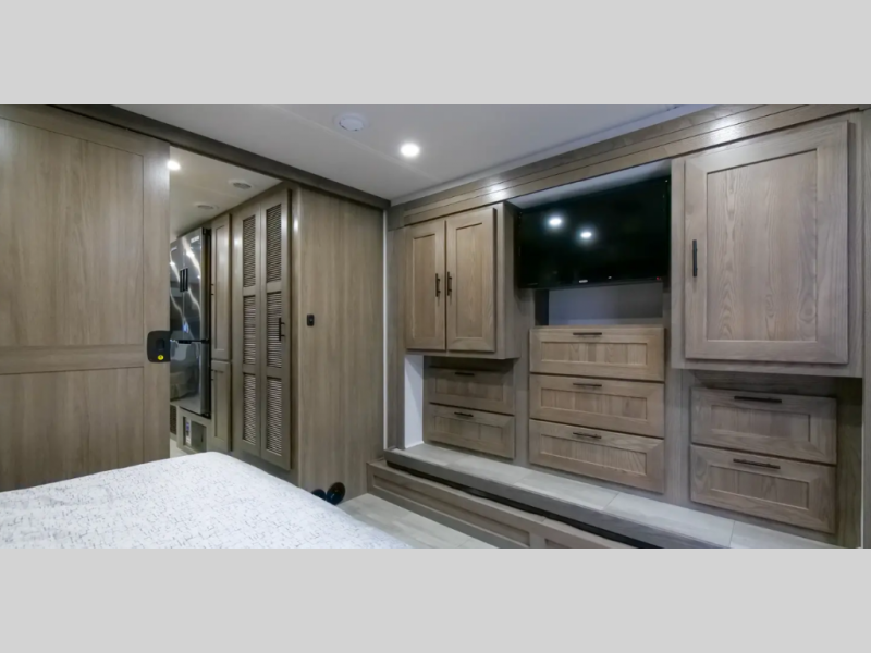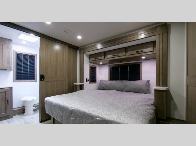 This Class A gas motorhome is designed to maximize both comfort and functionality. The master bedroom features a king bed slide-out for ultimate relaxation, while the mid-coach half bath offers added convenience for guests. Keep your wardrobe organized with dual bedroom wardrobes and an option for a stackable washer and dryer prep.