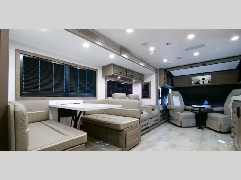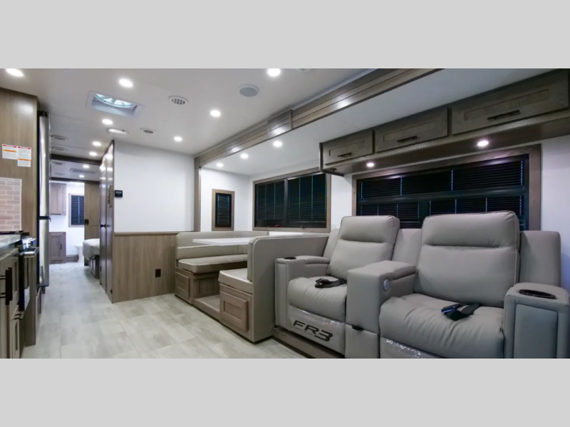 The FR3 Plus Class A gas motorhome takes things a step further with a modern, sleek exterior featuring full-body paint. The vacuum-bonded construction ensures years of travel-ready reliability, and the full fiberglass front cap adds extra protection. The two-tone ultra leather captain’s seats and Sony 10.1" dash radio with a color back-up monitor provide a smooth, enjoyable driving experience.