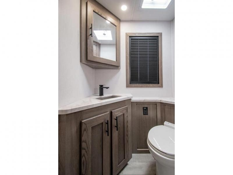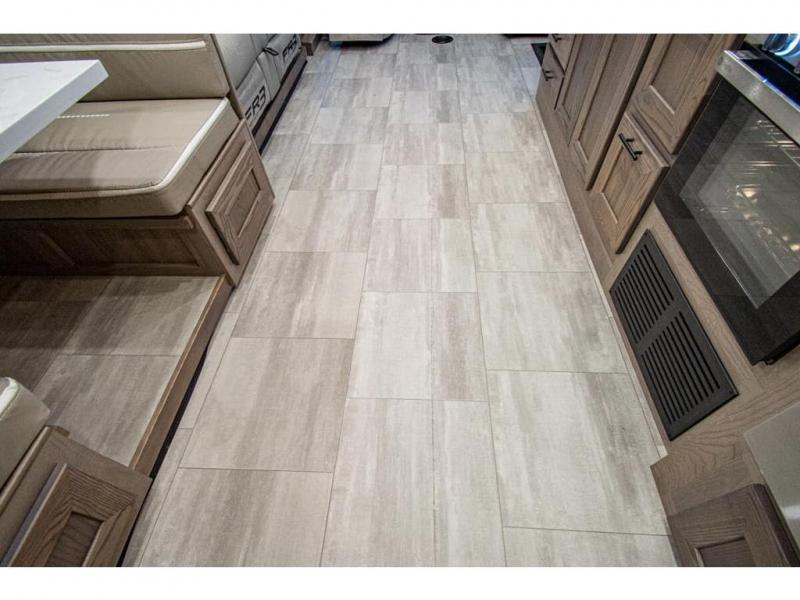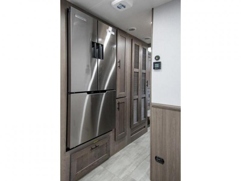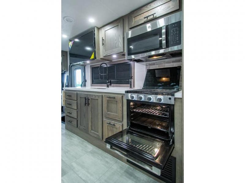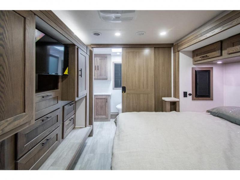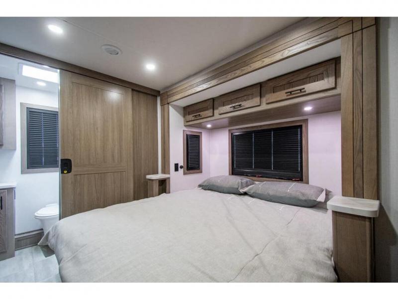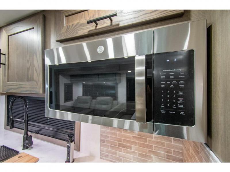 If you're looking for more space when you travel and a little more convenience, this coach may just be perfect for you! Not only will you enjoy a master bedroom with a full rear bath, but your guest will have the mid-coach half bath for easy use! A king bed slide out will provide a great night's rest each nigh, and you'll appreciate dual bedroom wardrobes to keep your clothes organized. There is also a wardrobe with stackable washer and dryer prep if you want the option to make laundry day easier. Head to the kitchen to prepare breakfast on the stainless steel three burner cooktop, or you can use the 30" residential over-the-range microwave. There is a wrap-around booth dinette where you can dine together plus 68" power theater seating across from the 32" 12V TV for easy viewing. This model also includes secure overhead storage above the cab where you can put luggage, lawn equipment, board games, and more!