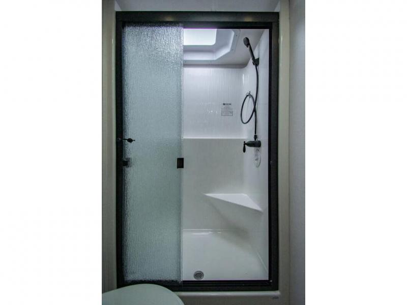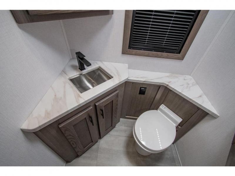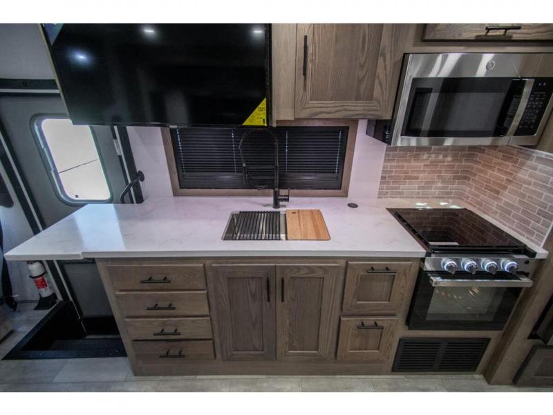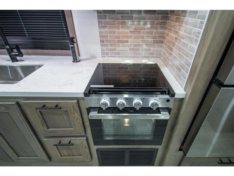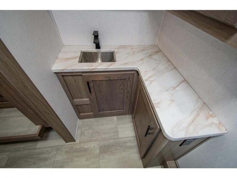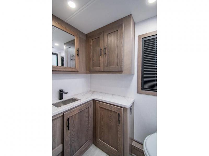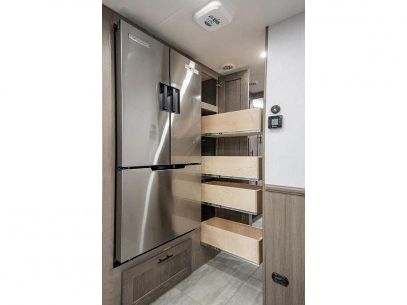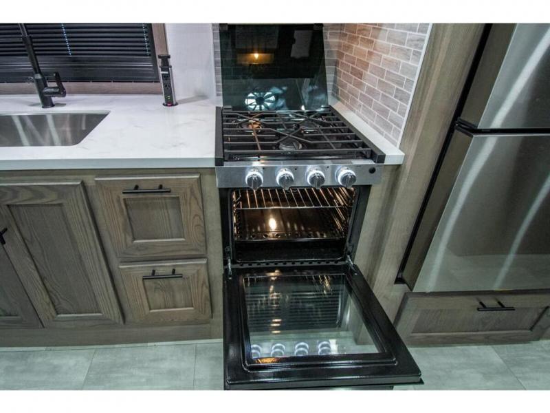 If you're looking for more space when you travel and a little more convenience, this coach may just be perfect for you! Not only will you enjoy a master bedroom with a full rear bath, but your guest will have the mid-coach half bath for easy use! A king bed slide out will provide a great night's rest each nigh, and you'll appreciate dual bedroom wardrobes to keep your clothes organized. There is also a wardrobe with stackable washer and dryer prep if you want the option to make laundry day easier. Head to the kitchen to prepare breakfast on the stainless steel three burner cooktop, or you can use the 30" residential over-the-range microwave. There is a wrap-around booth dinette where you can dine together plus 68" power theater seating across from the 32" 12V TV for easy viewing. This model also includes secure overhead storage above the cab where you can put luggage, lawn equipment, board games, and more!
