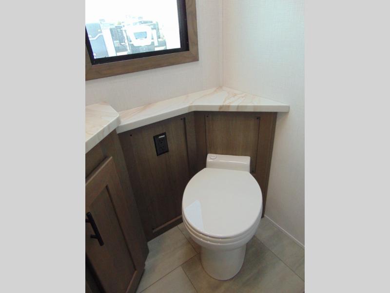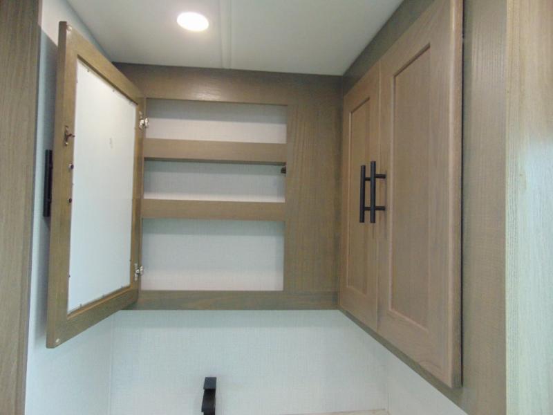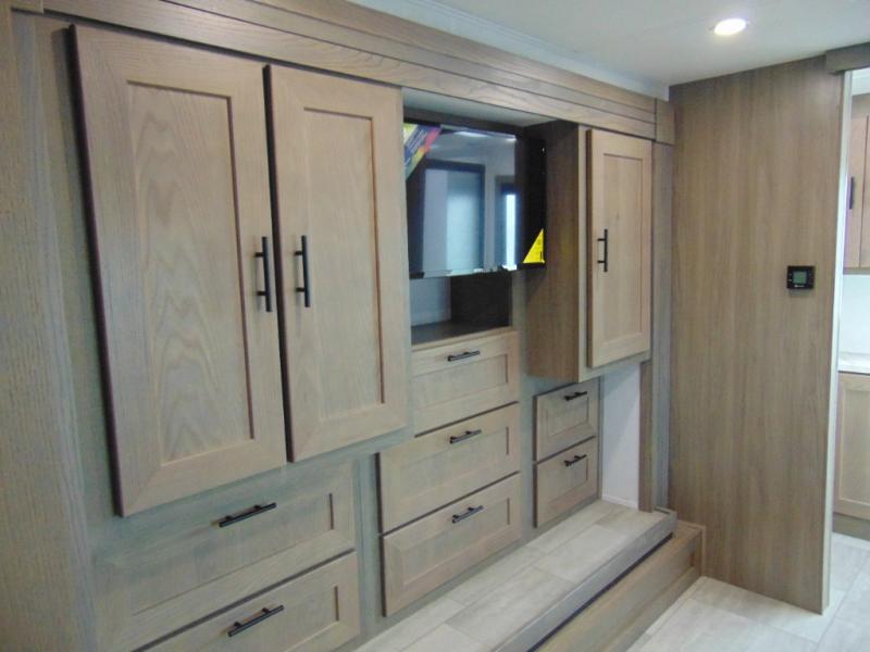 If you're looking for more space when you travel and a little more convenience, this coach may just be perfect for you! Not only will you enjoy a master bedroom with a full rear bath, but your guest will have the mid-coach half bath for easy use! A king bed slide out will provide a great night's rest each nigh, and you'll appreciate dual bedroom wardrobes to keep your clothes organized. There is also a wardrobe with stackable washer and dryer prep if you want the option to make laundry day easier. Head to the kitchen to prepare breakfast on the stainless steel three burner cooktop, or you can use the 30" residential over-the-range microwave. There is a wrap-around booth dinette where you can dine together plus 68" power theater seating across from the 32" 12V TV for easy viewing. This model also includes secure overhead storage above the cab where you can put luggage, lawn equipment, board games, and more!