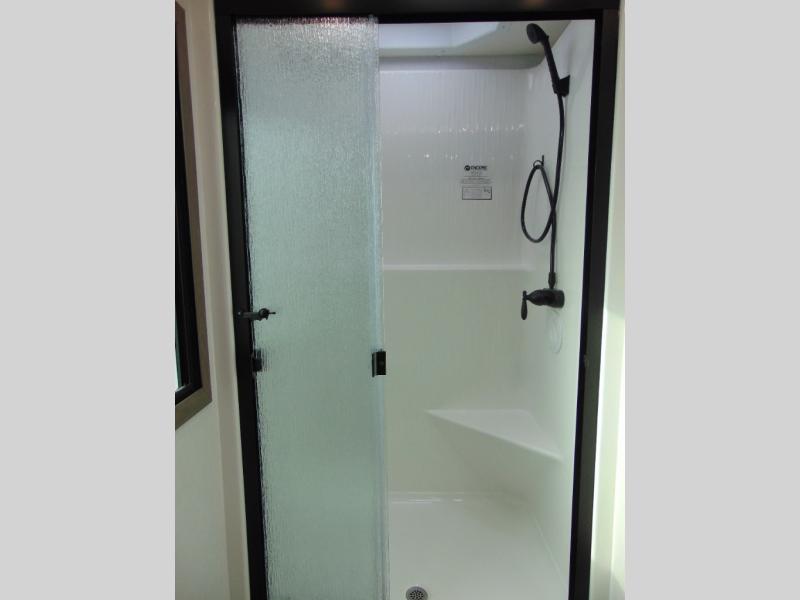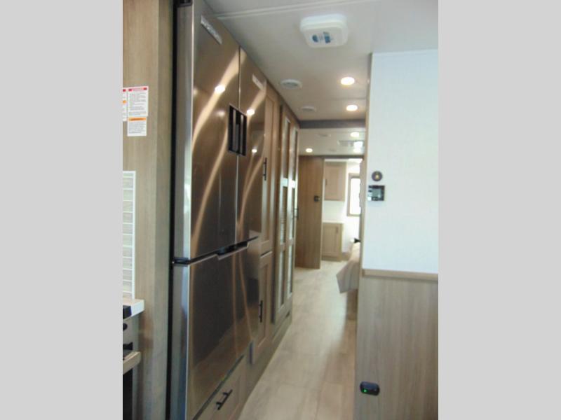 If you're looking for more space when you travel and a little more convenience, this coach may just be perfect for you! Not only will you enjoy a master bedroom with a full rear bath, but your guest will have the mid-coach half bath for easy use! A king bed slide out will provide a great night's rest each nigh, and you'll appreciate dual bedroom wardrobes to keep your clothes organized. There is also a wardrobe with stackable washer and dryer prep if you want the option to make laundry day easier. Head to the kitchen to prepare breakfast on the stainless steel three burner cooktop, or you can use the 30" residential over-the-range microwave. There is a wrap-around booth dinette where you can dine together plus 68" power theater seating across from the 32" 12V TV for easy viewing. This model also includes secure overhead storage above the cab where you can put luggage, lawn equipment, board games, and more!