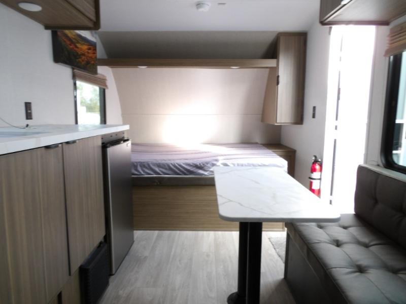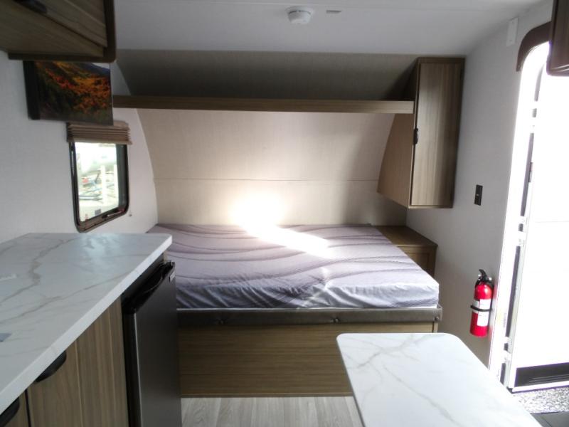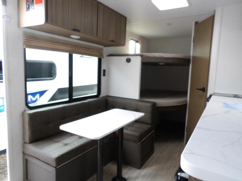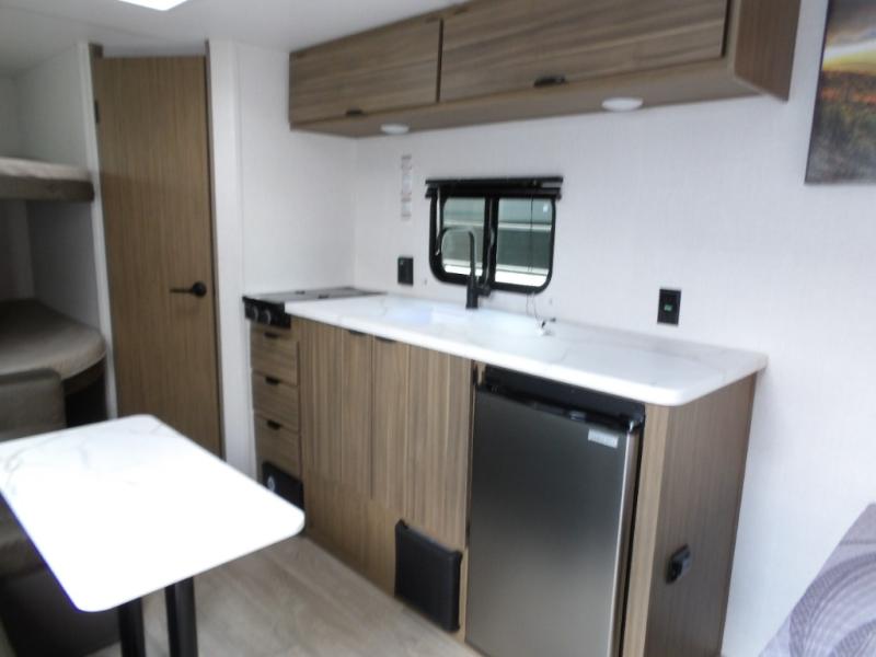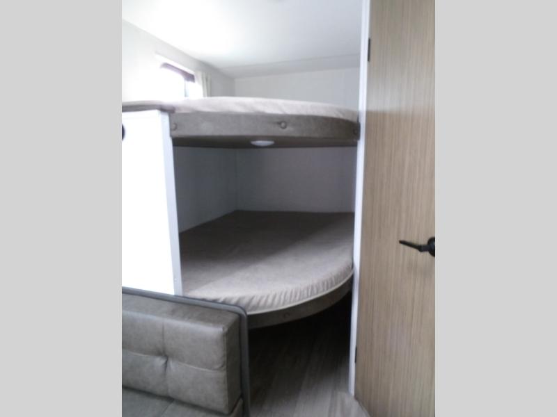 The double-size bunks with storage will be a big selling point in this travel trailer! While your guests take the bunks, you can have the front queen bed all to yourselves, and there is a wardrobe to keep your things organized. A two burner cooktop and microwave will let you make meals each day, and you can dine at the open lounge with a table.