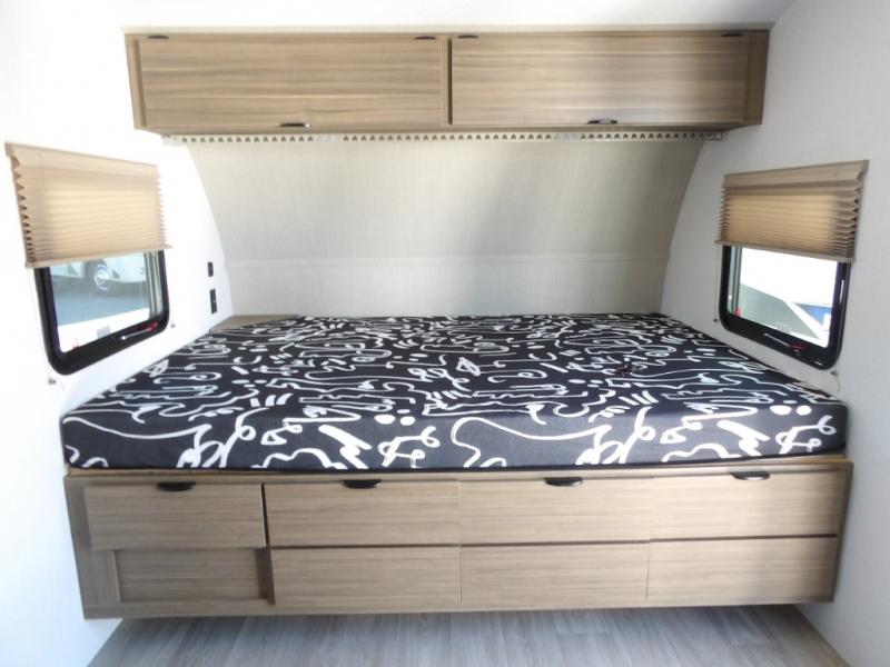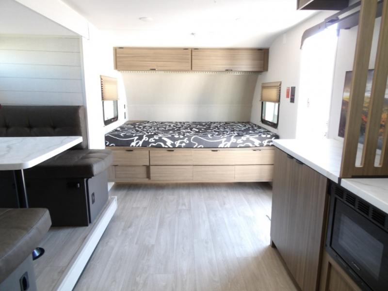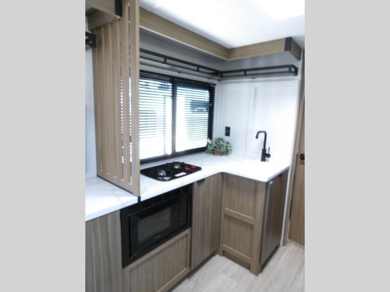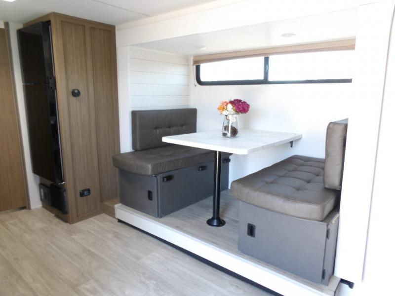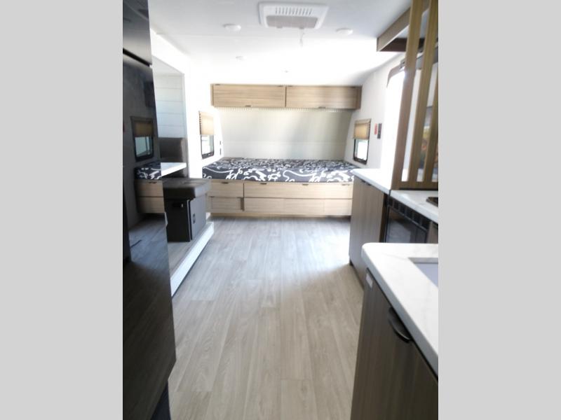 It will be so easy to enjoy time spent in this travel trailer for three. The front queen bed provides a great night's rest, and there is an overhead cabinet to keep your things organized. A two-burner cooktop in the kitchen will let you make meals for your crew, and a refrigerator keeps leftovers fresh. You can dine at the booth dinette within the slide out or take your plate outdoors to sit under the 12' power awning. And a full rear bath with a shower, toilet, and large vanity counter lets you stay clean each day!