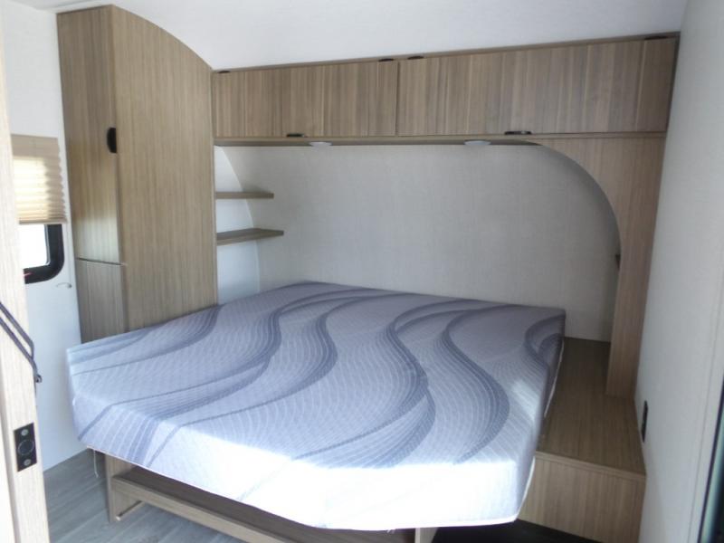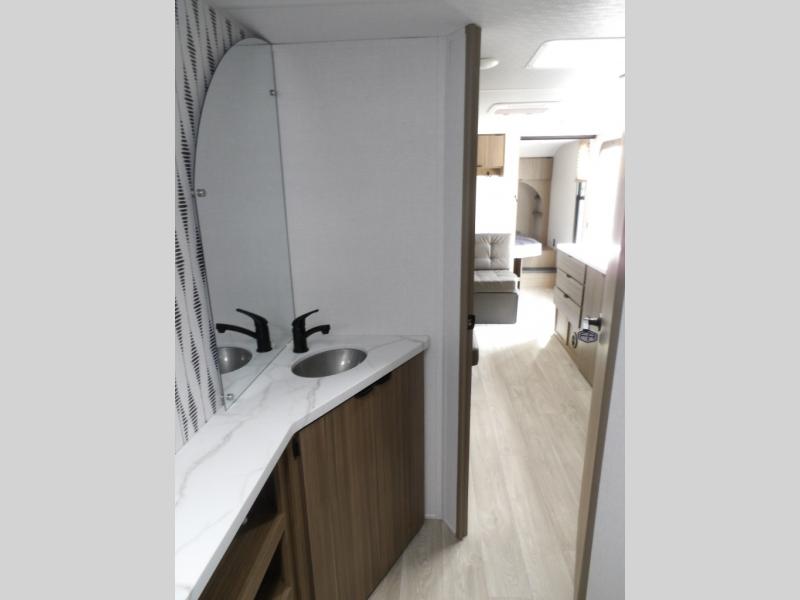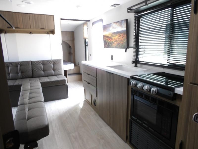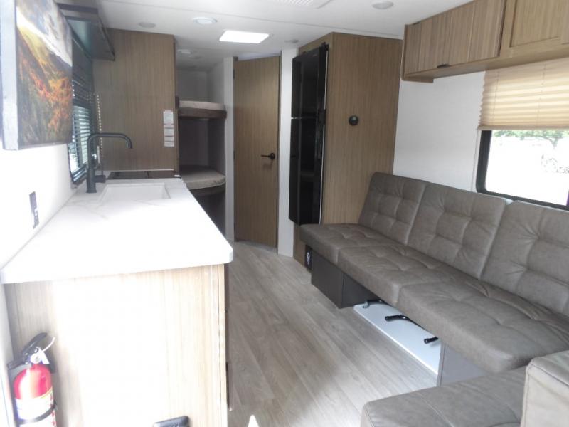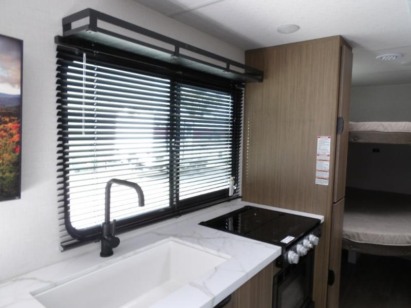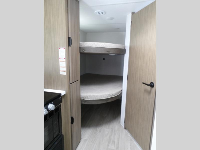 Camping is made easy in this travel trailer with more sleeping space and lots of comforts! The kids or your guests will enjoy the double-size bunks in the back, along with the full bath close by for easy nighttime use. You'll have the front private bedroom with a king bed all to yourselves, and there are dual bedroom wardrobes to keep your space neat and clean. Everyone can meet in the combined kitchen and living room to relax on the super U-lounge with a removable table while the chef of your group makes breakfast on the two burner cooktop. There is also a microwave oven for quick meals, plus a pantry and refrigerator for food storage!