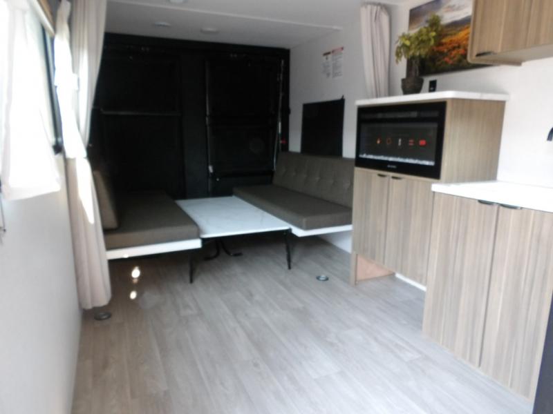 Make the most of your vacations with this MAX toy hauler! The 14' garage area includes dual sofa sleepers with a table in between to dine at, plus a 3,000 lb. ramp door for easy unloading. Enjoy the fireplace for a cozy evening indoors while your dinner is cooking on the three burner cooktop or being heated up in the microwave. After a fun day of trail riding, you can clean the mud out of your hair with the 30" x 36" shower with a skylight in the full bathroom. The front private bedroom has a king bed to lay your head on at night, shoe storage under the bed, a walk-in closet, and wardrobes on either side of the bed for even more clothing storage space.