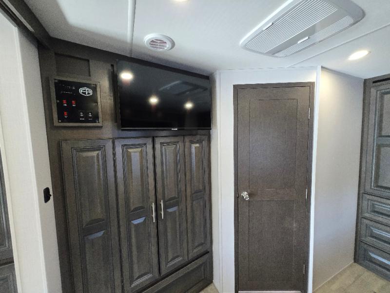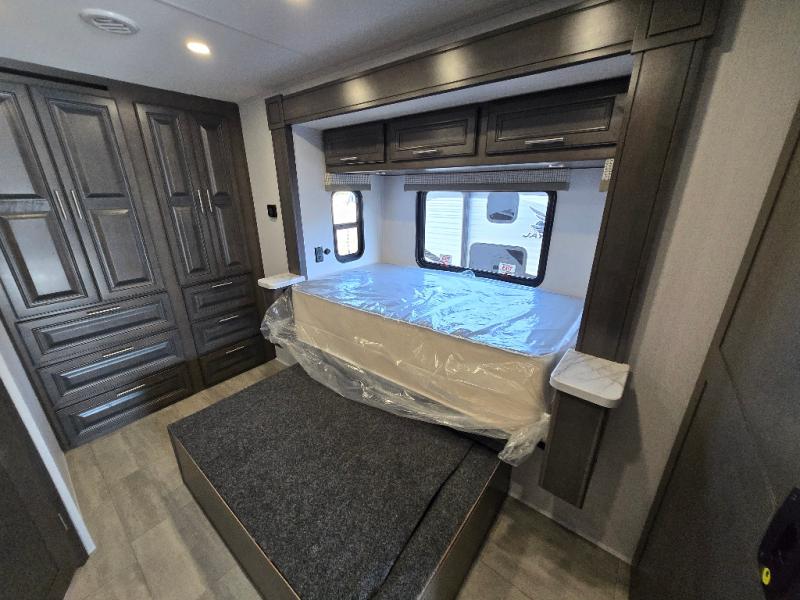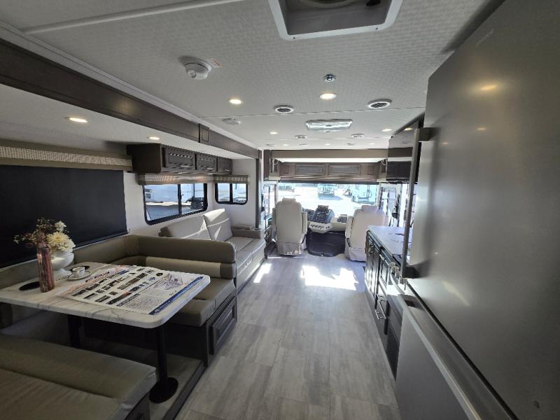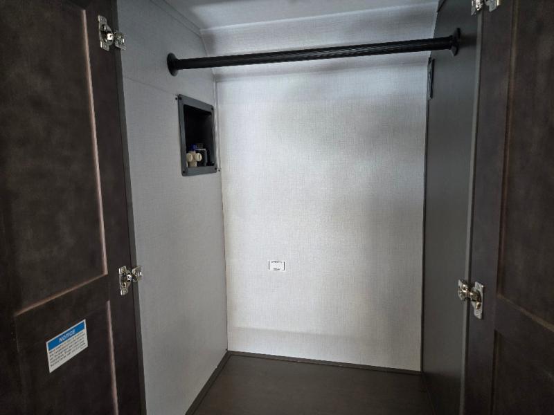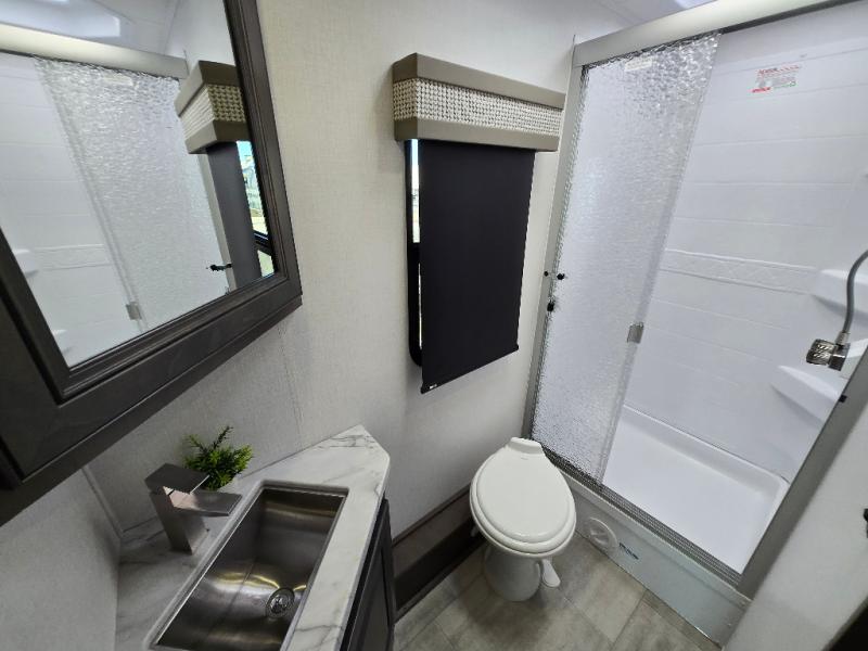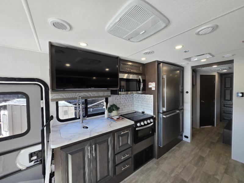 This motorhome is more than just a couple's coach; It's a home on wheels with room for you and even some guests to embark on great adventures. The hide-a-bed sofa and Dream Dinette slide not only offer comfortable places to eat meals and relax but also transform into extra sleeping spaces. You will have your own privacy in the rear master bedroom with a queen bed slide and even a fireplace over the 32" LED Smart TV to enjoy movies in the warmth of this room on those chilly nights. The master bathroom gives you all the comfort you need just a few steps from your bed so you can take a shower and easily get changed. The chef can keep everyone's bellies full of delicious meals with the three-burner cooktop, the stainless steel residential refrigerator, and the pantry with shelves, plus there is a stainless steel microwave for popcorn on movie night!
