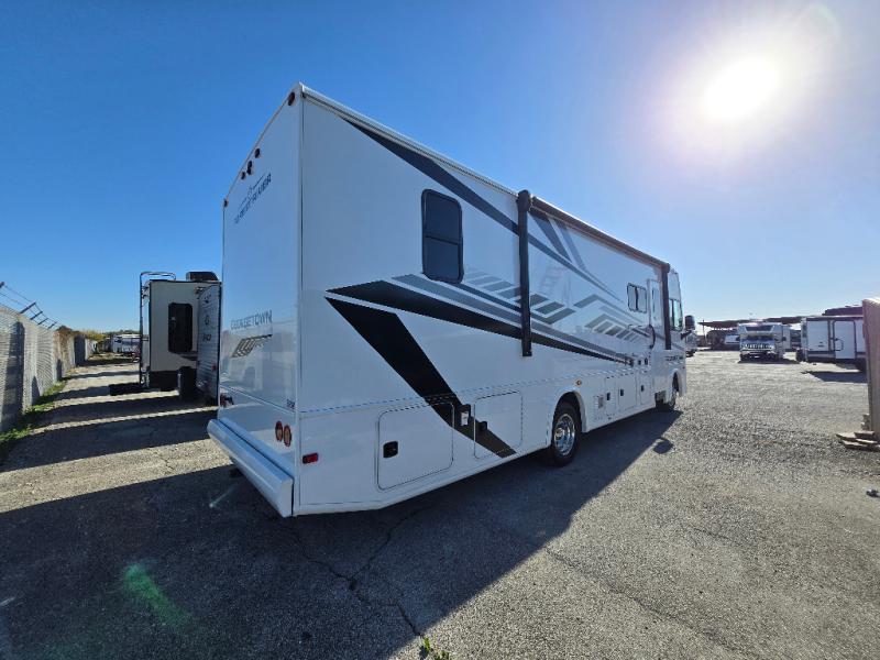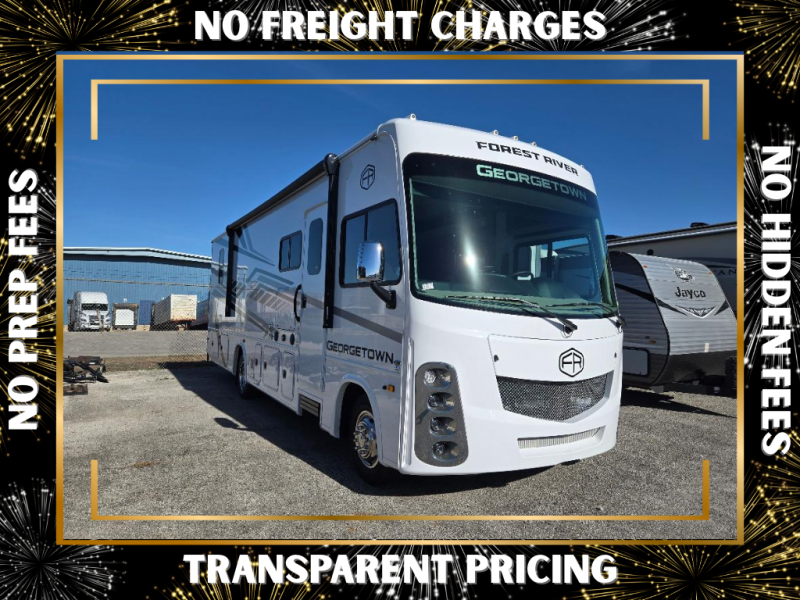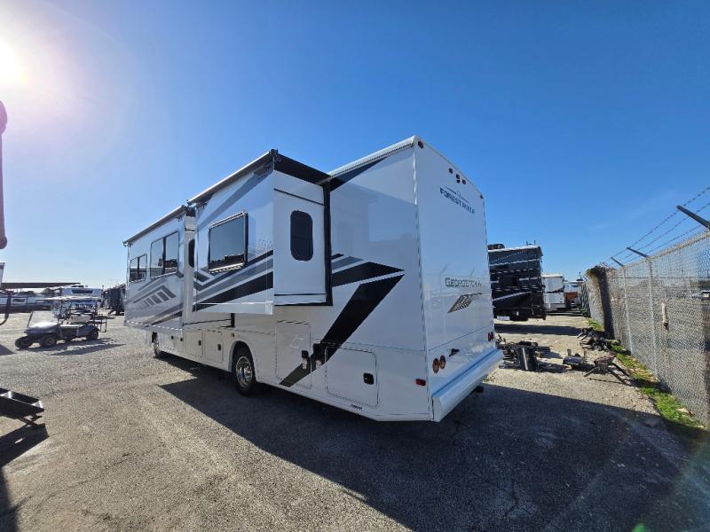These Forest River Georgetown 3 Series Class A gas motorhomes have been engineered for the road and designed for the driver! Their construction consists of a multi-layered laminated roof system that includes aluminum framing, a crowned fiberglass roof, and block foam insulation. The vacuum bonded gel coated sidewalls, the front cockpit steel structure system and the steel firewall are sure to help with durability and stability. With a hydraulic 4-point leveling system, you can be sure your unit will stay level everywhere you set up. The MORryde 1 1/2" steel truss upfit chassis will hold your unit together for years of fun. A few key features you will appreciate having include a 360 Plus Winegard WiFi to stay connected, a Sony 10" entertainment system to play your favorite tunes, and an exterior solar panel with a controller for off-grid capabilities. Come find your favorite one today!