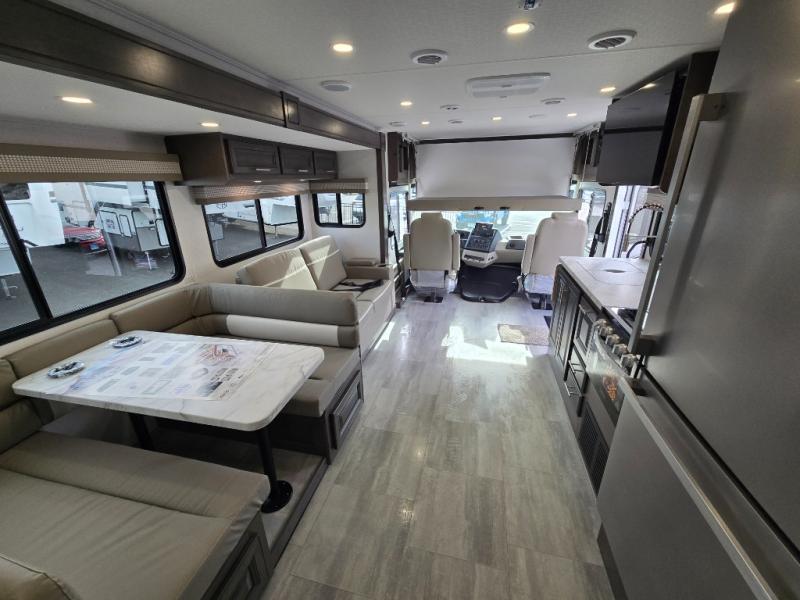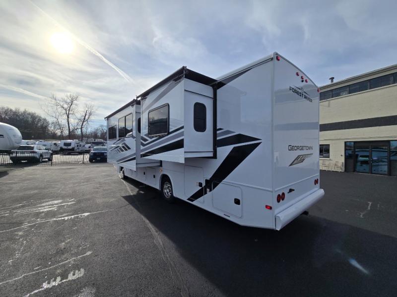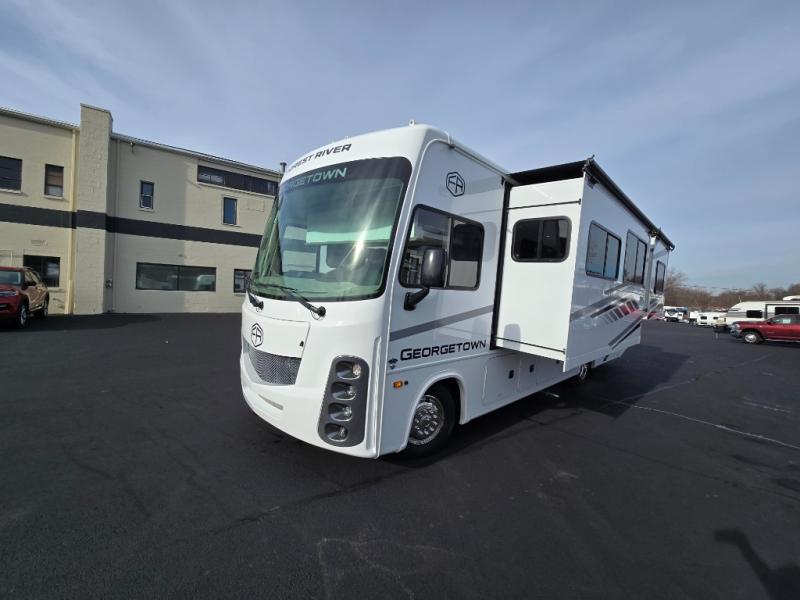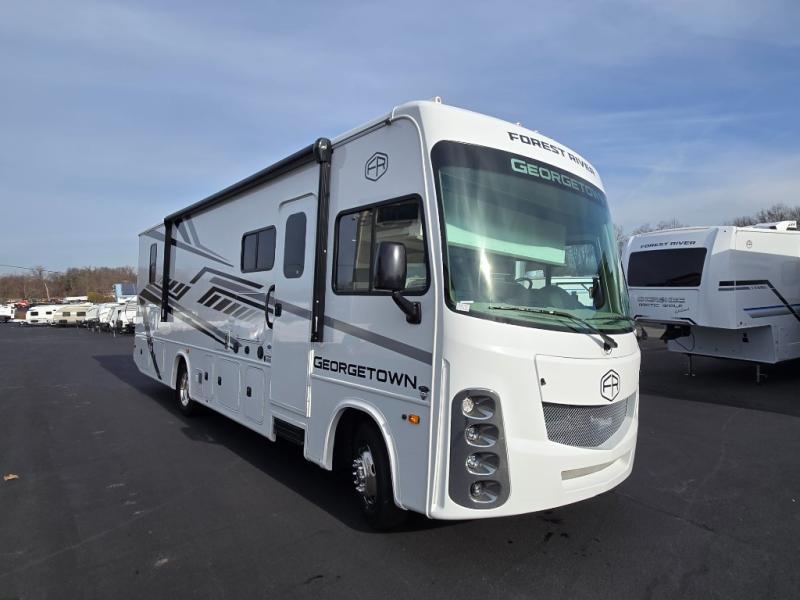 These Forest River Georgetown 3 Series Class A gas motorhomes have been engineered for the road and designed for the driver! Their construction consists of a multi-layered laminated roof system that includes aluminum framing, a crowned fiberglass roof, and block foam insulation. The vacuum bonded gel coated sidewalls, the front cockpit steel structure system and the steel firewall are sure to help with durability and stability. With a hydraulic 4-point leveling system, you can be sure your unit will stay level everywhere you set up. The MORryde 1 1/2" steel truss upfit chassis will hold your unit together for years of fun. A few key features you will appreciate having include a 360 Plus Winegard WiFi to stay connected, a Sony 10" entertainment system to play your favorite tunes, and an exterior solar panel with a controller for off-grid capabilities. Come find your favorite one today!
