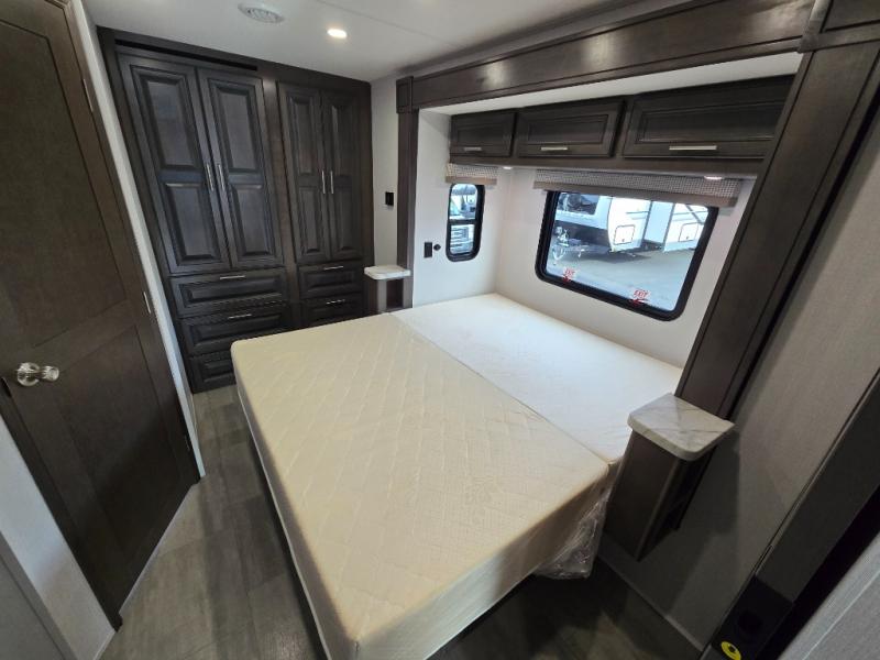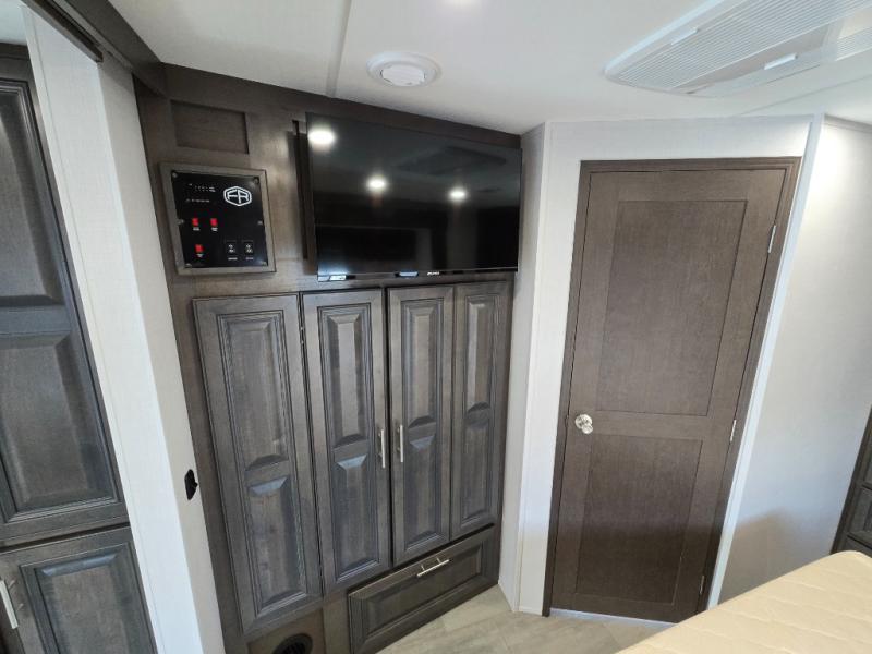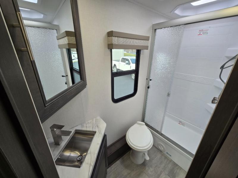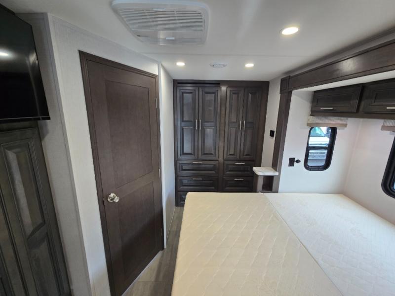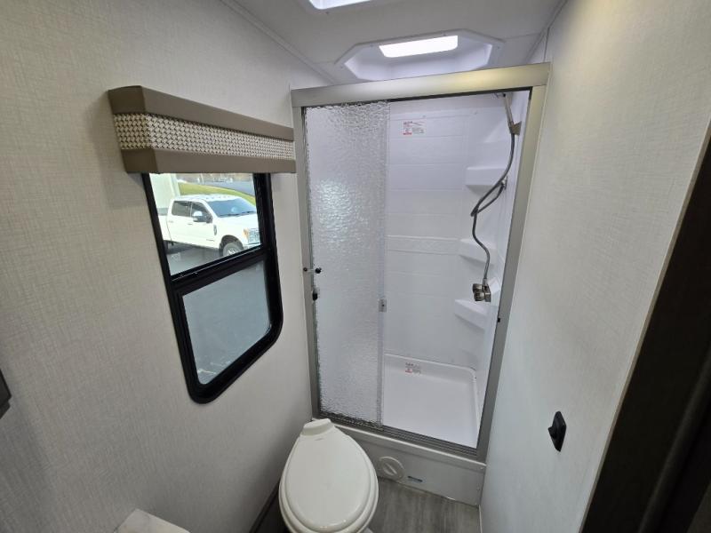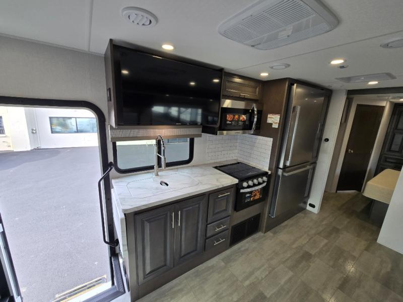 This motorhome is more than just a couple's coach; It's a home on wheels with room for you and even some guests to embark on great adventures. The hide-a-bed sofa and Dream Dinette slide not only offer comfortable places to eat meals and relax but also transform into extra sleeping spaces. You will have your own privacy in the rear master bedroom with a queen bed slide and even a fireplace over the 32" LED Smart TV to enjoy movies in the warmth of this room on those chilly nights. The master bathroom gives you all the comfort you need just a few steps from your bed so you can take a shower and easily get changed. The chef can keep everyone's bellies full of delicious meals with the three-burner cooktop, the stainless steel residential refrigerator, and the pantry with shelves, plus there is a stainless steel microwave for popcorn on movie night!