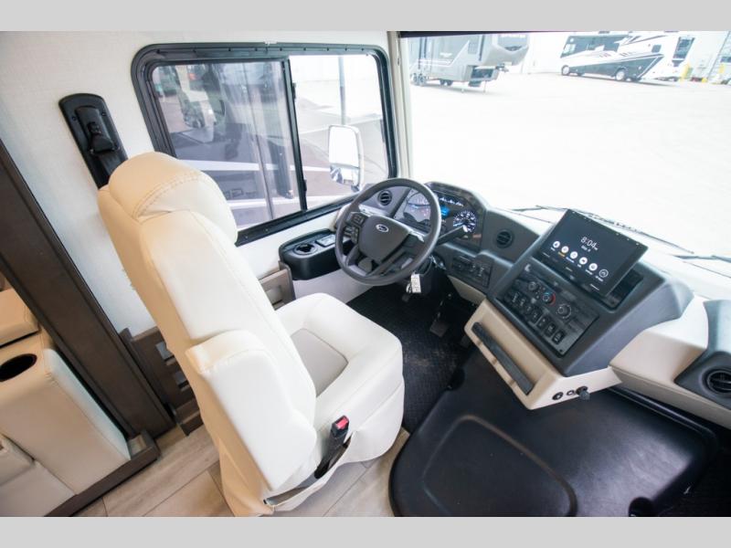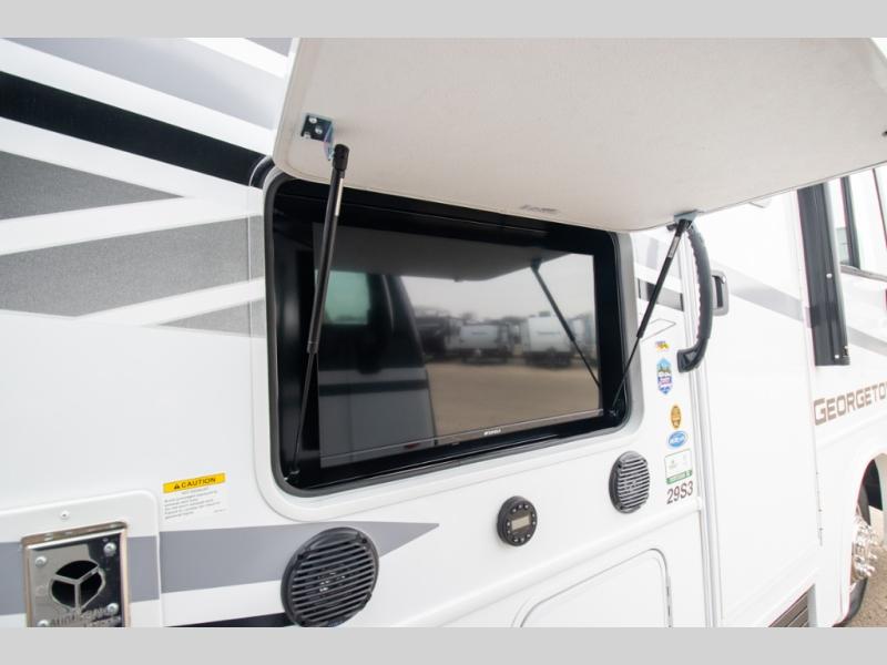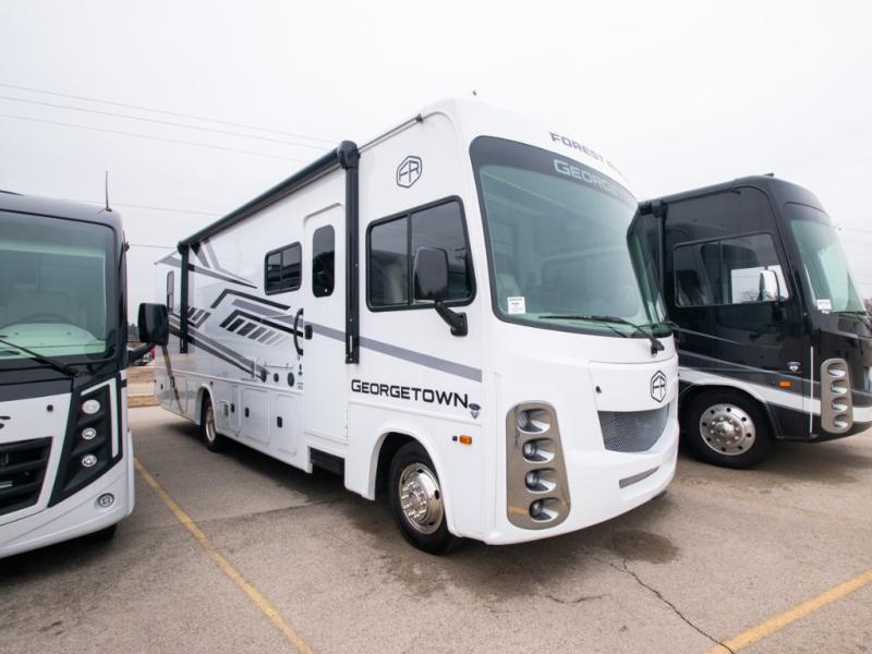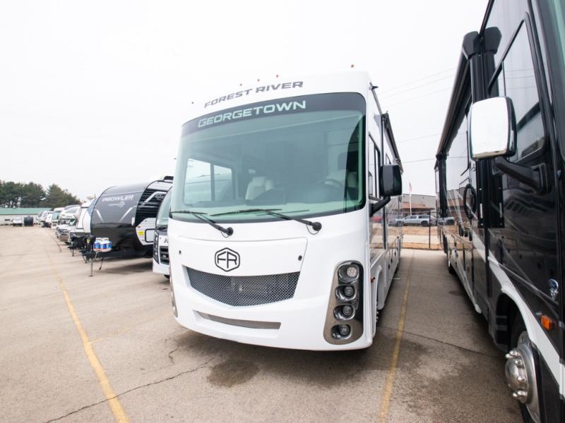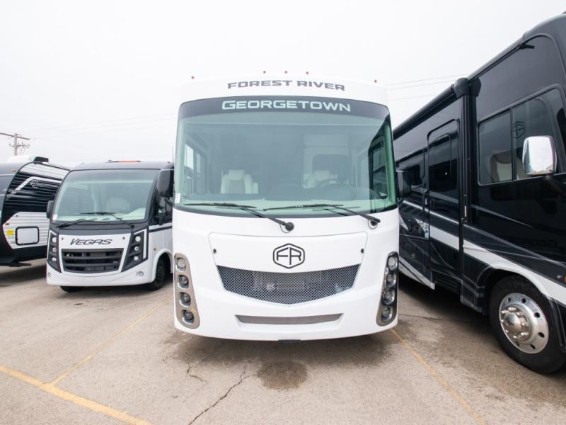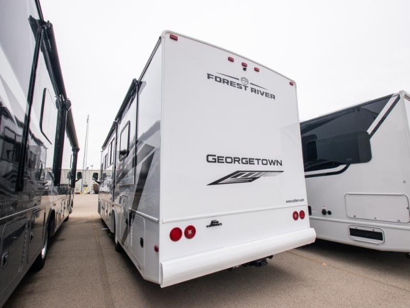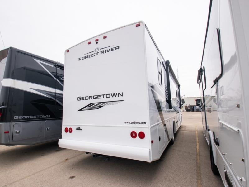 These Forest River Georgetown 3 Series Class A gas motorhomes have been engineered for the road and designed for the driver! Their construction consists of a multi-layered laminated roof system that includes aluminum framing, a crowned fiberglass roof, and block foam insulation. The vacuum bonded gel coated sidewalls, the front cockpit steel structure system and the steel firewall are sure to help with durability and stability. With a hydraulic 4-point leveling system, you can be sure your unit will stay level everywhere you set up. The MORryde 1 1/2" steel truss upfit chassis will hold your unit together for years of fun. A few key features you will appreciate having include a 360 Plus Winegard WiFi to stay connected, a Sony 10" entertainment system to play your favorite tunes, and an exterior solar panel with a controller for off-grid capabilities. Come find your favorite one today!