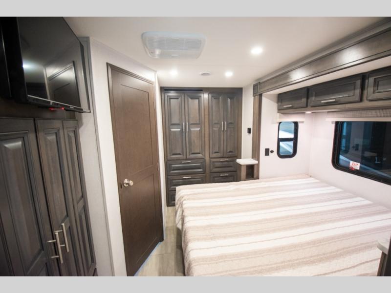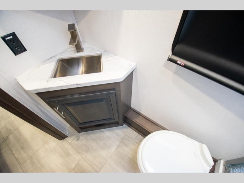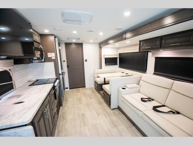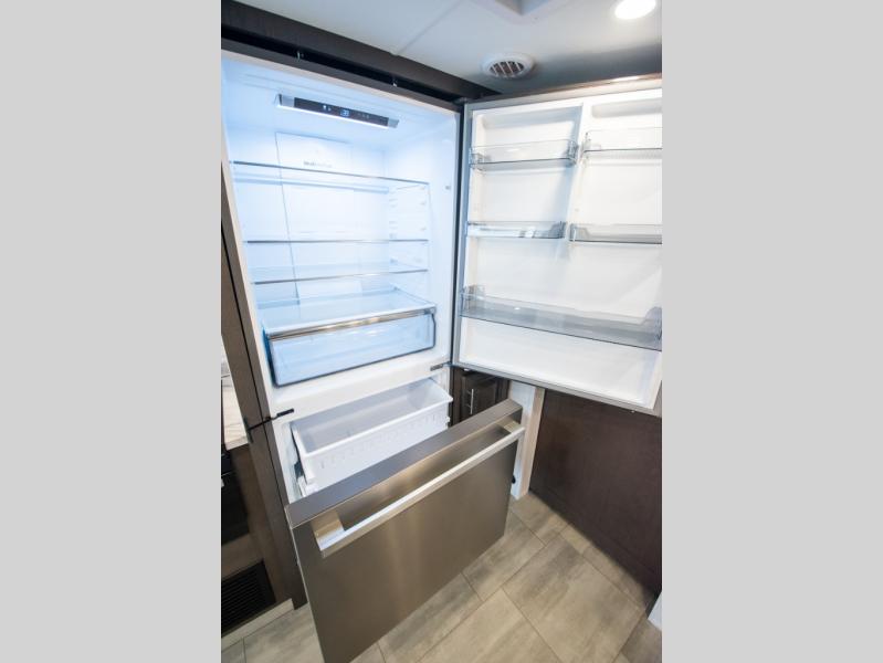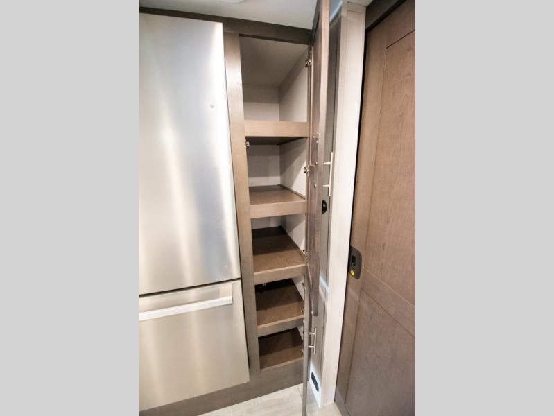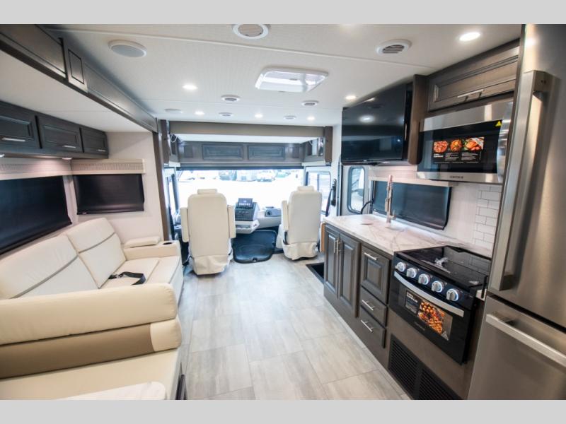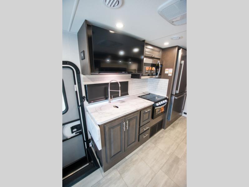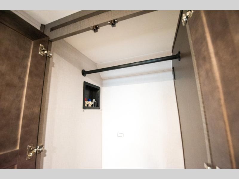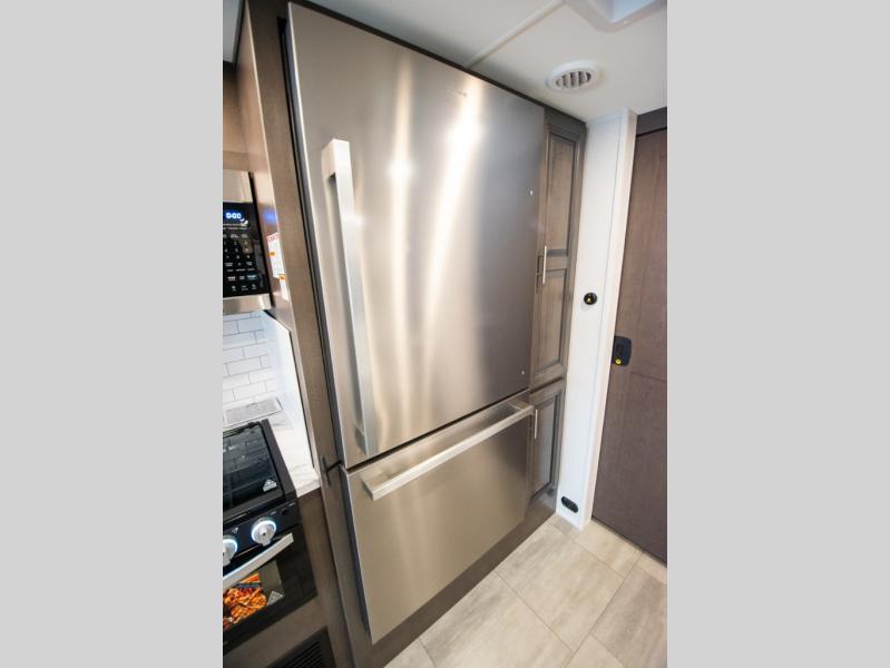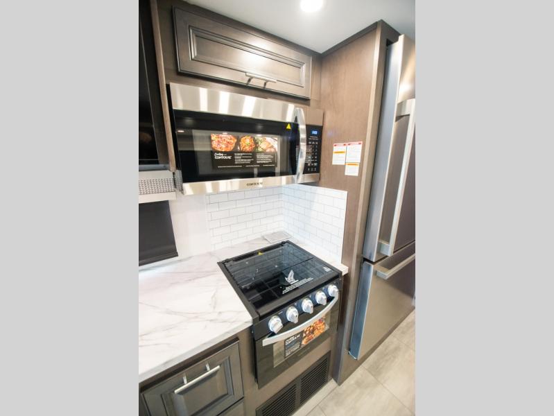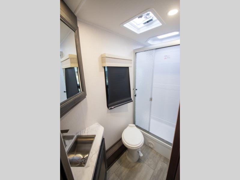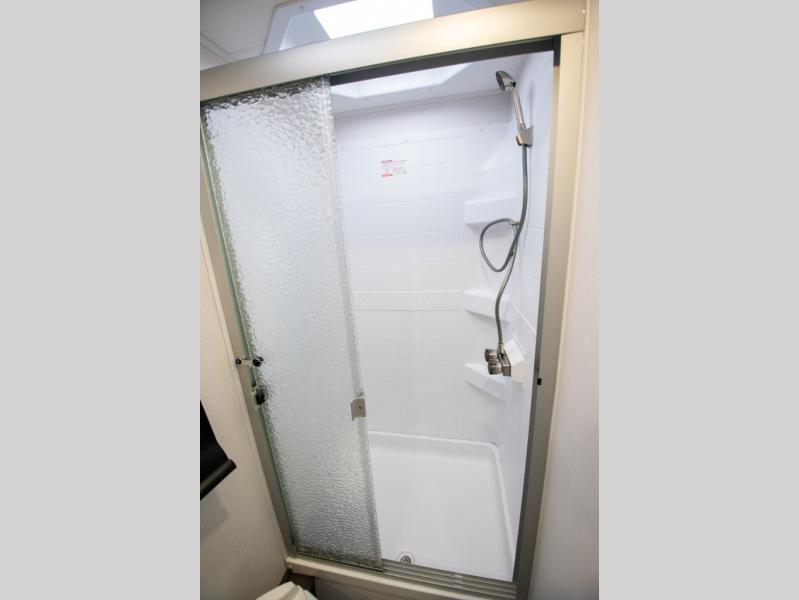 This motorhome is more than just a couple's coach; It's a home on wheels with room for you and even some guests to embark on great adventures. The hide-a-bed sofa and Dream Dinette slide not only offer comfortable places to eat meals and relax but also transform into extra sleeping spaces. You will have your own privacy in the rear master bedroom with a queen bed slide and even a fireplace over the 32" LED Smart TV to enjoy movies in the warmth of this room on those chilly nights. The master bathroom gives you all the comfort you need just a few steps from your bed so you can take a shower and easily get changed. The chef can keep everyone's bellies full of delicious meals with the three-burner cooktop, the stainless steel residential refrigerator, and the pantry with shelves, plus there is a stainless steel microwave for popcorn on movie night!