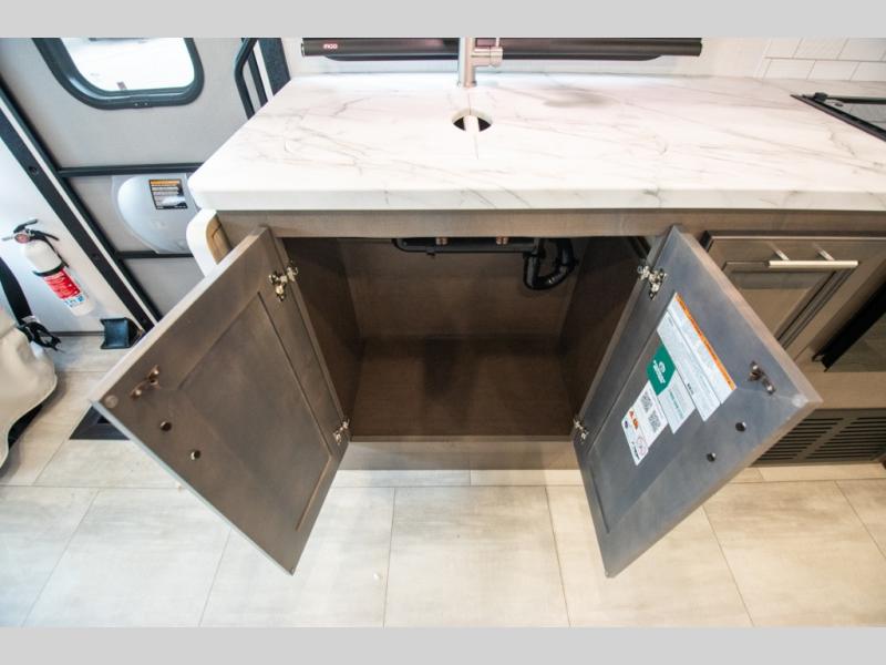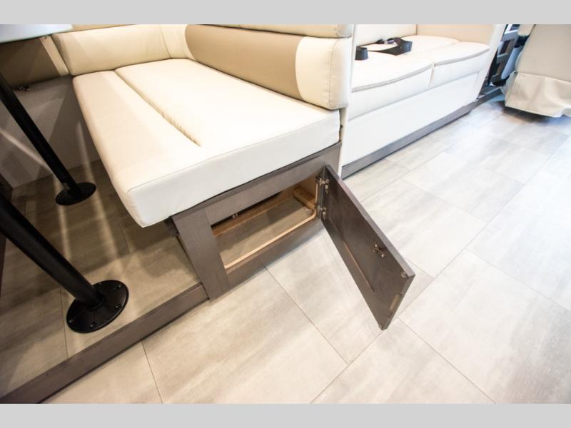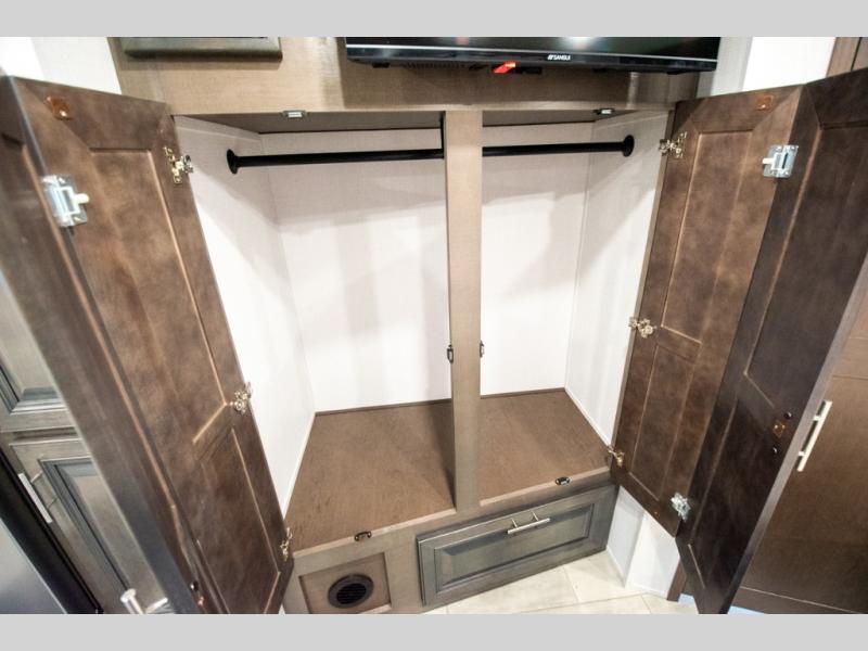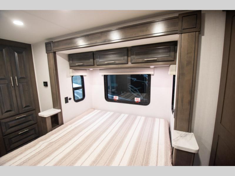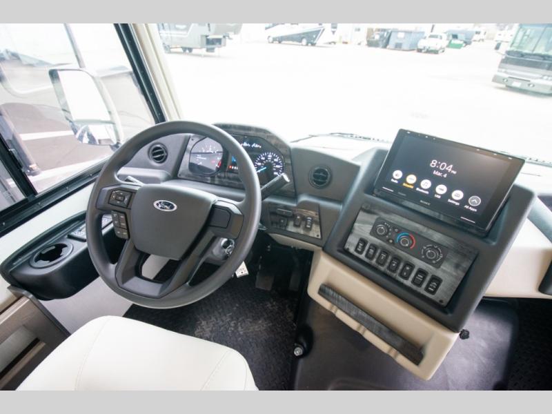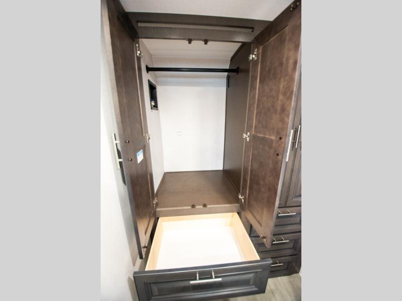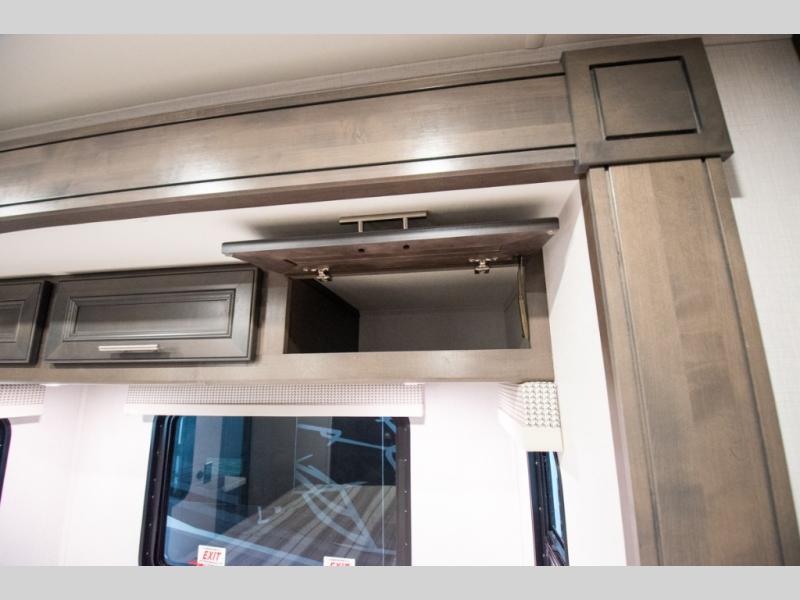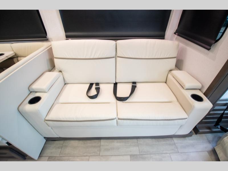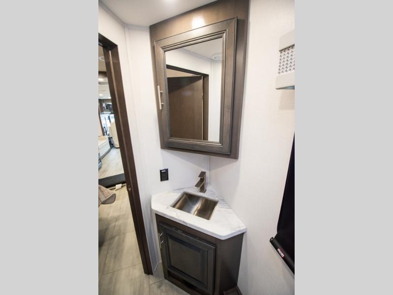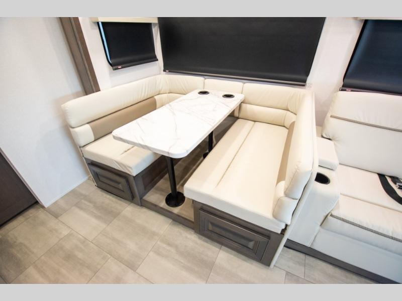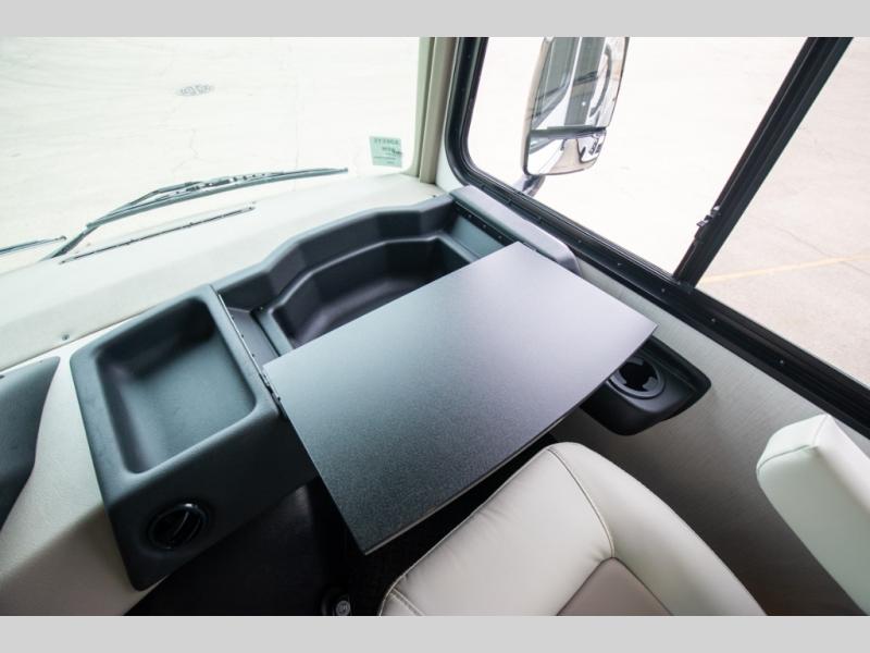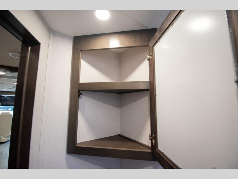 This motorhome is more than just a couple's coach; It's a home on wheels with room for you and even some guests to embark on great adventures. The hide-a-bed sofa and Dream Dinette slide not only offer comfortable places to eat meals and relax but also transform into extra sleeping spaces. You will have your own privacy in the rear master bedroom with a queen bed slide and even a fireplace over the 32" LED Smart TV to enjoy movies in the warmth of this room on those chilly nights. The master bathroom gives you all the comfort you need just a few steps from your bed so you can take a shower and easily get changed. The chef can keep everyone's bellies full of delicious meals with the three-burner cooktop, the stainless steel residential refrigerator, and the pantry with shelves, plus there is a stainless steel microwave for popcorn on movie night!
