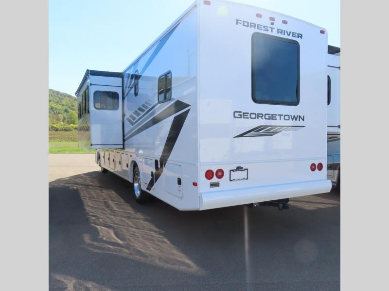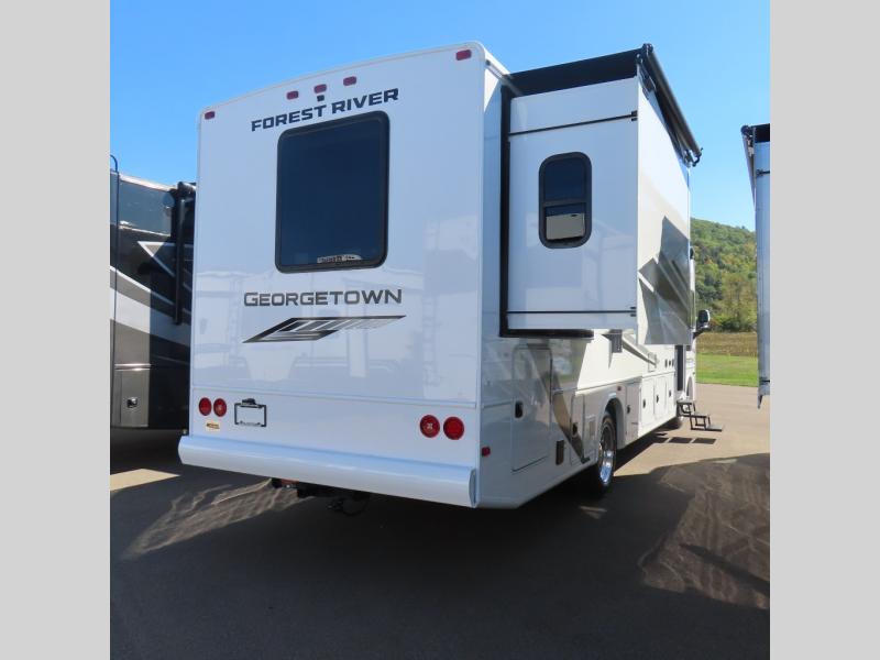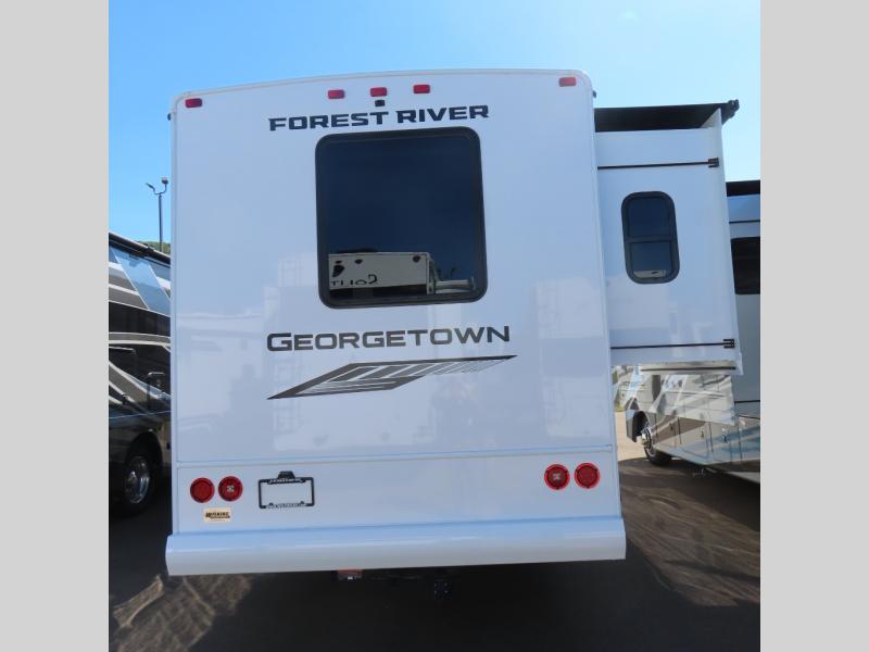 These Forest River Georgetown 3 Series Class A gas motorhomes have been engineered for the road and designed for the driver! Their construction consists of a multi-layered laminated roof system that includes aluminum framing, a crowned fiberglass roof, and block foam insulation. The vacuum bonded gel coated sidewalls, the front cockpit steel structure system and the steel firewall are sure to help with durability and stability. With a hydraulic 4-point leveling system, you can be sure your unit will stay level everywhere you set up. The MORryde 1 1/2" steel truss upfit chassis will hold your unit together for years of fun. A few key features you will appreciate having include a 360 Plus Winegard WiFi to stay connected, a Sony 10" entertainment system to play your favorite tunes, and an exterior solar panel with a controller for off-grid capabilities. Come find your favorite one today!