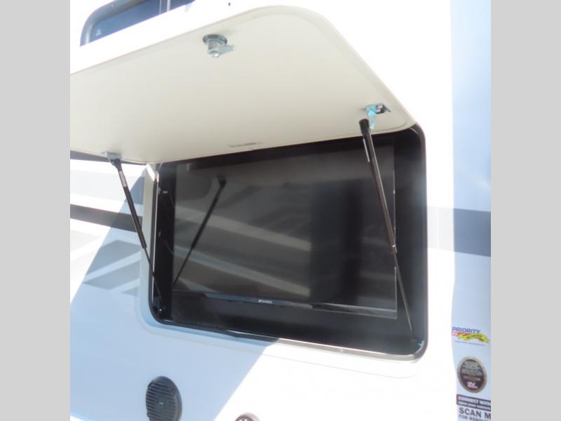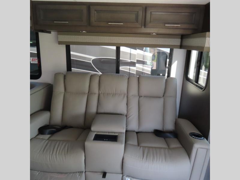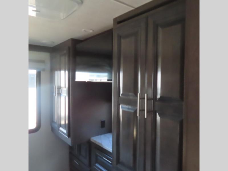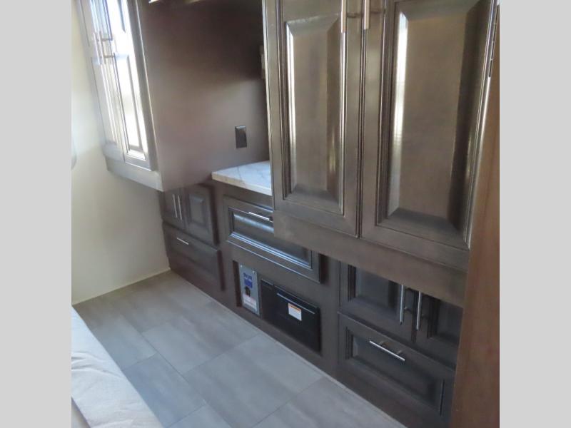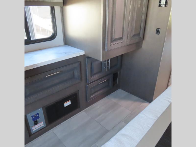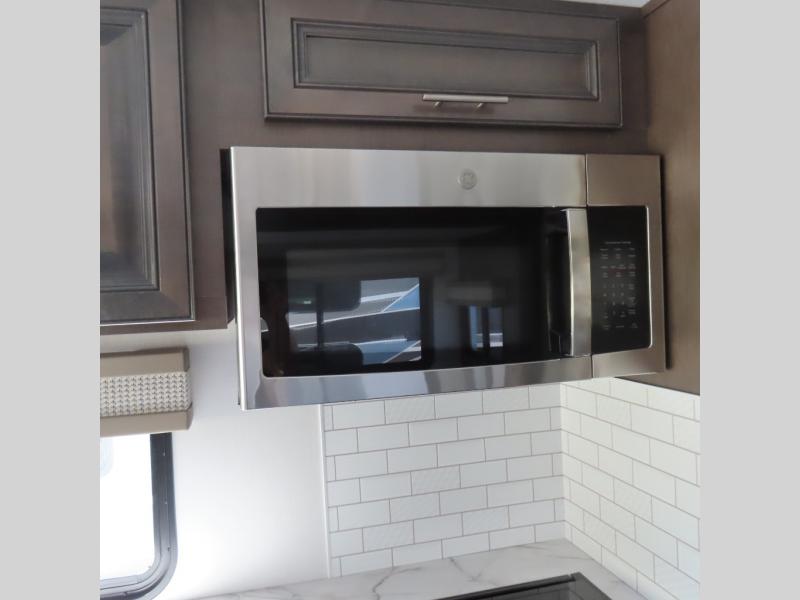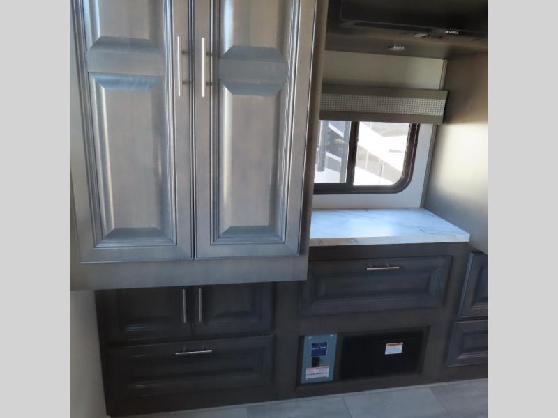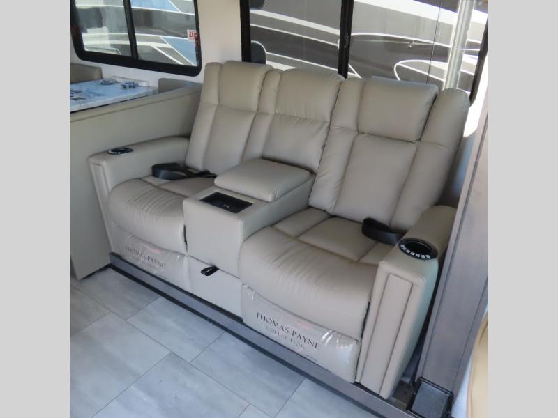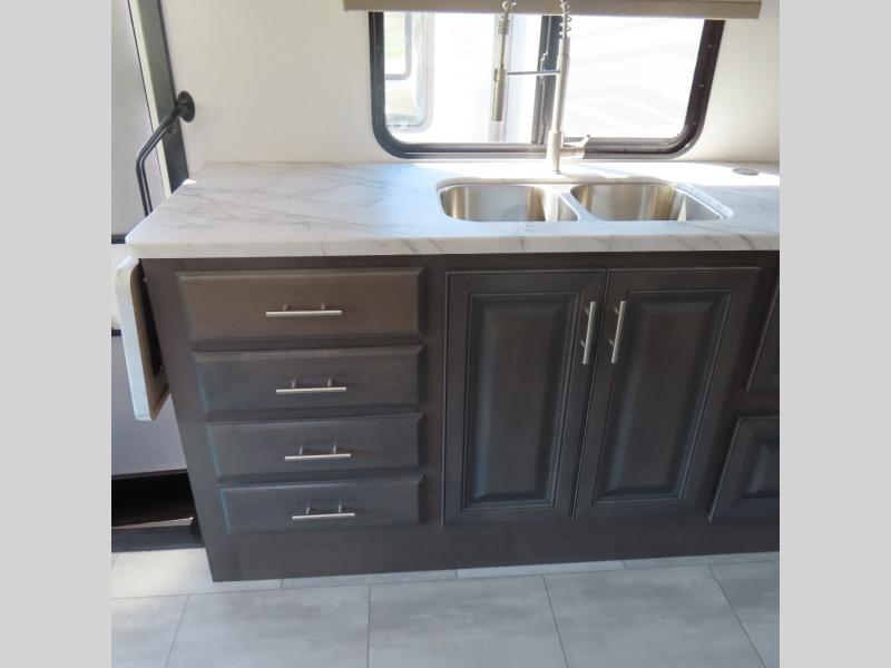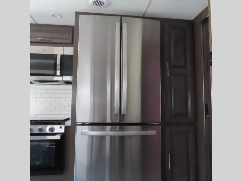 This motorhome is more than just a couple's coach; It's a home on wheels with room for three to four more guests for never ending fun. The hide-a-bed sofa and Dream Dinette slide not only offer comfortable places to eat meals and relax but also transform into extra sleeping spaces. You will have your own privacy in the rear private bedroom with a king bed slide and two closets on either side of a dresser with a TV. The separated bathroom makes it easy for one person to freshen up in the shower while another uses the private toilet and sink with two linen closets for your towels. The chef can keep everyone's bellies full of delicious meals with the three-burner cooktop, the stainless steel 3-door residential refrigerator, and the pantry with shelves, plus there is a stainless steel microwave for popcorn on movie night!