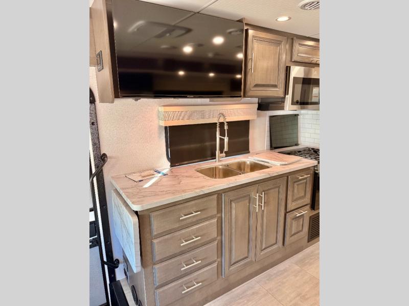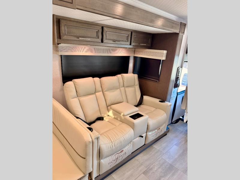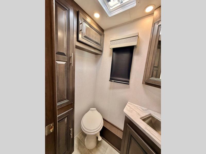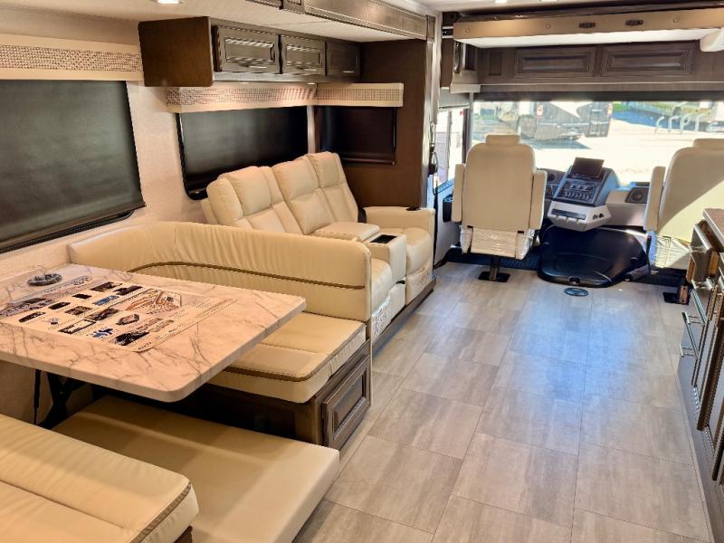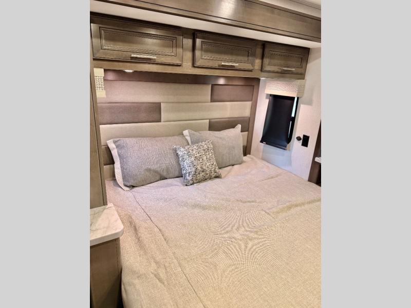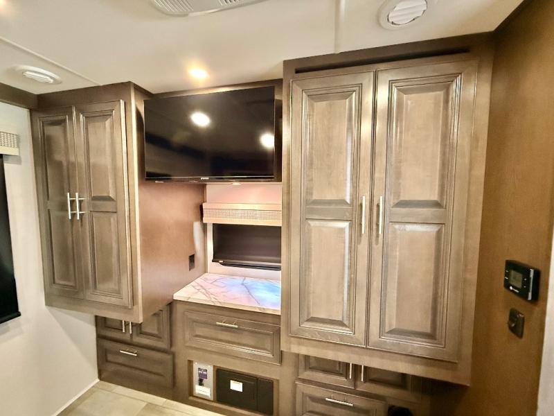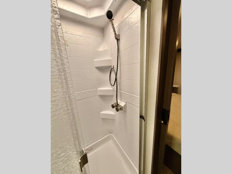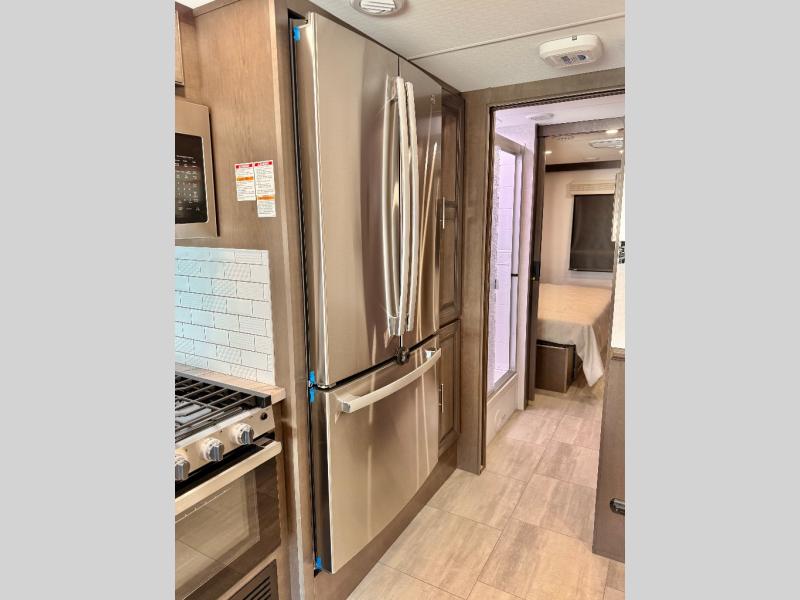 This motorhome is more than just a couple's coach; It's a home on wheels with room for three to four more guests for never ending fun. The hide-a-bed sofa and Dream Dinette slide not only offer comfortable places to eat meals and relax but also transform into extra sleeping spaces. You will have your own privacy in the rear private bedroom with a king bed slide and two closets on either side of a dresser with a TV. The separated bathroom makes it easy for one person to freshen up in the shower while another uses the private toilet and sink with two linen closets for your towels. The chef can keep everyone's bellies full of delicious meals with the three-burner cooktop, the stainless steel 3-door residential refrigerator, and the pantry with shelves, plus there is a stainless steel microwave for popcorn on movie night!