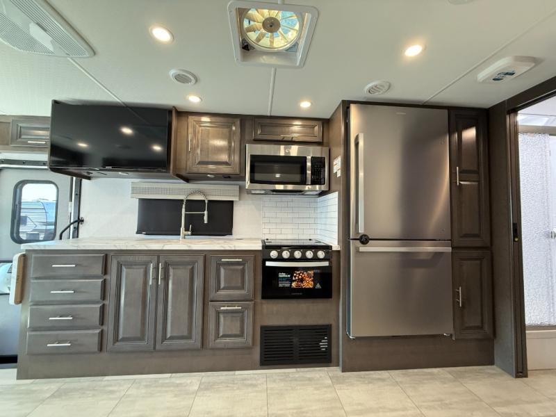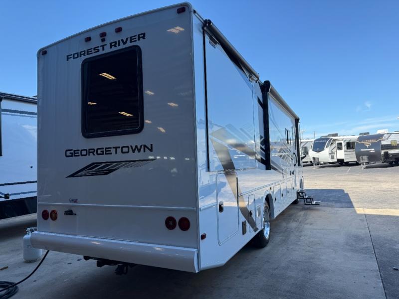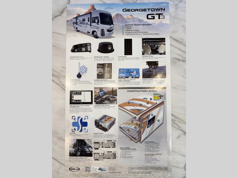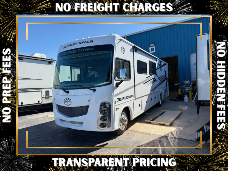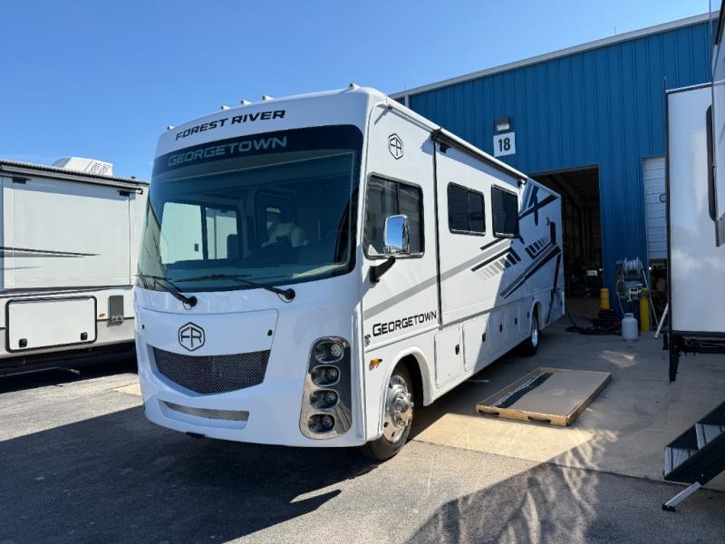 These Forest River Georgetown 3 Series Class A gas motorhomes have been engineered for the road and designed for the driver! Their construction consists of a multi-layered laminated roof system that includes aluminum framing, a crowned fiberglass roof, and block foam insulation. The vacuum bonded gel coated sidewalls, the front cockpit steel structure system and the steel firewall are sure to help with durability and stability. With a hydraulic 4-point leveling system, you can be sure your unit will stay level everywhere you set up. The MORryde 1 1/2" steel truss upfit chassis will hold your unit together for years of fun. A few key features you will appreciate having include a 360 Plus Winegard WiFi to stay connected, a Sony 10" entertainment system to play your favorite tunes, and an exterior solar panel with a controller for off-grid capabilities. Come find your favorite one today!