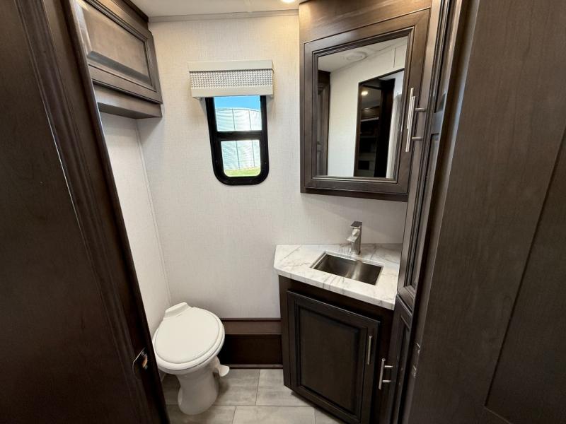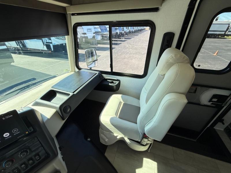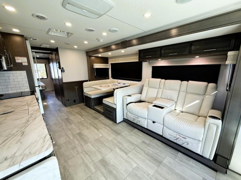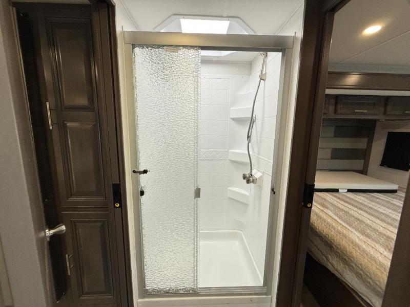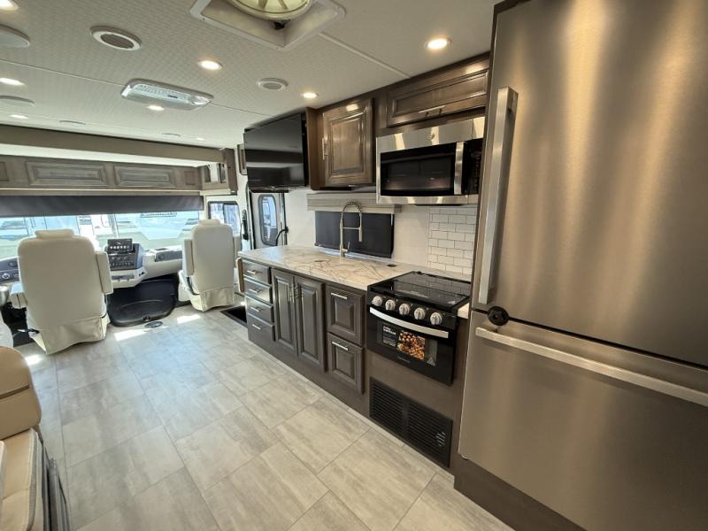 This motorhome is more than just a couple's coach; It's a home on wheels with room for three to four more guests for never ending fun. The hide-a-bed sofa and Dream Dinette slide not only offer comfortable places to eat meals and relax but also transform into extra sleeping spaces. You will have your own privacy in the rear private bedroom with a king bed slide and two closets on either side of a dresser with a TV. The separated bathroom makes it easy for one person to freshen up in the shower while another uses the private toilet and sink with two linen closets for your towels. The chef can keep everyone's bellies full of delicious meals with the three-burner cooktop, the stainless steel 3-door residential refrigerator, and the pantry with shelves, plus there is a stainless steel microwave for popcorn on movie night!