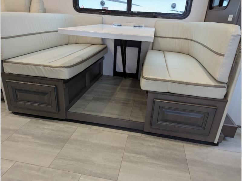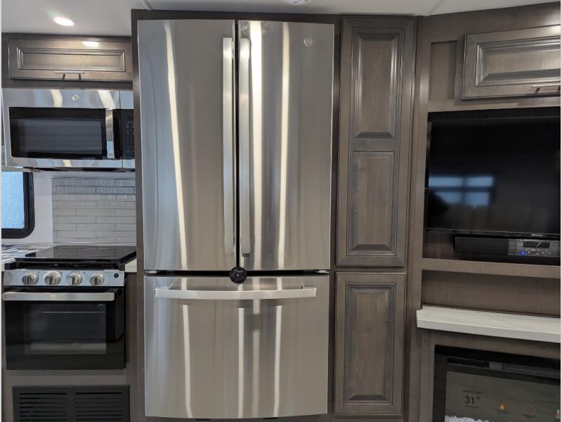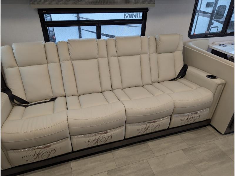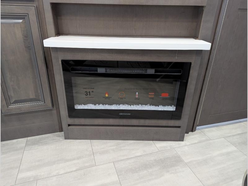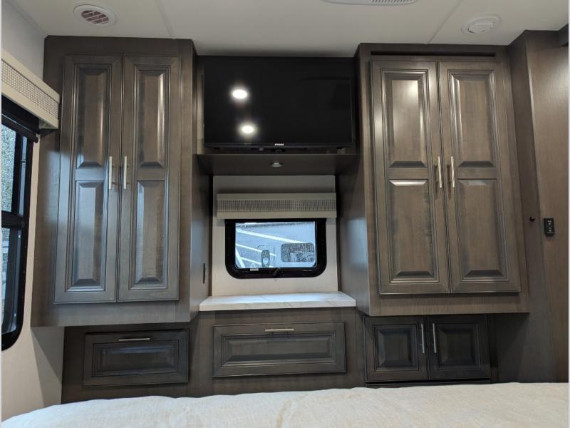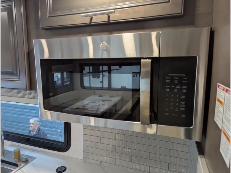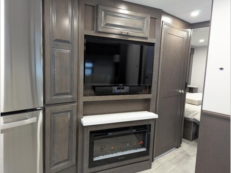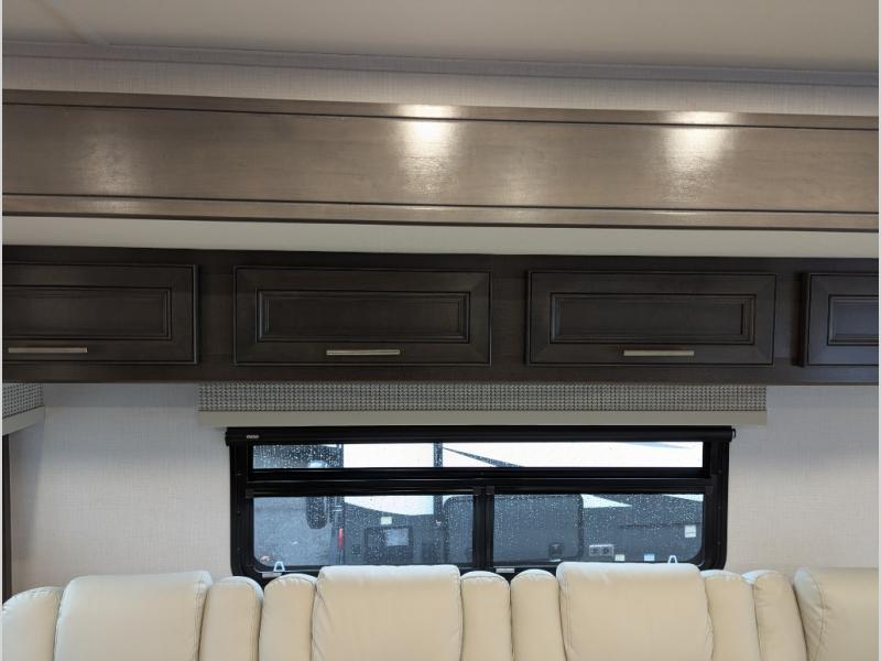 You will love the spacious living entertainment in this motorhome! There is a Thomas Payne 4-person theater seating that reclines with adjustable headrests, heat, massage and has USB outlets. There is also a 5,000 BTU fireplace with a 40" LED TV to watch your favorite movies in true comfort. The kitchen has everything you need to prepare your best home cooked meals including a brush nickel designer faucet with a pull-out spray wand for easy clean up, and you can enjoy all of your meals at the Dream Dinette. You will appreciate having your own private retreat with the rear bedroom which has a 72" x 80" king bed slide across from a dresser with a 32" LED TV, a wardrobe on one side, and another wardrobe on the other with an optional combo washer and dryer. There is also a power front overhead bunk for more sleeping space!
