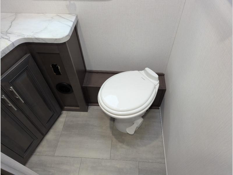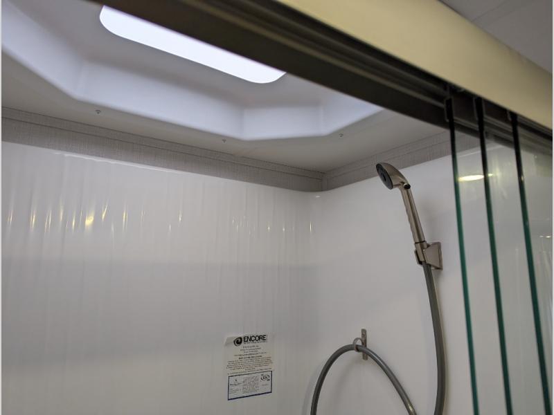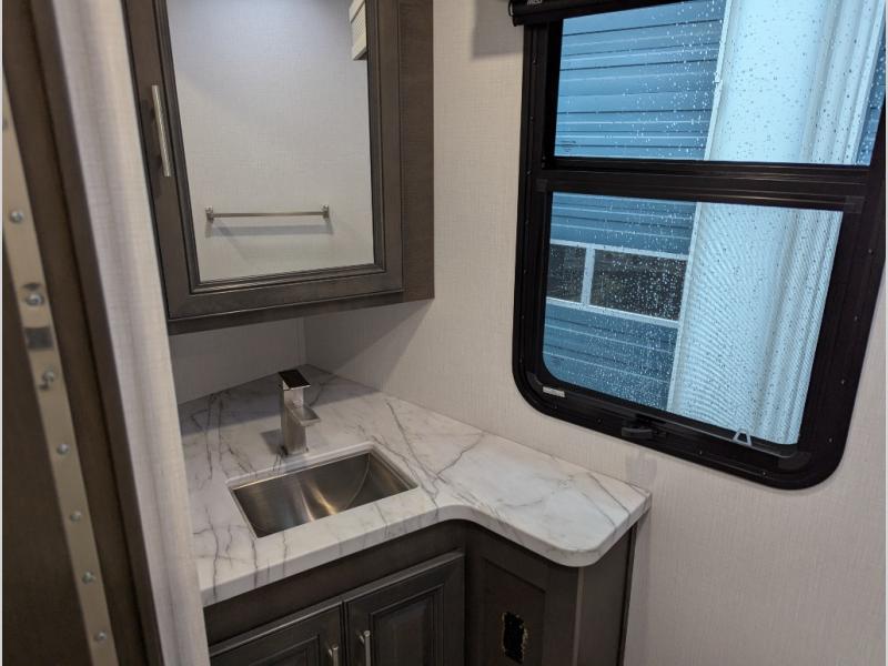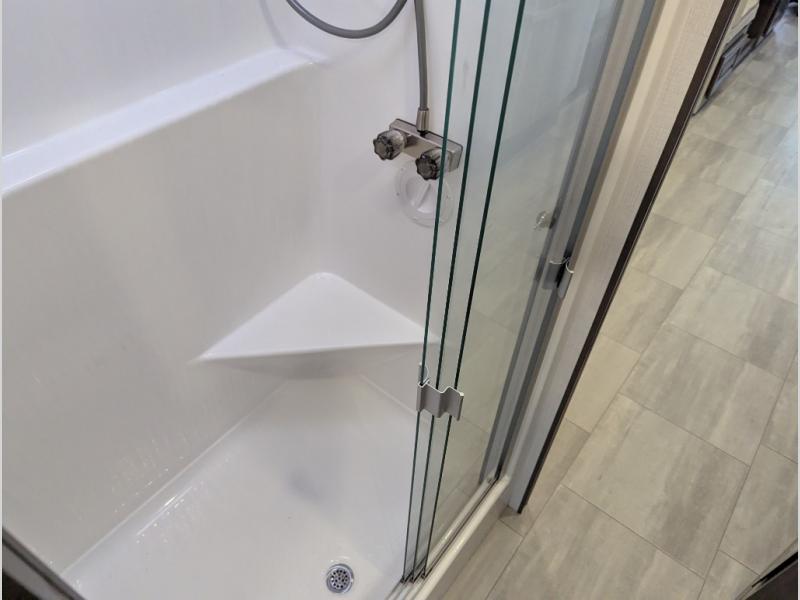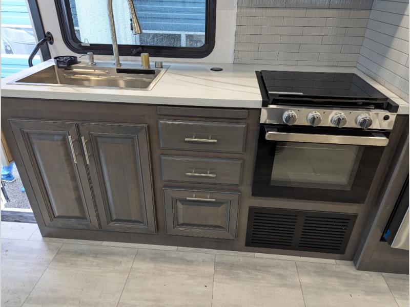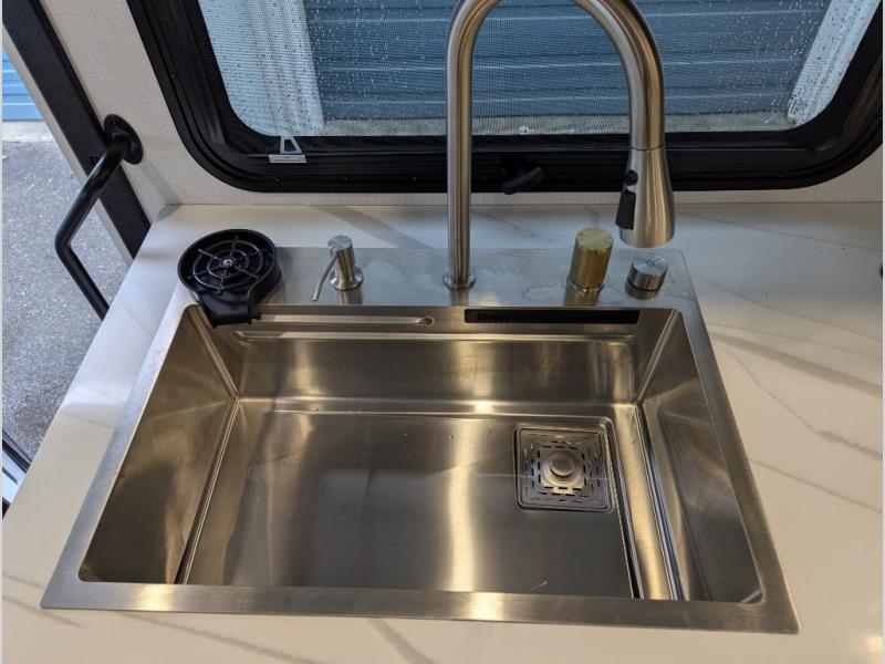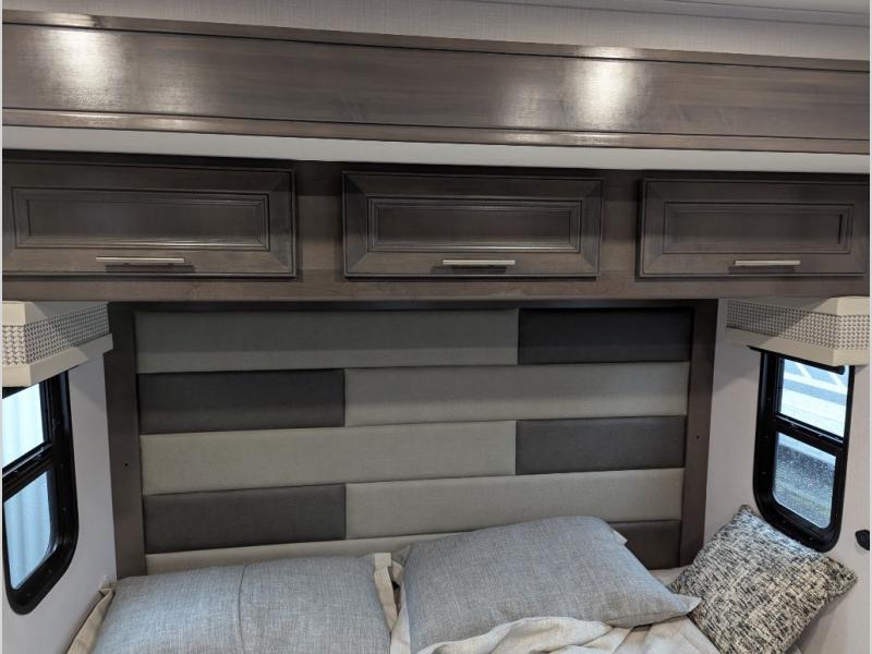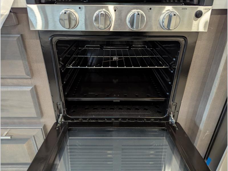You will love the spacious living entertainment in this motorhome! There is a Thomas Payne 4-person theater seating that reclines with adjustable headrests, heat, massage and has USB outlets. There is also a 5,000 BTU fireplace with a 40" LED TV to watch your favorite movies in true comfort. The kitchen has everything you need to prepare your best home cooked meals including a brush nickel designer faucet with a pull-out spray wand for easy clean up, and you can enjoy all of your meals at the Dream Dinette. You will appreciate having your own private retreat with the rear bedroom which has a 72" x 80" king bed slide across from a dresser with a 32" LED TV, a wardrobe on one side, and another wardrobe on the other with an optional combo washer and dryer. There is also a power front overhead bunk for more sleeping space!