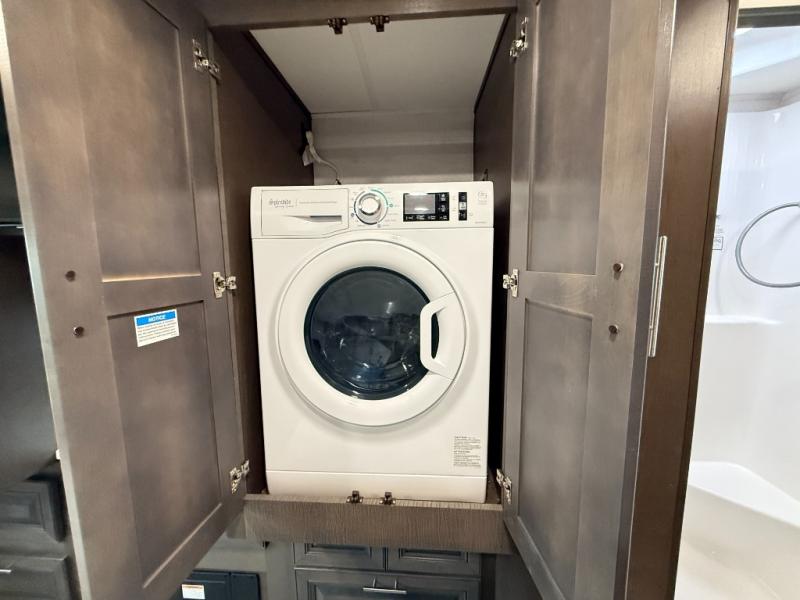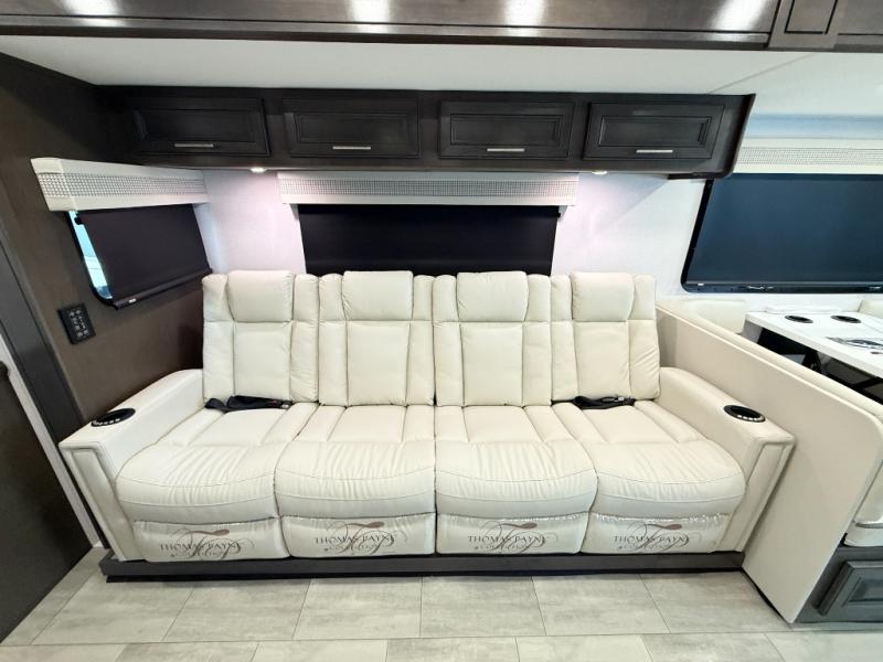 You will love the spacious living entertainment in this motorhome! There is a Thomas Payne 4-person theater seating that reclines with adjustable headrests, heat, massage and has USB outlets. There is also a 5,000 BTU fireplace with a 40" LED TV to watch your favorite movies in true comfort. The kitchen has everything you need to prepare your best home cooked meals including a brush nickel designer faucet with a pull-out spray wand for easy clean up, and you can enjoy all of your meals at the Dream Dinette. You will appreciate having your own private retreat with the rear bedroom which has a 72" x 80" king bed slide across from a dresser with a 32" LED TV, a wardrobe on one side, and another wardrobe on the other with an optional combo washer and dryer. There is also a power front overhead bunk for more sleeping space!