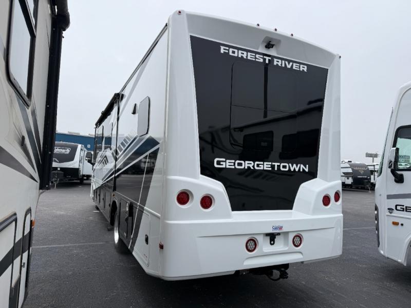 A spacious design and true luxury come together to create these Forest River Georgetown 5 Series Class A gas motorhomes! Their solid surface kitchen countertops, day and night shades throughout, and designer bedspread will have you feeling right at home. The color side and rear cameras help to prevent any dings or bumps while you travel, and the automatic hydraulic leveling jacks will keep your unit leveled wherever you set up. Durable construction consists of a crowned roof, 2" aluminum framed vacuum bonded gel coated sidewalls, plus high density block foam insulation that will allow you to travel at any time of the year. You will appreciate the 50 Amp service, two house batteries, and 6,000-watt Yamaha generator to keep you powered up. An outside shower is also included on all models, along with rotocast storage compartments with drains, a power awning, and so much more!
