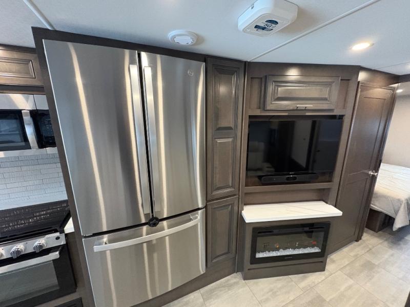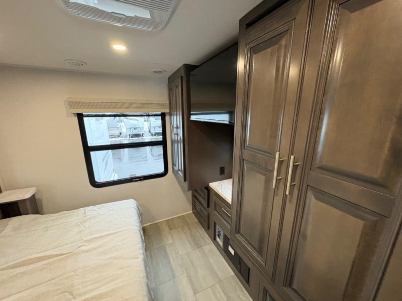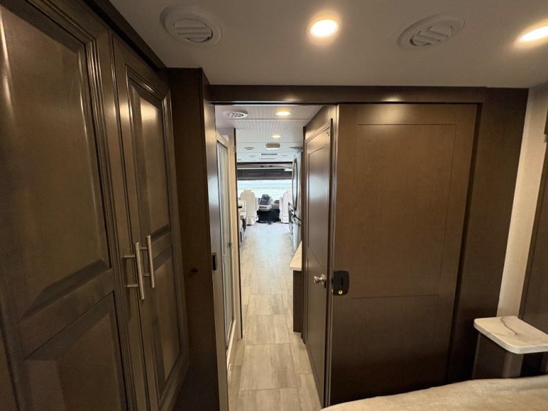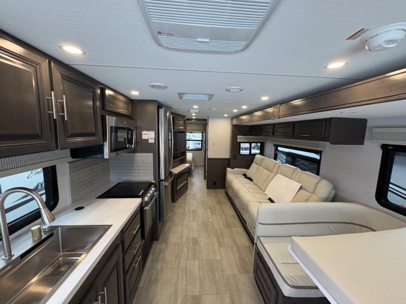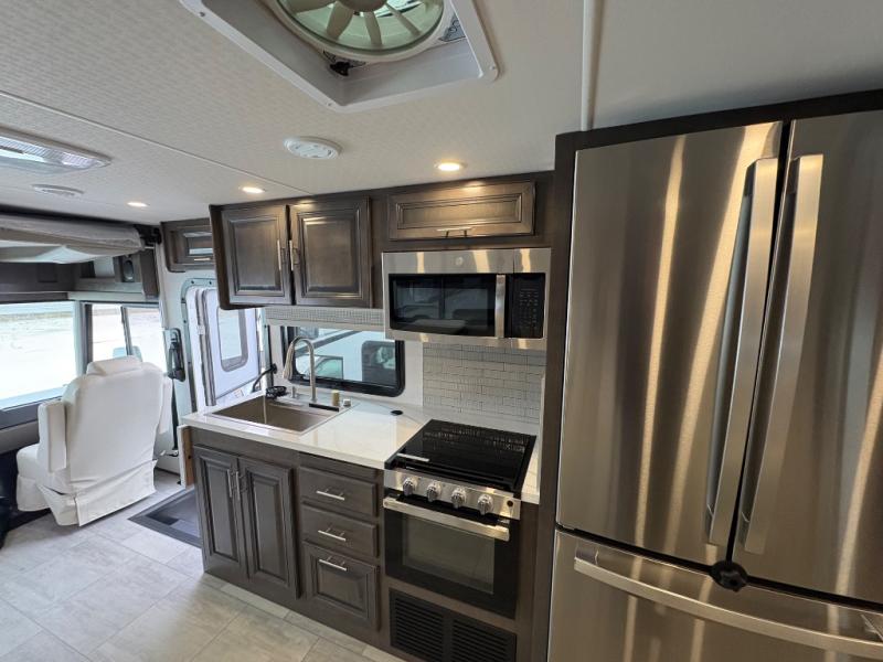 You will love the spacious living entertainment in this motorhome! There is a Thomas Payne 4-person theater seating that reclines with adjustable headrests, heat, massage and has USB outlets. There is also a 5,000 BTU fireplace with a 40" LED TV to watch your favorite movies in true comfort. The kitchen has everything you need to prepare your best home cooked meals including a brush nickel designer faucet with a pull-out spray wand for easy clean up, and you can enjoy all of your meals at the Dream Dinette. You will appreciate having your own private retreat with the rear bedroom which has a 72" x 80" king bed slide across from a dresser with a 32" LED TV, a wardrobe on one side, and another wardrobe on the other with an optional combo washer and dryer. There is also a power front overhead bunk for more sleeping space!