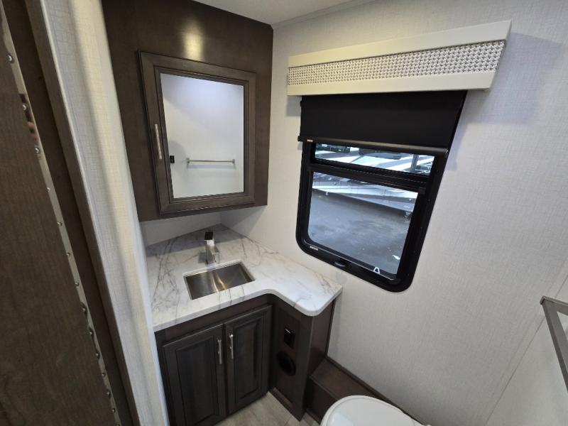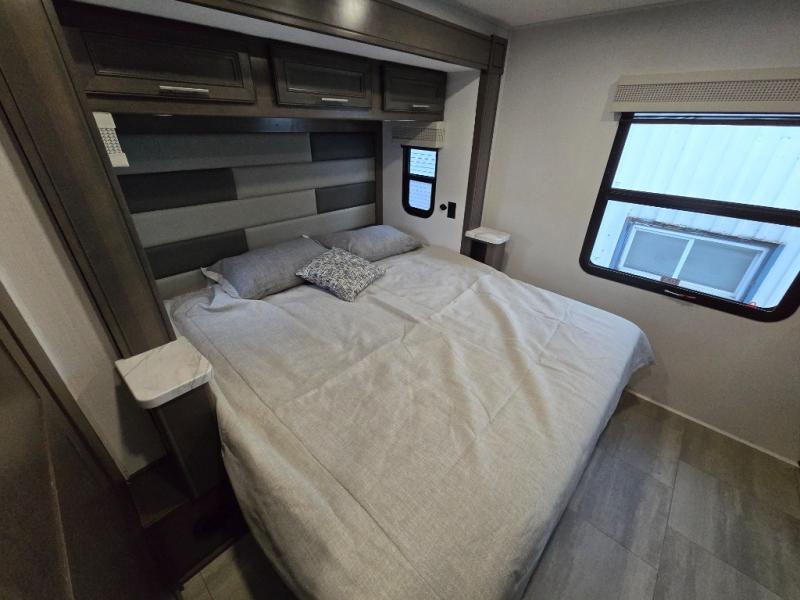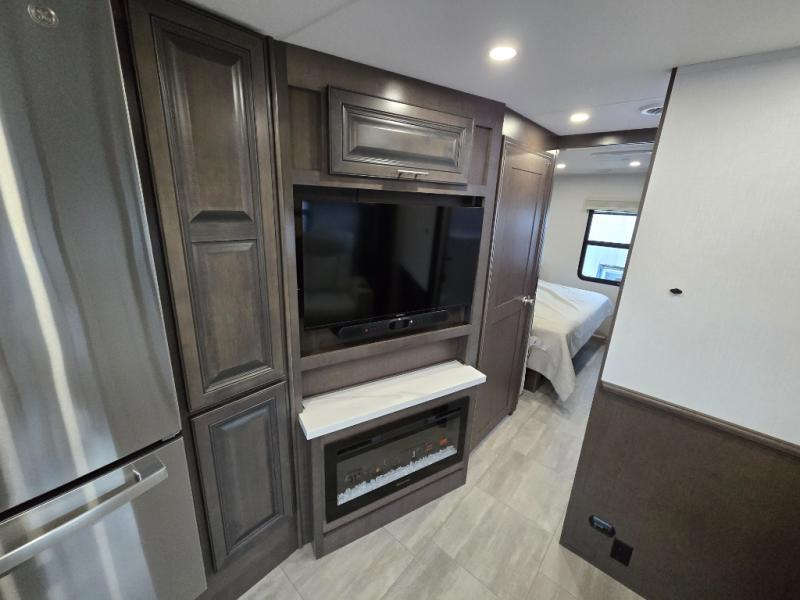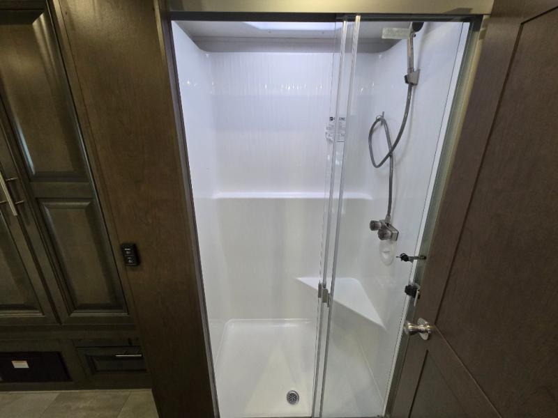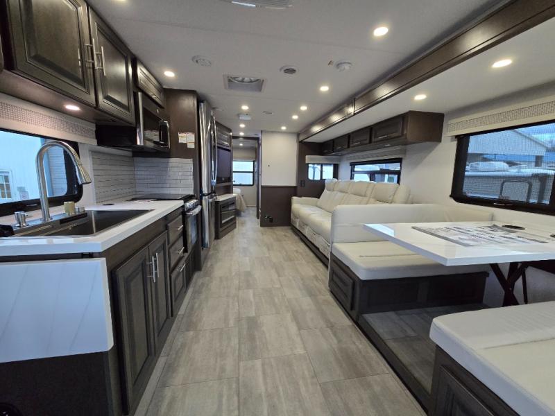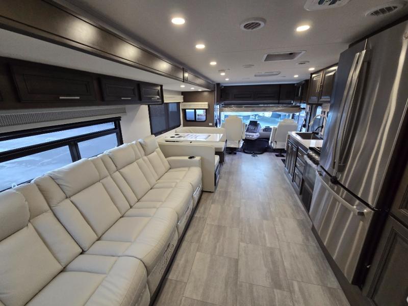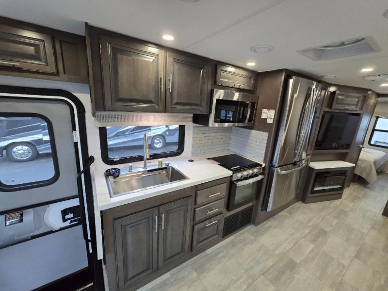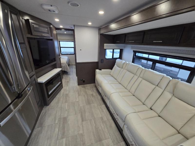 You will love the spacious living entertainment in this motorhome! There is a Thomas Payne 4-person theater seating that reclines with adjustable headrests, heat, massage and has USB outlets. There is also a 5,000 BTU fireplace with a 40" LED TV to watch your favorite movies in true comfort. The kitchen has everything you need to prepare your best home cooked meals including a brush nickel designer faucet with a pull-out spray wand for easy clean up, and you can enjoy all of your meals at the Dream Dinette. You will appreciate having your own private retreat with the rear bedroom which has a 72" x 80" king bed slide across from a dresser with a 32" LED TV, a wardrobe on one side, and another wardrobe on the other with an optional combo washer and dryer. There is also a power front overhead bunk for more sleeping space!