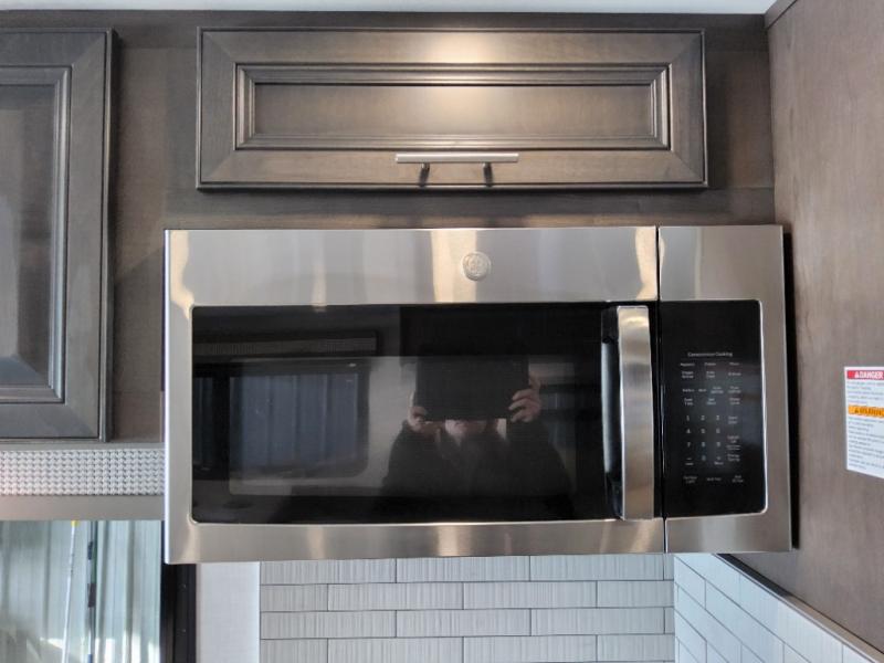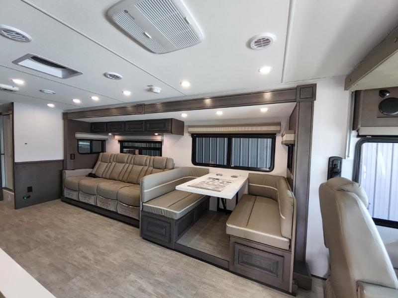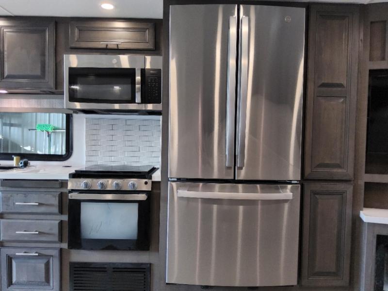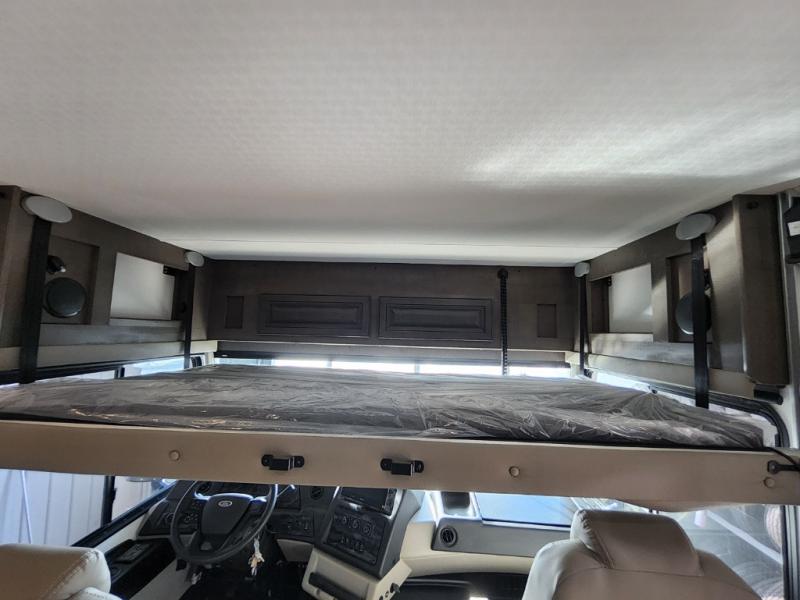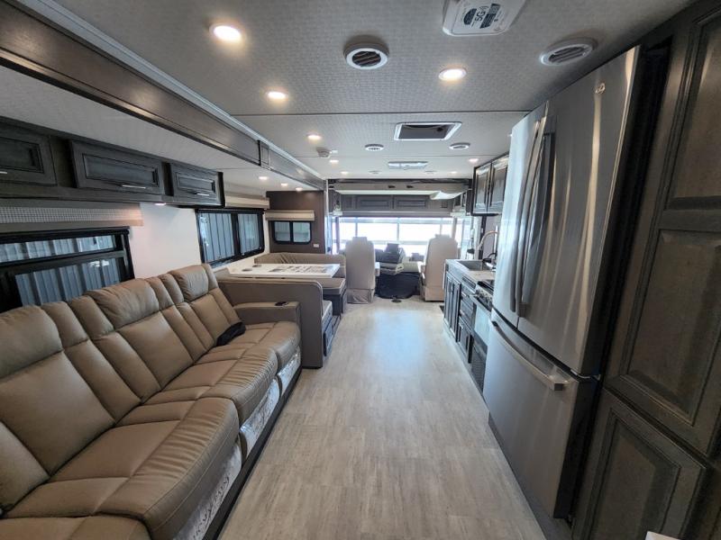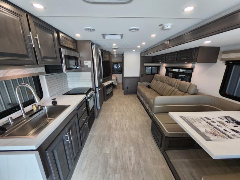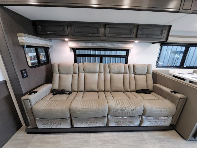 You will love the spacious living entertainment in this motorhome! There is a Thomas Payne 4-person theater seating that reclines with adjustable headrests, heat, massage and has USB outlets. There is also a 5,000 BTU fireplace with a 40" LED TV to watch your favorite movies in true comfort. The kitchen has everything you need to prepare your best home cooked meals including a brush nickel designer faucet with a pull-out spray wand for easy clean up, and you can enjoy all of your meals at the Dream Dinette. You will appreciate having your own private retreat with the rear bedroom which has a 72" x 80" king bed slide across from a dresser with a 32" LED TV, a wardrobe on one side, and another wardrobe on the other with an optional combo washer and dryer. There is also a power front overhead bunk for more sleeping space!