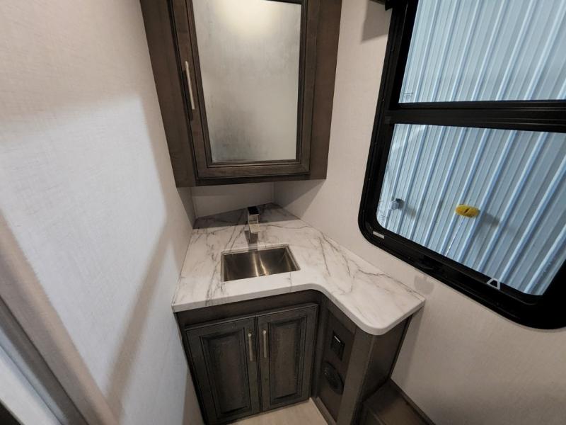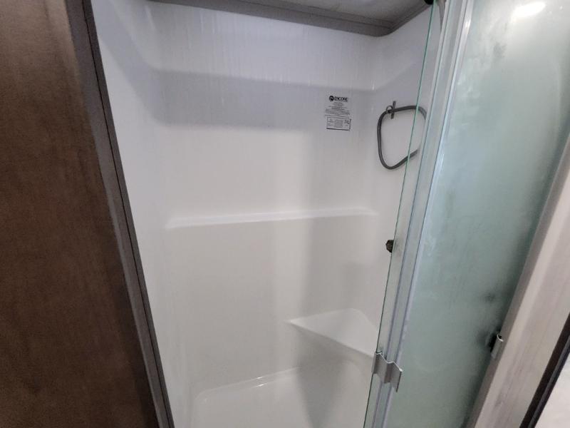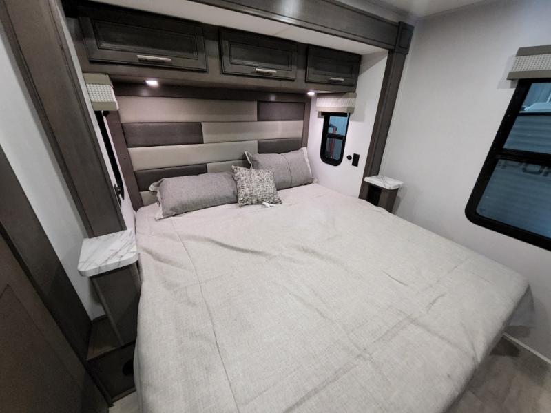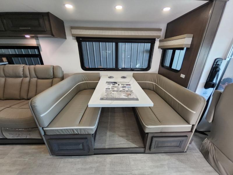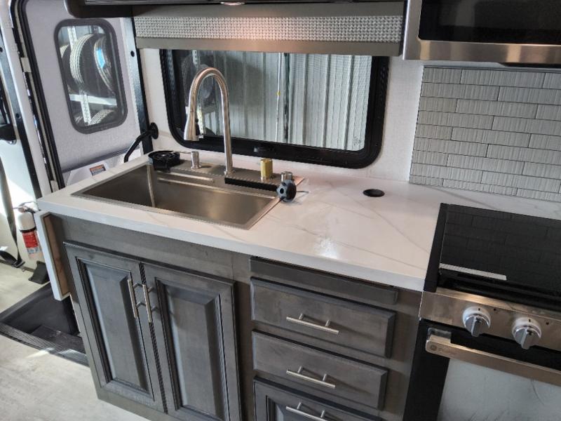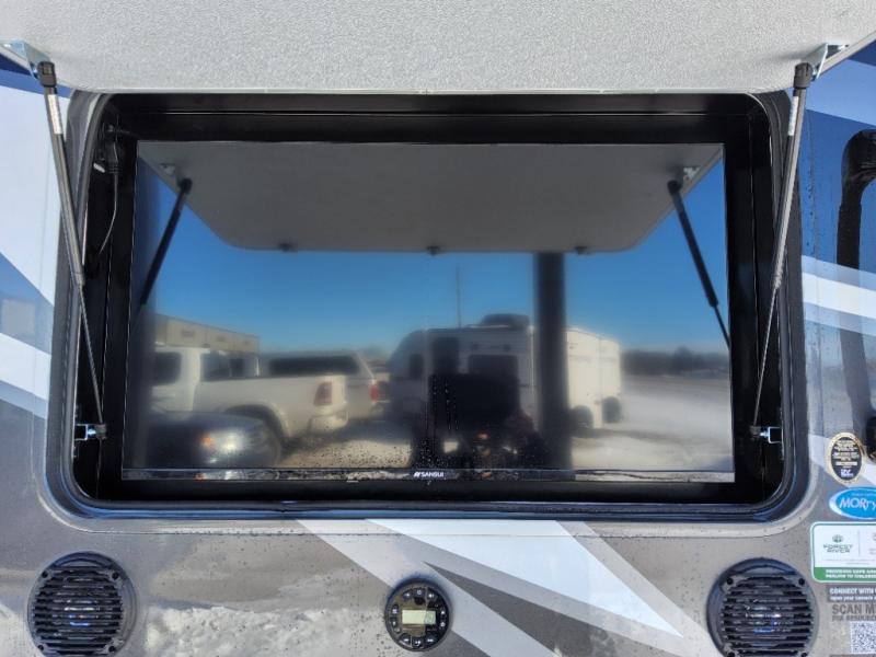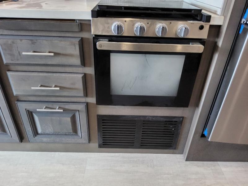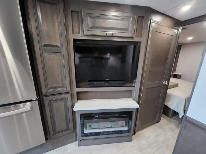 You will love the spacious living entertainment in this motorhome! There is a Thomas Payne 4-person theater seating that reclines with adjustable headrests, heat, massage and has USB outlets. There is also a 5,000 BTU fireplace with a 40" LED TV to watch your favorite movies in true comfort. The kitchen has everything you need to prepare your best home cooked meals including a brush nickel designer faucet with a pull-out spray wand for easy clean up, and you can enjoy all of your meals at the Dream Dinette. You will appreciate having your own private retreat with the rear bedroom which has a 72" x 80" king bed slide across from a dresser with a 32" LED TV, a wardrobe on one side, and another wardrobe on the other with an optional combo washer and dryer. There is also a power front overhead bunk for more sleeping space!