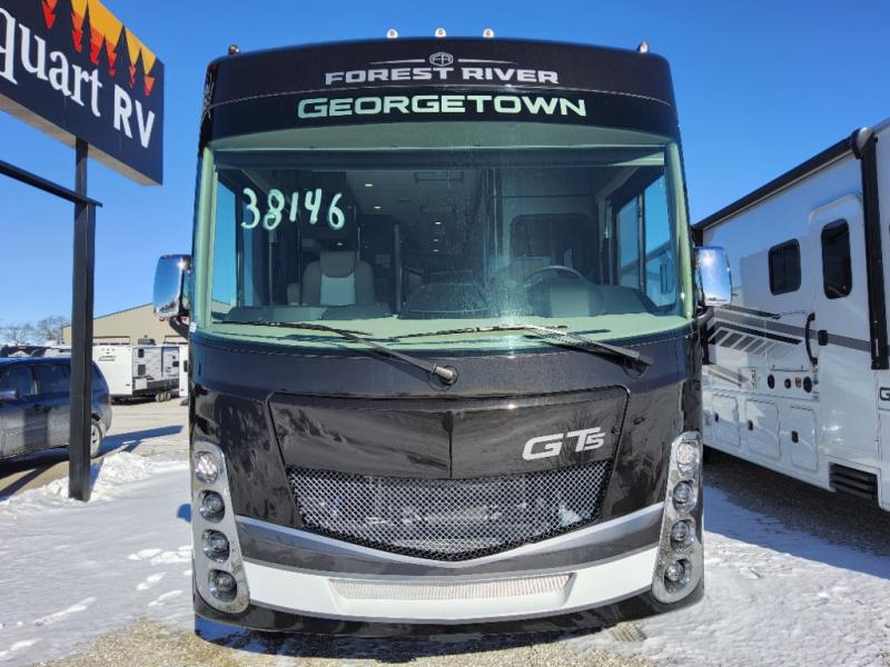 A spacious design and true luxury come together to create these Forest River Georgetown 5 Series Class A gas motorhomes! Their solid surface kitchen countertops, day and night shades throughout, and designer bedspread will have you feeling right at home. The color side and rear cameras help to prevent any dings or bumps while you travel, and the automatic hydraulic leveling jacks will keep your unit leveled wherever you set up. Durable construction consists of a crowned roof, 2" aluminum framed vacuum bonded gel coated sidewalls, plus high density block foam insulation that will allow you to travel at any time of the year. You will appreciate the 50 Amp service, two house batteries, and 6,000-watt Yamaha generator to keep you powered up. An outside shower is also included on all models, along with rotocast storage compartments with drains, a power awning, and so much more!
