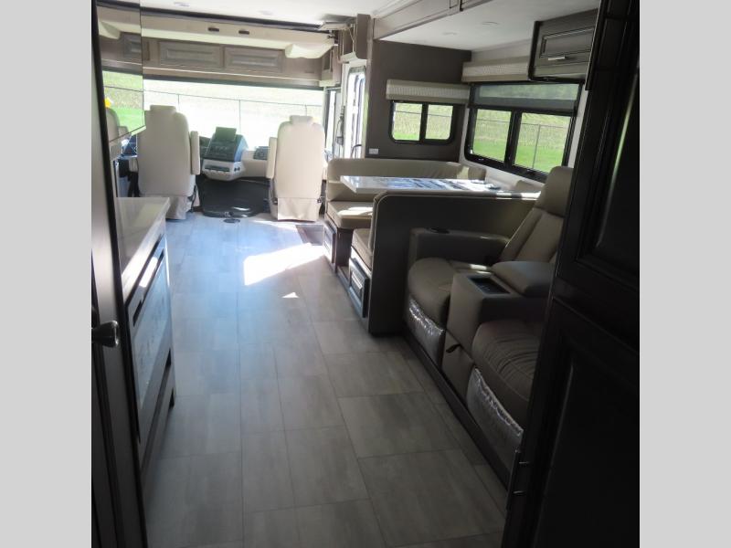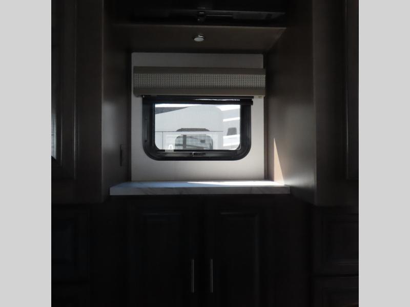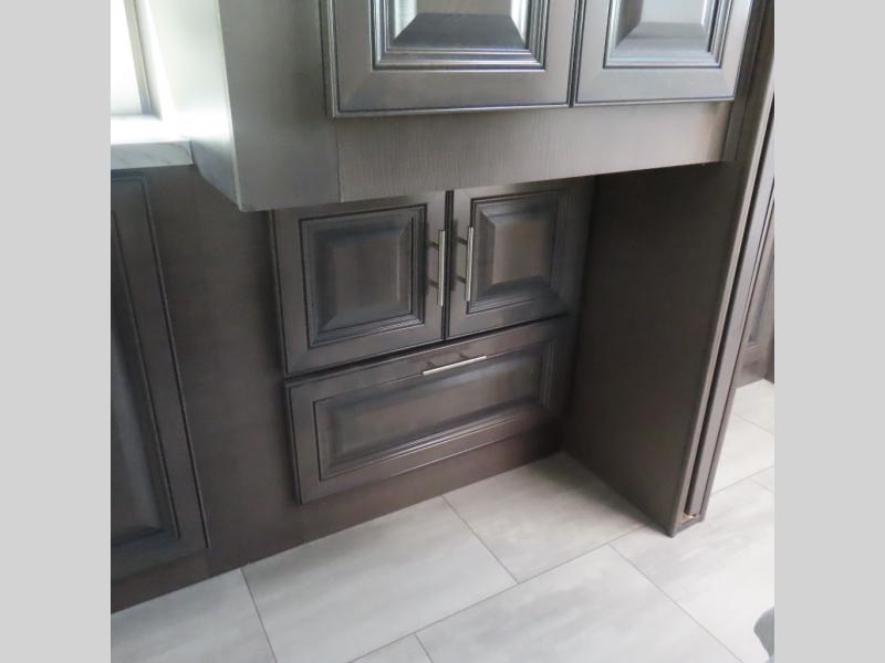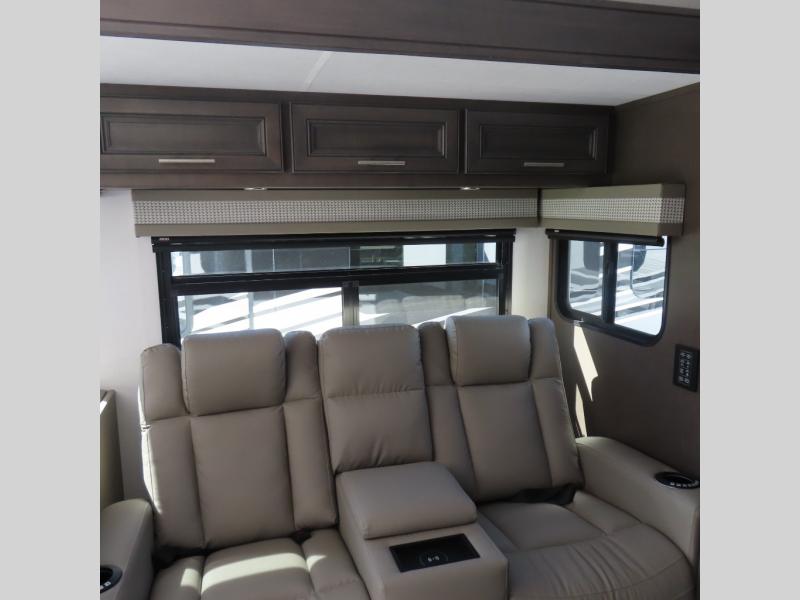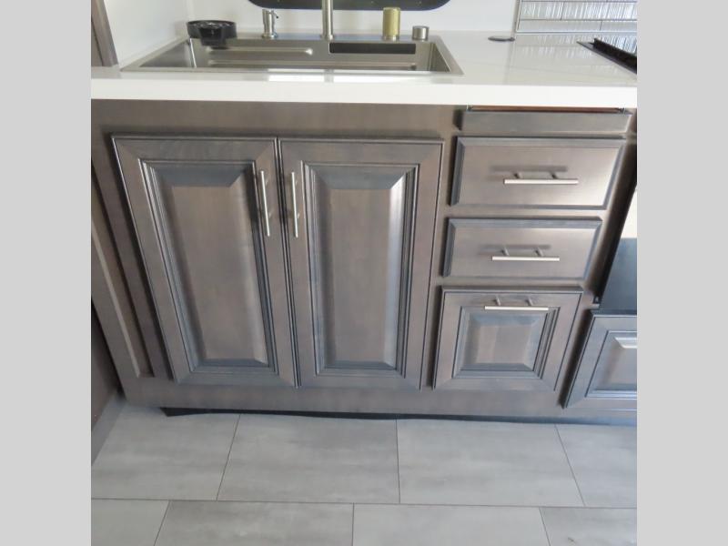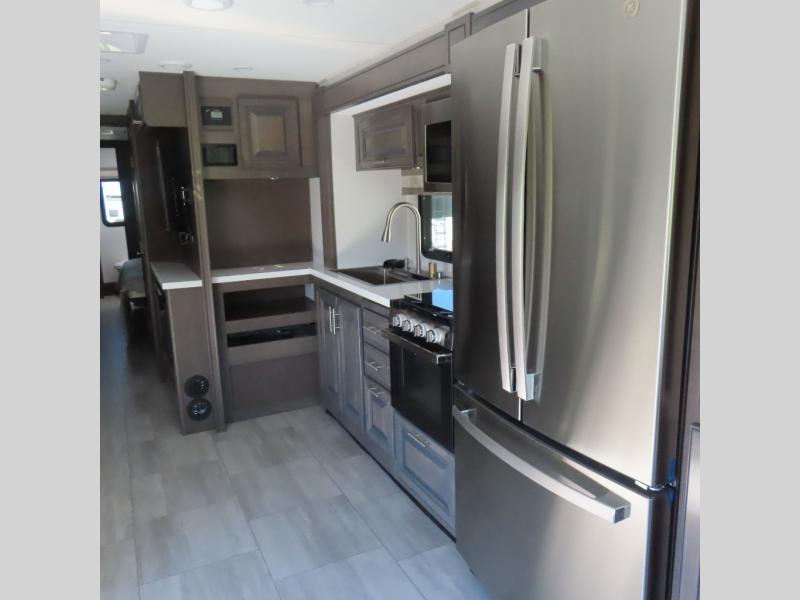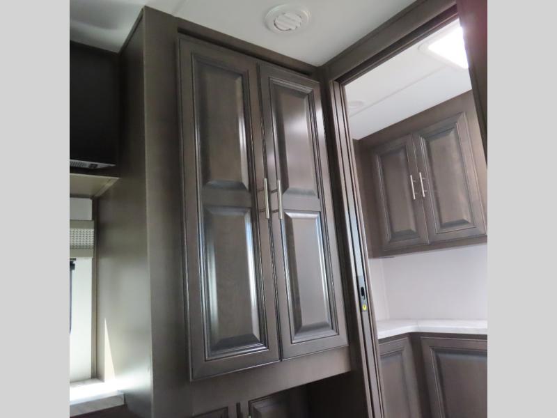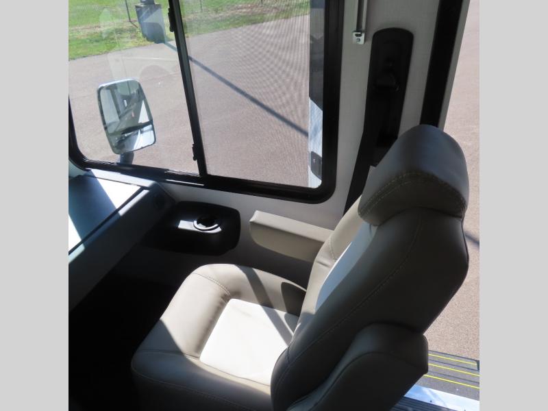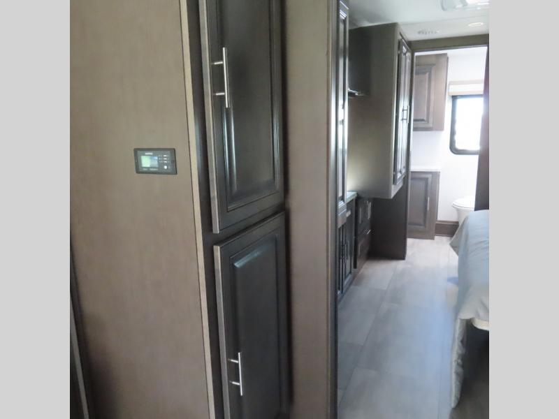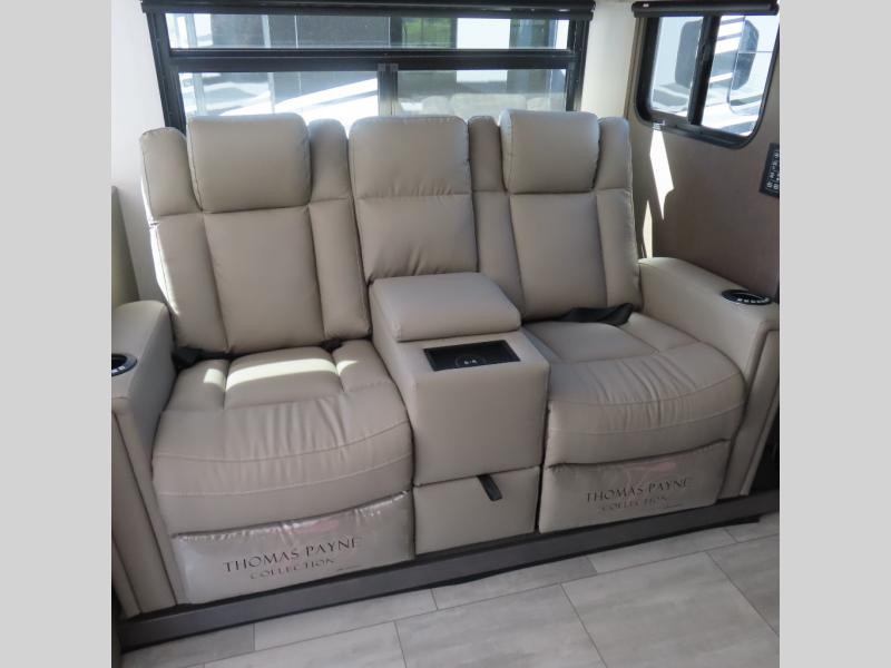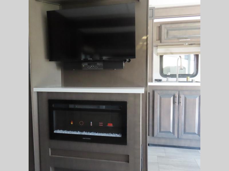 Three slides help to open up this motorhome! The kitchen slide features all of your essentials for cooking delicious meals and you even have a hutch with overhead cabinets to store all of your dishes. The Dream Dinette and Thomas Payne theater seating slide not only open up the living area but also provide comfortable places to eat meals and unwind in front of the 5,000 BTU fireplace and 40" LED TV after a long day of traveling. The half bathroom is close to the kitchen and living area, so you don't have to go far for a quick bathroom break. The master suite will have you feeling right at home with a 72" x 80" king bed slide to lay your head on at night with a dresser across from it that also has a 32" LED TV and wardrobes on either side of it with one of them with an optional washer and dryer. Plus, you even have access to the full rear bathroom which has a shower with a seat to freshen up in each morning!