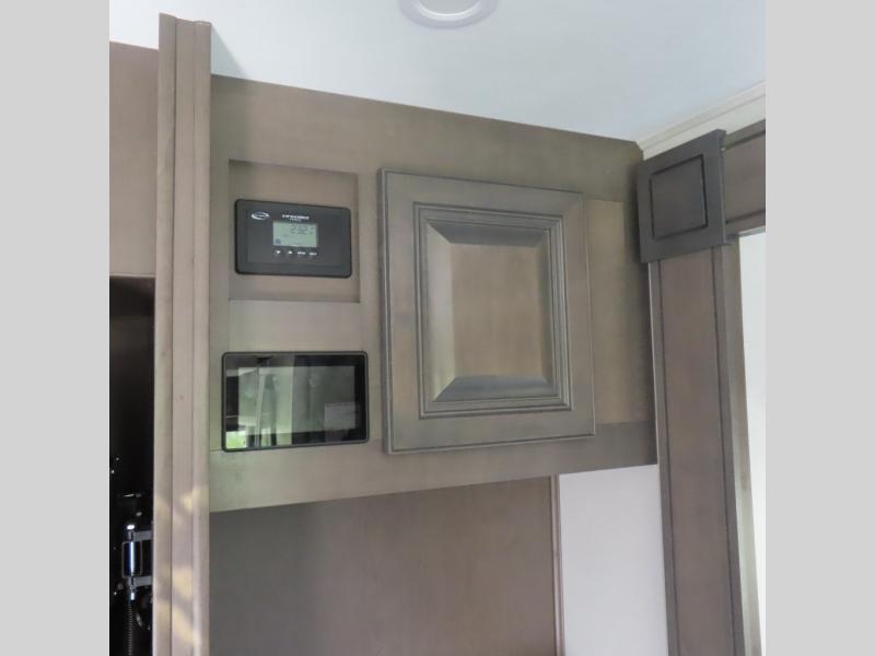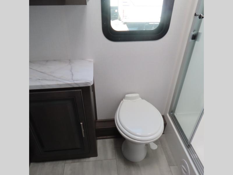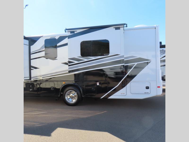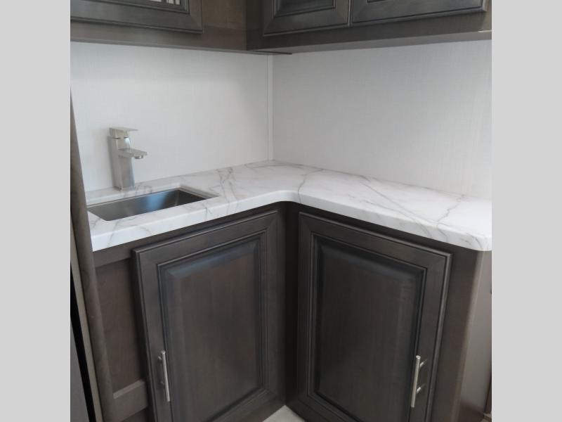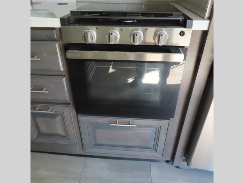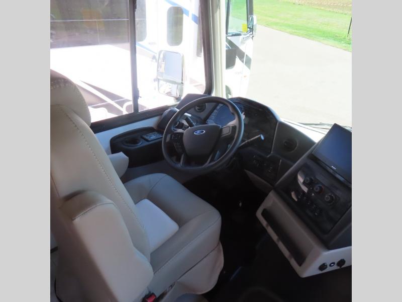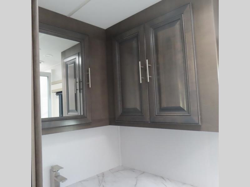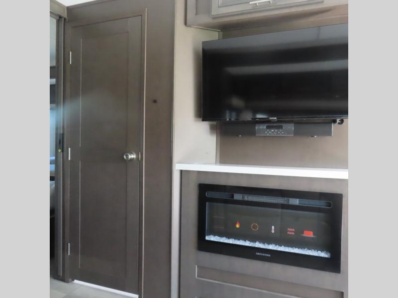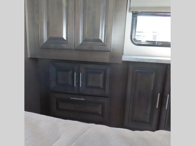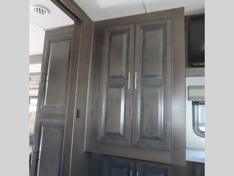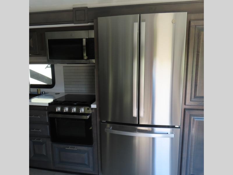 Three slides help to open up this motorhome! The kitchen slide features all of your essentials for cooking delicious meals and you even have a hutch with overhead cabinets to store all of your dishes. The Dream Dinette and Thomas Payne theater seating slide not only open up the living area but also provide comfortable places to eat meals and unwind in front of the 5,000 BTU fireplace and 40" LED TV after a long day of traveling. The half bathroom is close to the kitchen and living area, so you don't have to go far for a quick bathroom break. The master suite will have you feeling right at home with a 72" x 80" king bed slide to lay your head on at night with a dresser across from it that also has a 32" LED TV and wardrobes on either side of it with one of them with an optional washer and dryer. Plus, you even have access to the full rear bathroom which has a shower with a seat to freshen up in each morning!