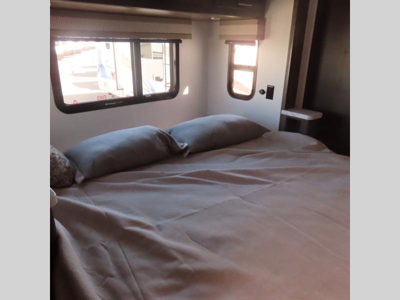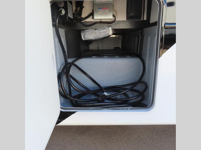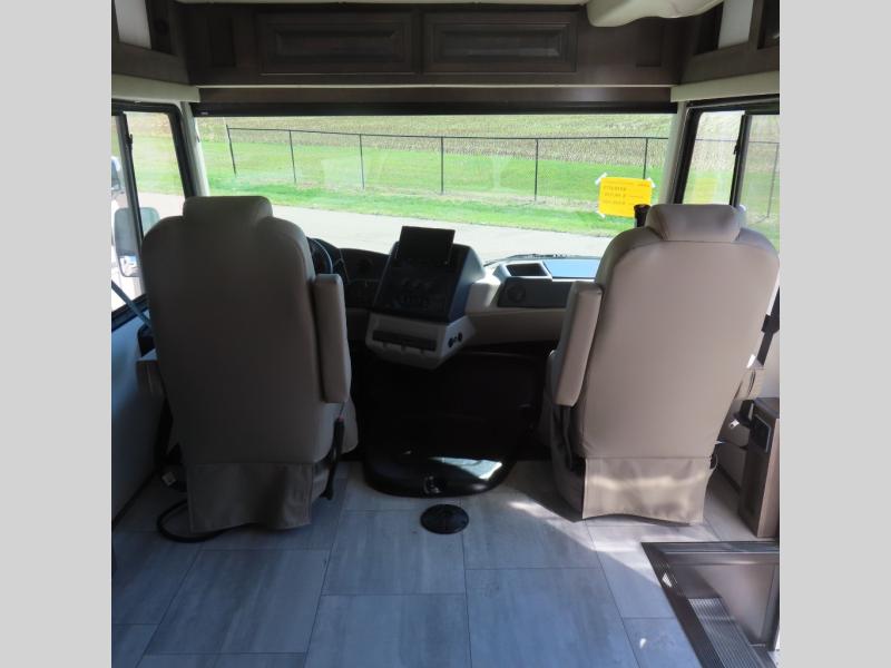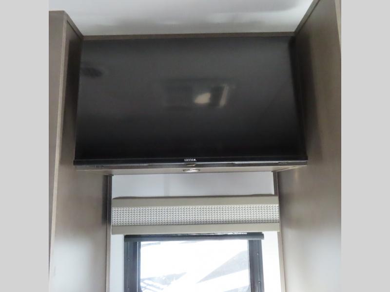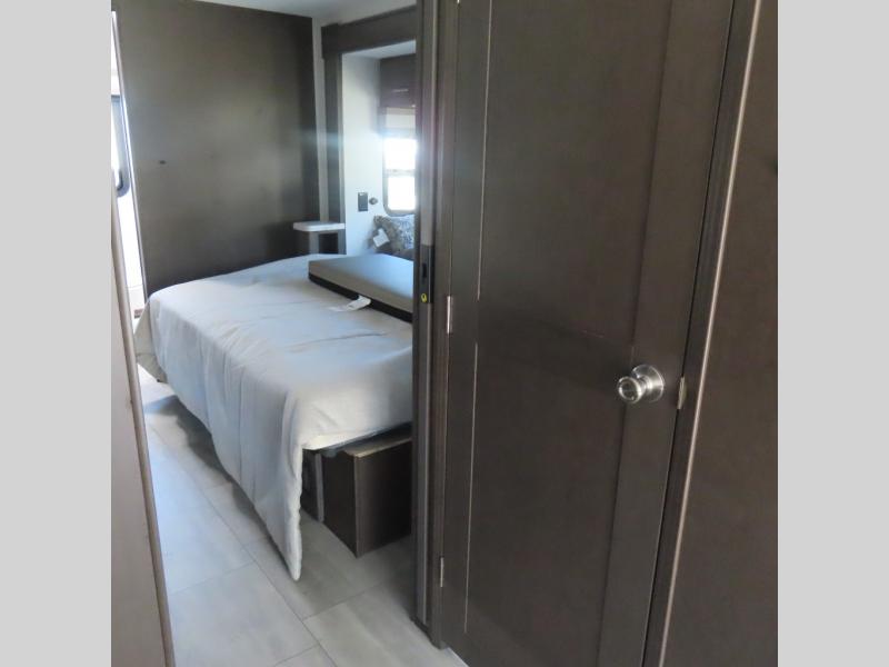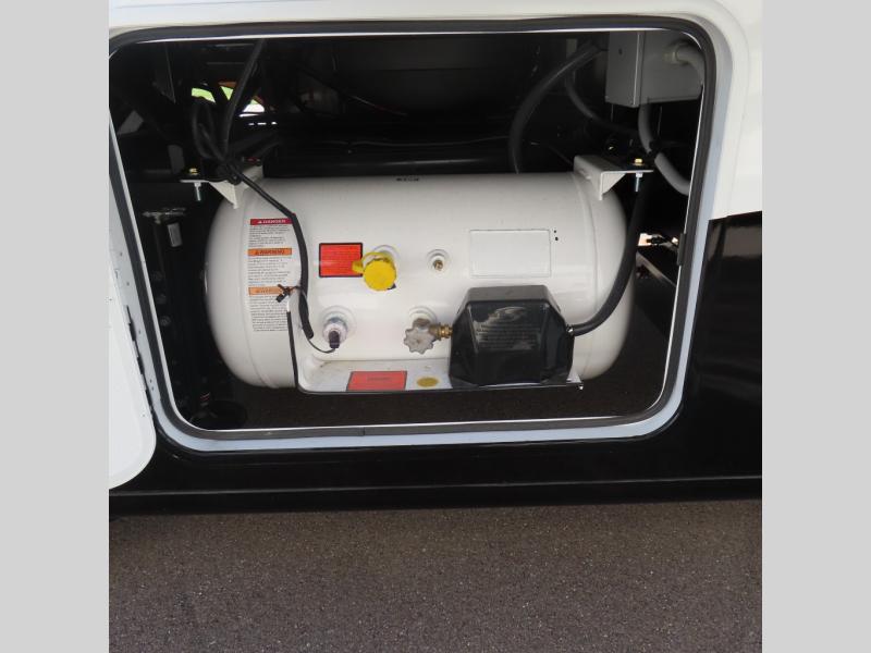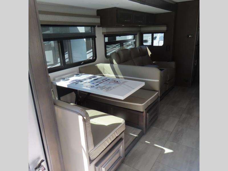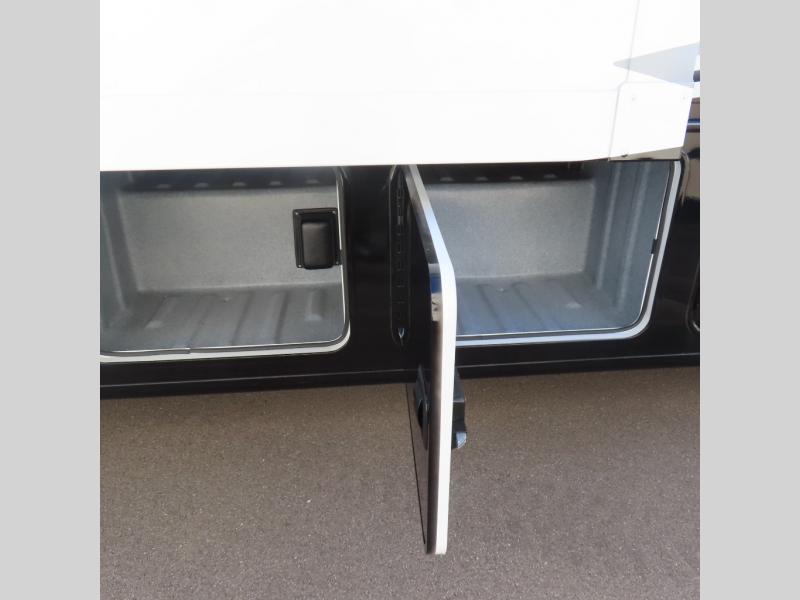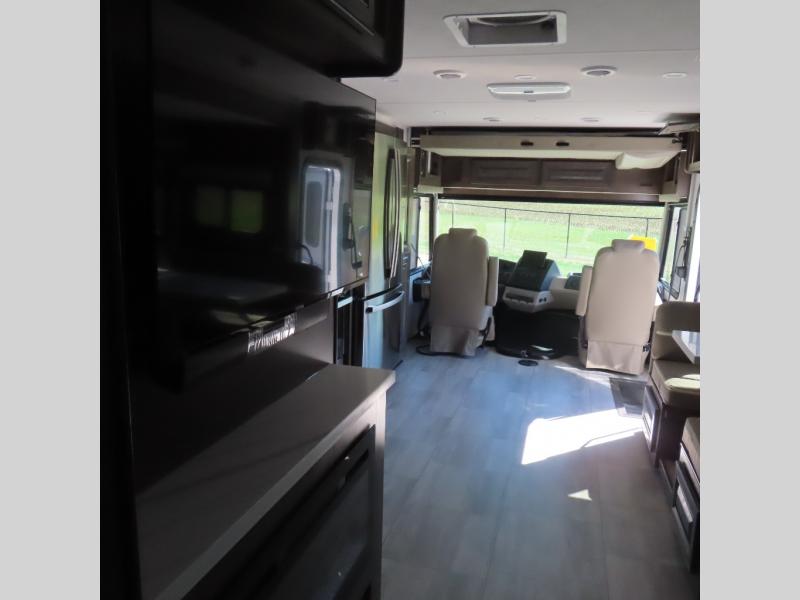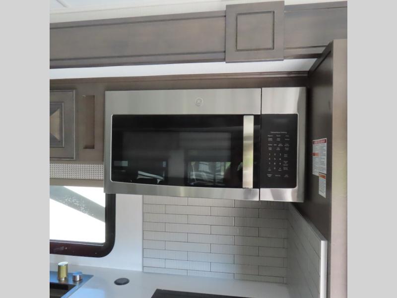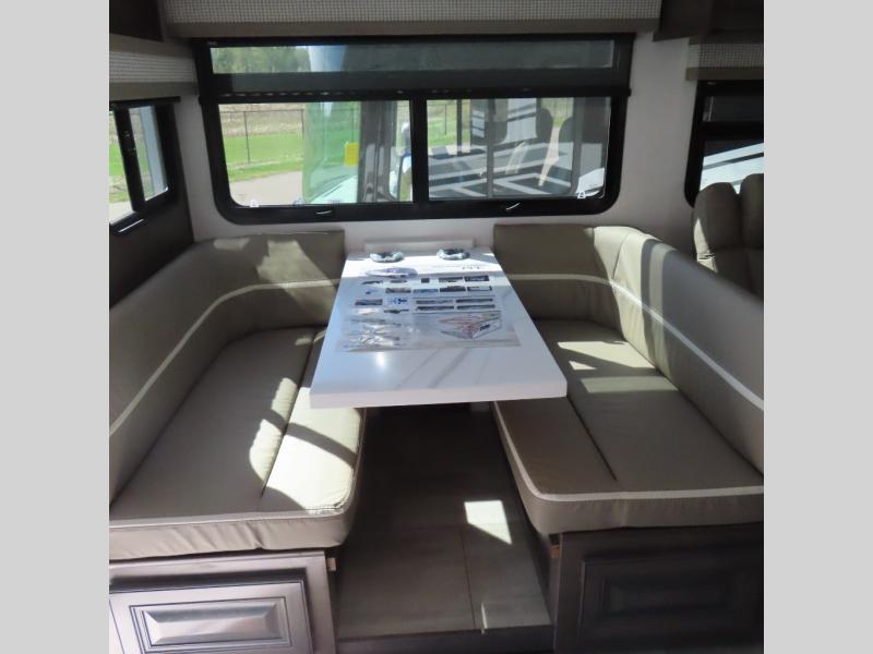 Three slides help to open up this motorhome! The kitchen slide features all of your essentials for cooking delicious meals and you even have a hutch with overhead cabinets to store all of your dishes. The Dream Dinette and Thomas Payne theater seating slide not only open up the living area but also provide comfortable places to eat meals and unwind in front of the 5,000 BTU fireplace and 40" LED TV after a long day of traveling. The half bathroom is close to the kitchen and living area, so you don't have to go far for a quick bathroom break. The master suite will have you feeling right at home with a 72" x 80" king bed slide to lay your head on at night with a dresser across from it that also has a 32" LED TV and wardrobes on either side of it with one of them with an optional washer and dryer. Plus, you even have access to the full rear bathroom which has a shower with a seat to freshen up in each morning!