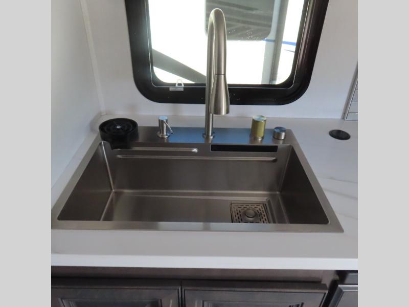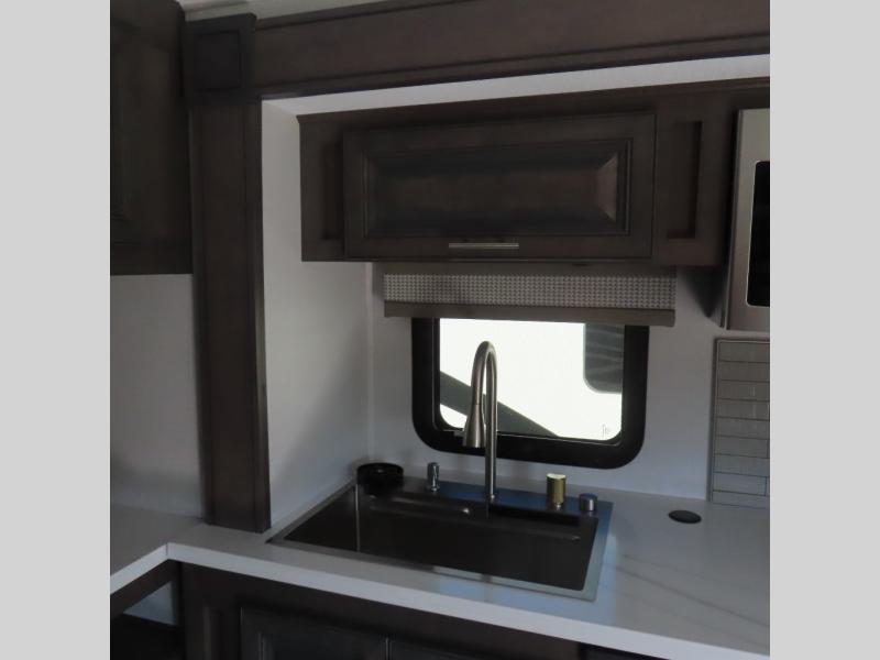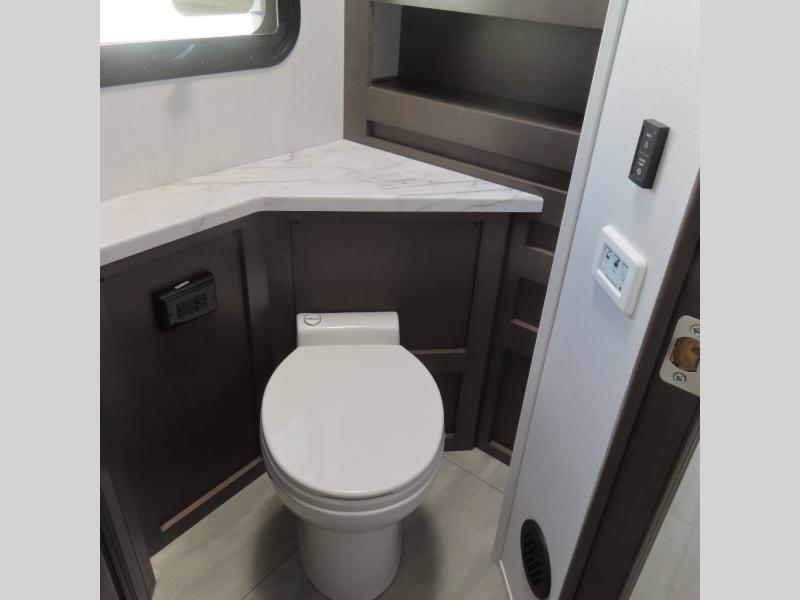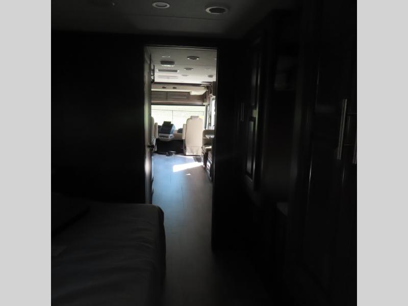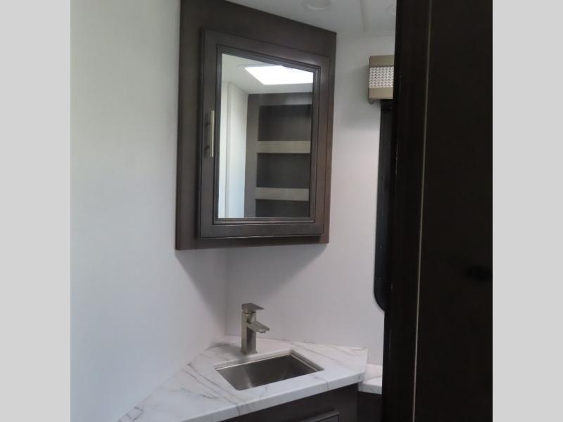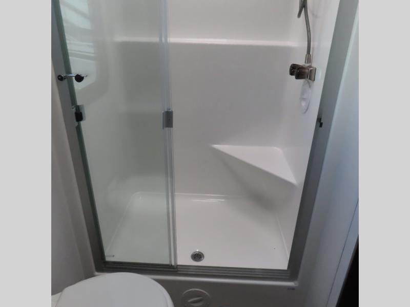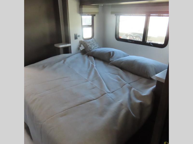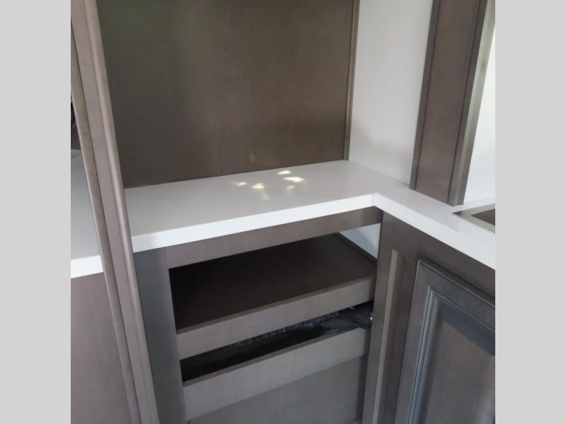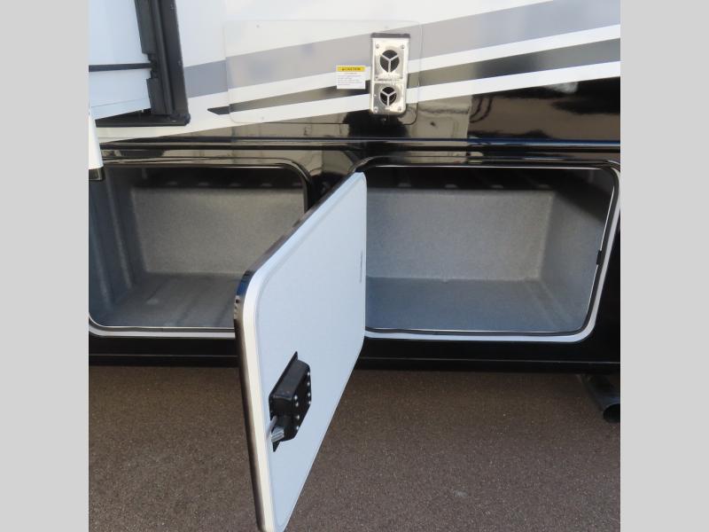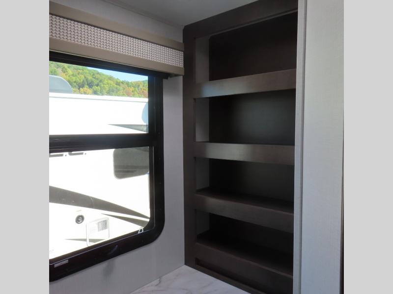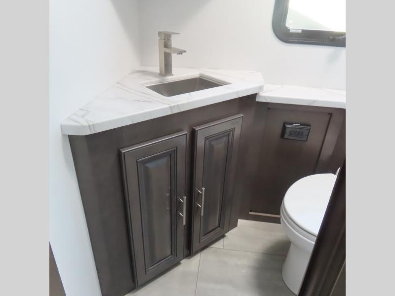 Three slides help to open up this motorhome! The kitchen slide features all of your essentials for cooking delicious meals and you even have a hutch with overhead cabinets to store all of your dishes. The Dream Dinette and Thomas Payne theater seating slide not only open up the living area but also provide comfortable places to eat meals and unwind in front of the 5,000 BTU fireplace and 40" LED TV after a long day of traveling. The half bathroom is close to the kitchen and living area, so you don't have to go far for a quick bathroom break. The master suite will have you feeling right at home with a 72" x 80" king bed slide to lay your head on at night with a dresser across from it that also has a 32" LED TV and wardrobes on either side of it with one of them with an optional washer and dryer. Plus, you even have access to the full rear bathroom which has a shower with a seat to freshen up in each morning!