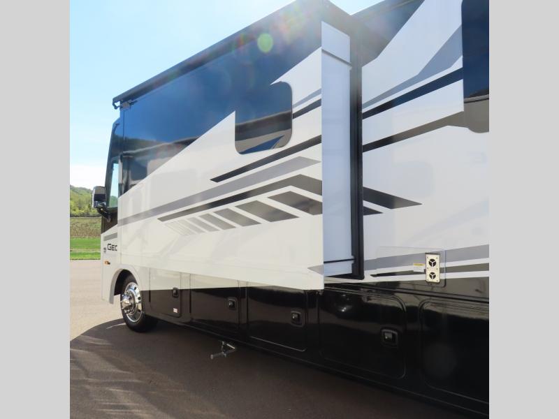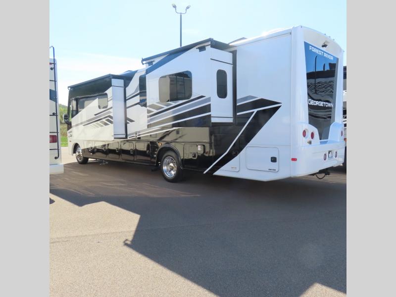 A spacious design and true luxury come together to create these Forest River Georgetown 5 Series Class A gas motorhomes! Their solid surface kitchen countertops, day and night shades throughout, and designer bedspread will have you feeling right at home. The color side and rear cameras help to prevent any dings or bumps while you travel, and the automatic hydraulic leveling jacks will keep your unit leveled wherever you set up. Durable construction consists of a crowned roof, 2" aluminum framed vacuum bonded gel coated sidewalls, plus high density block foam insulation that will allow you to travel at any time of the year. You will appreciate the 50 Amp service, two house batteries, and 6,000-watt Yamaha generator to keep you powered up. An outside shower is also included on all models, along with rotocast storage compartments with drains, a power awning, and so much more!